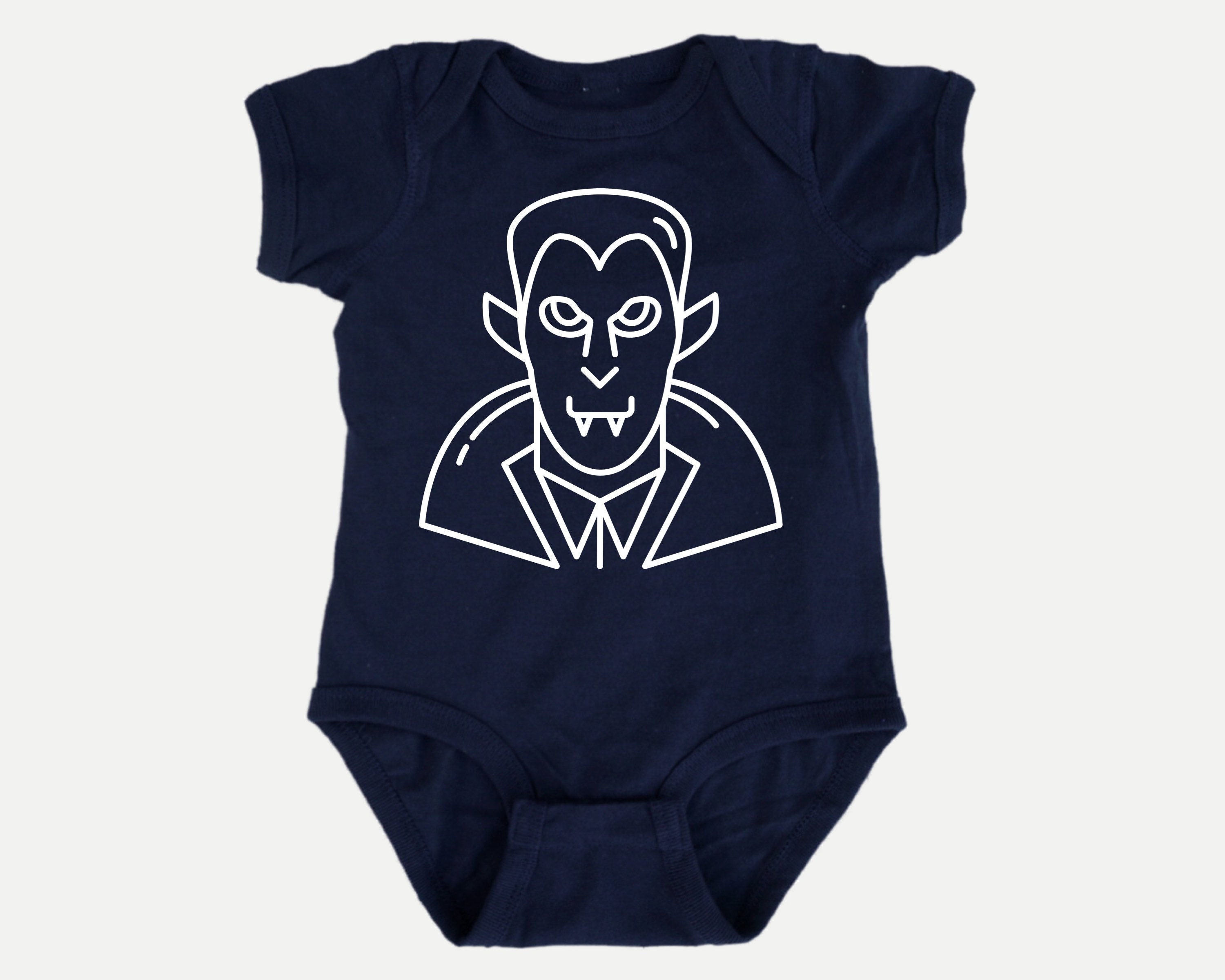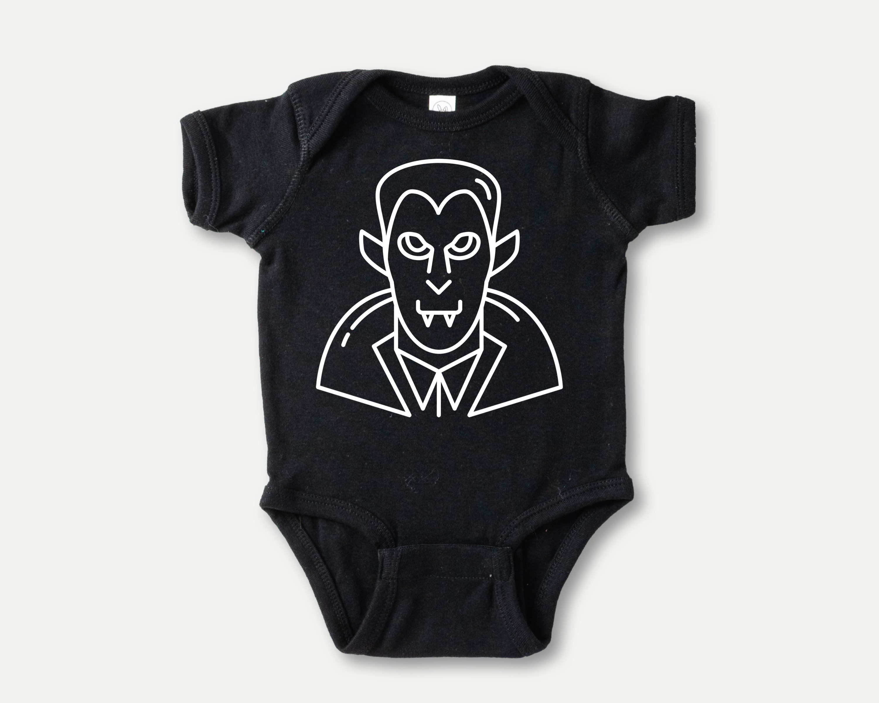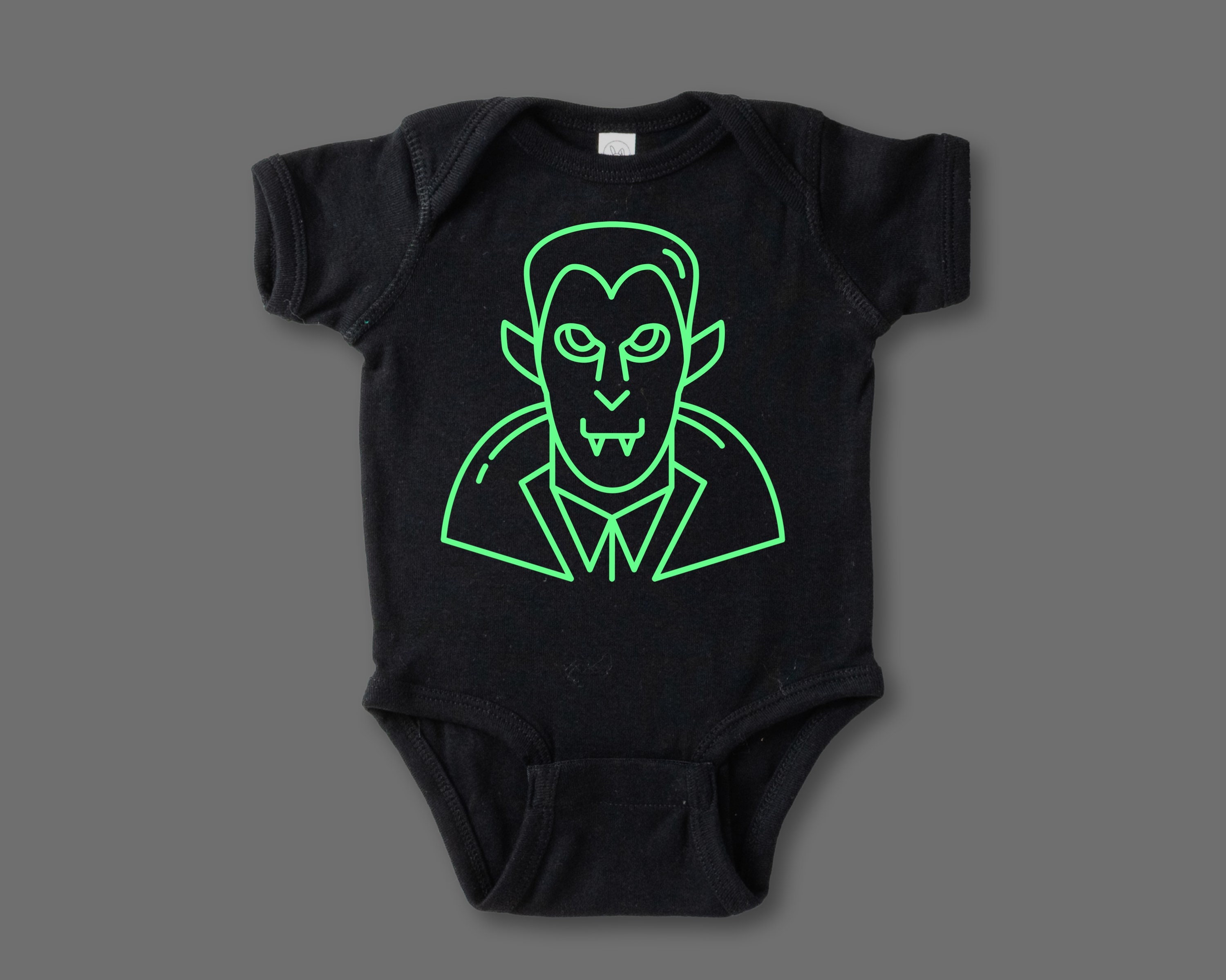 Glow in the dark baby's first Halloween infant bodysuit with a Dracula Vampire design. Take your little baby out for their first time trick or treating in a stylish glow in the dark soft style baby outfit. This halloween baby costume would be a perfect gift for a halloween baby shower. For families waiting to find out the gender, this gender neutral halloween outfit is sure to delight.