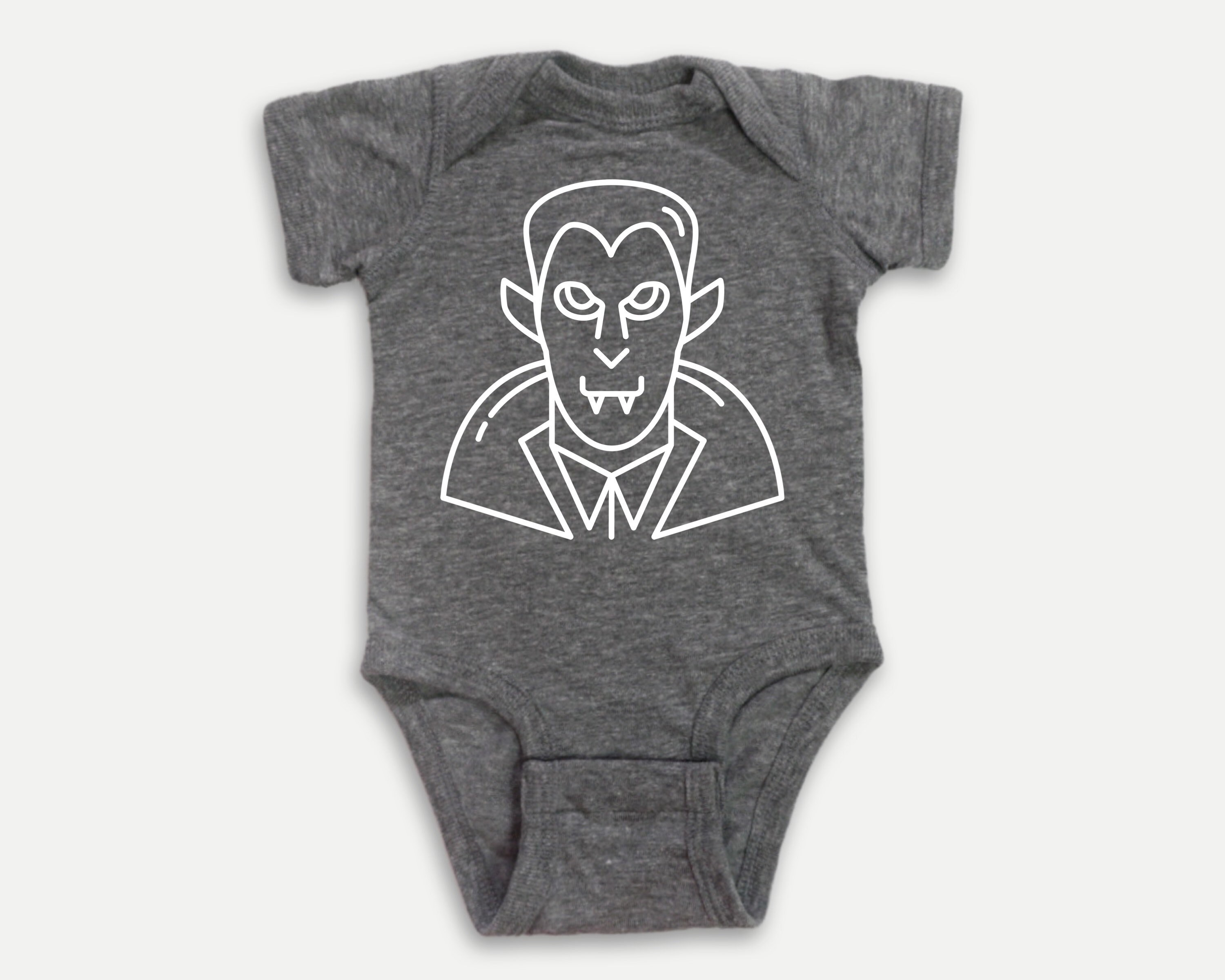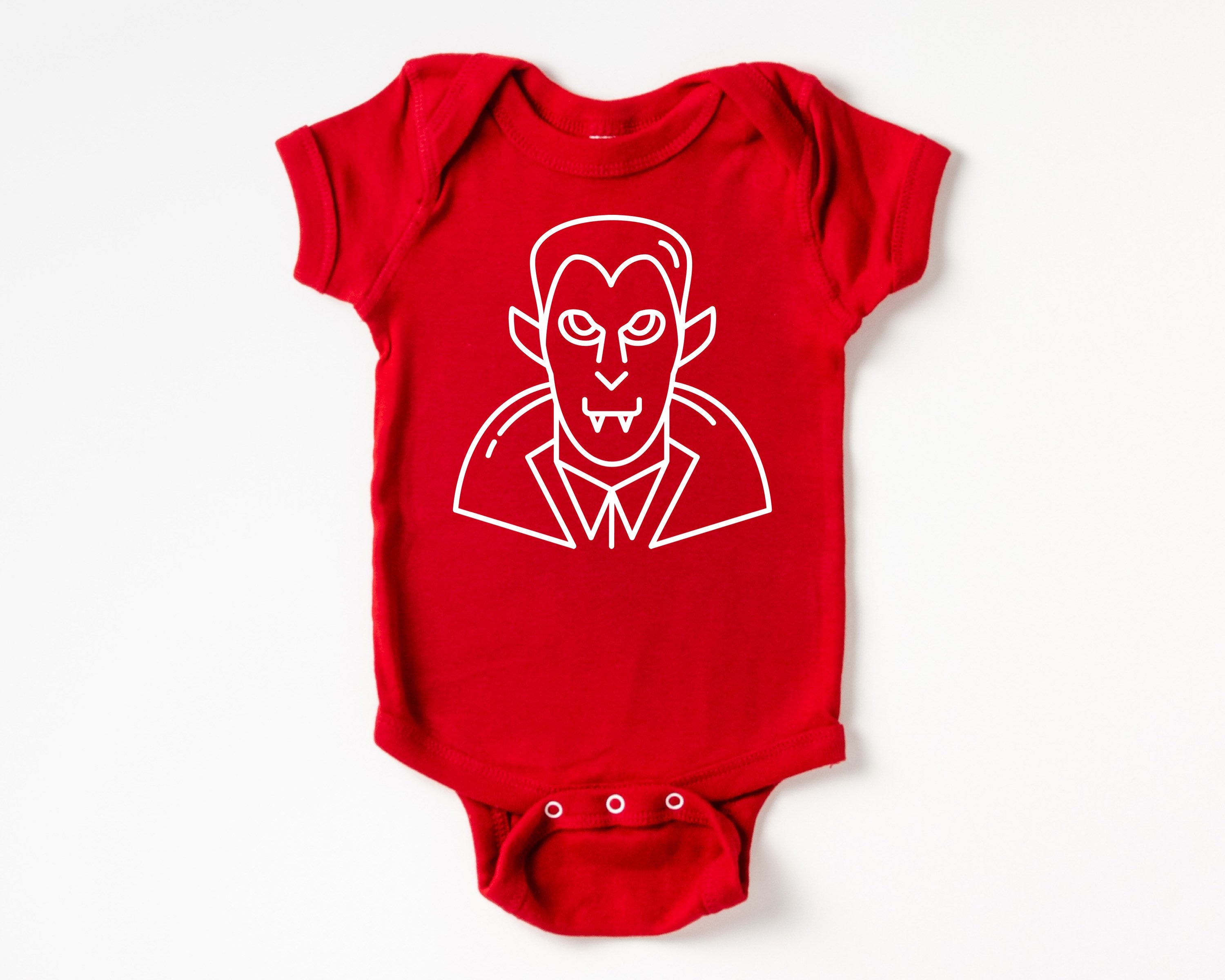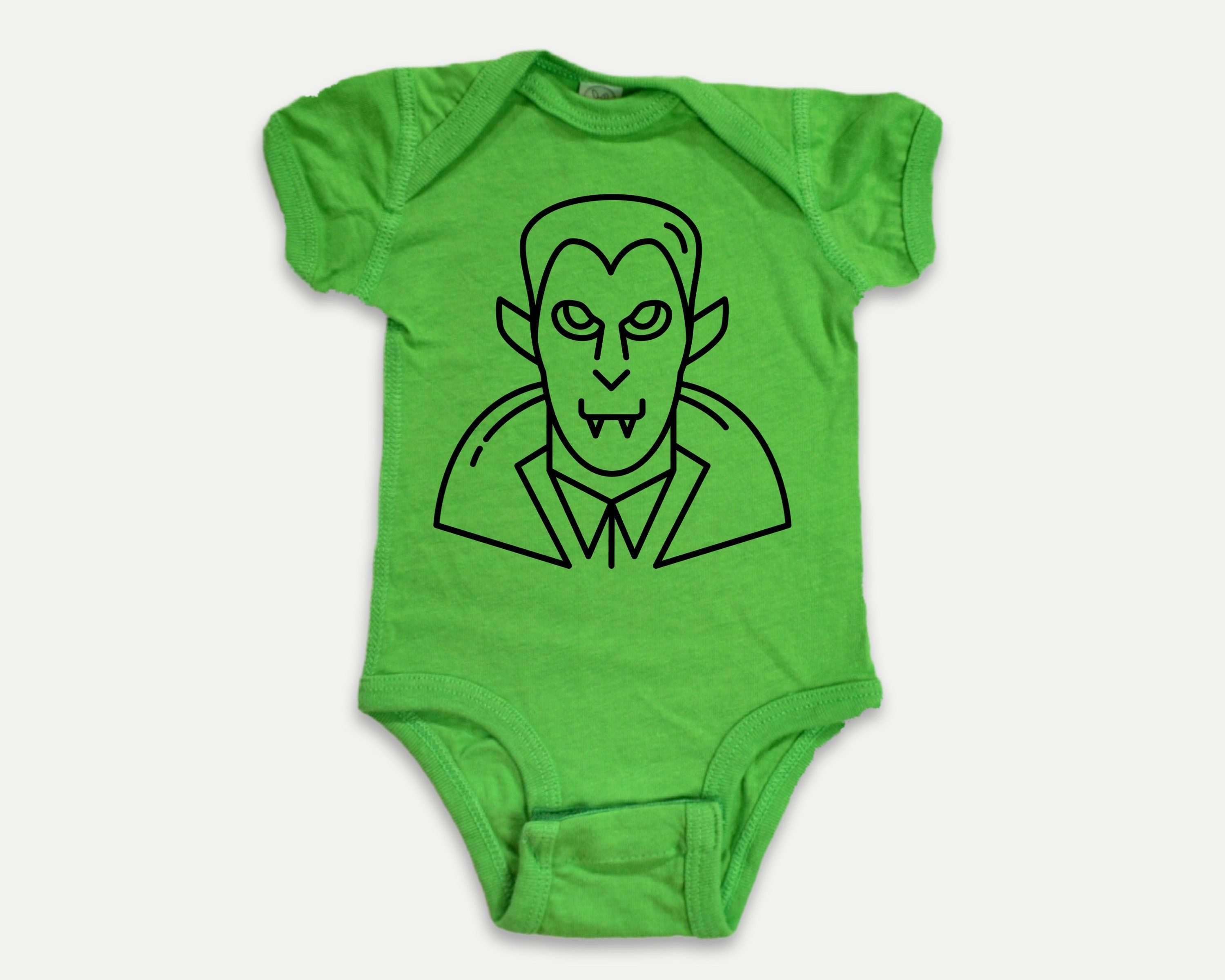 Glow in the dark baby's first Halloween infant bodysuit with a Dracula Vampire design. Take your little baby out for their first time trick or treating in a stylish glow in the dark soft style baby outfit. This halloween baby costume would be a perfect gift for a halloween baby shower. For families waiting to find out the gender, this gender neutral halloween outfit is sure to delight.
