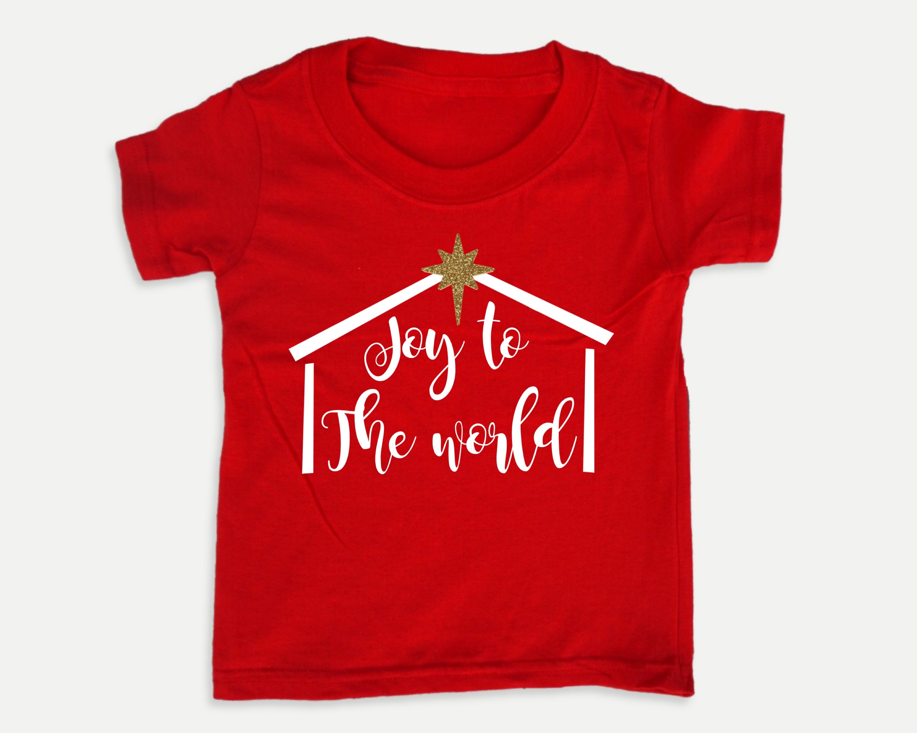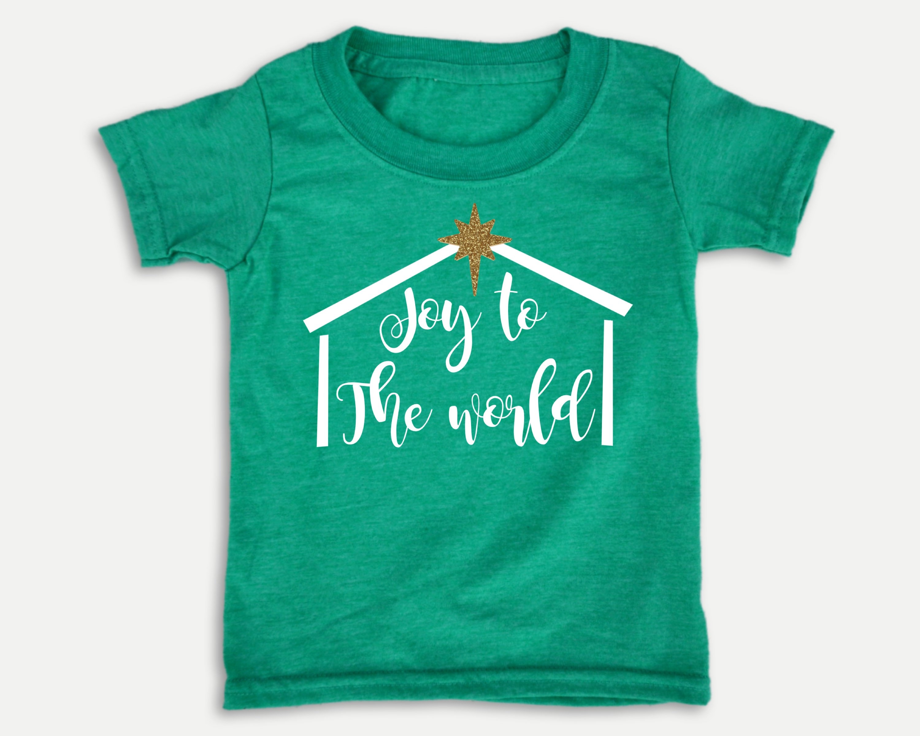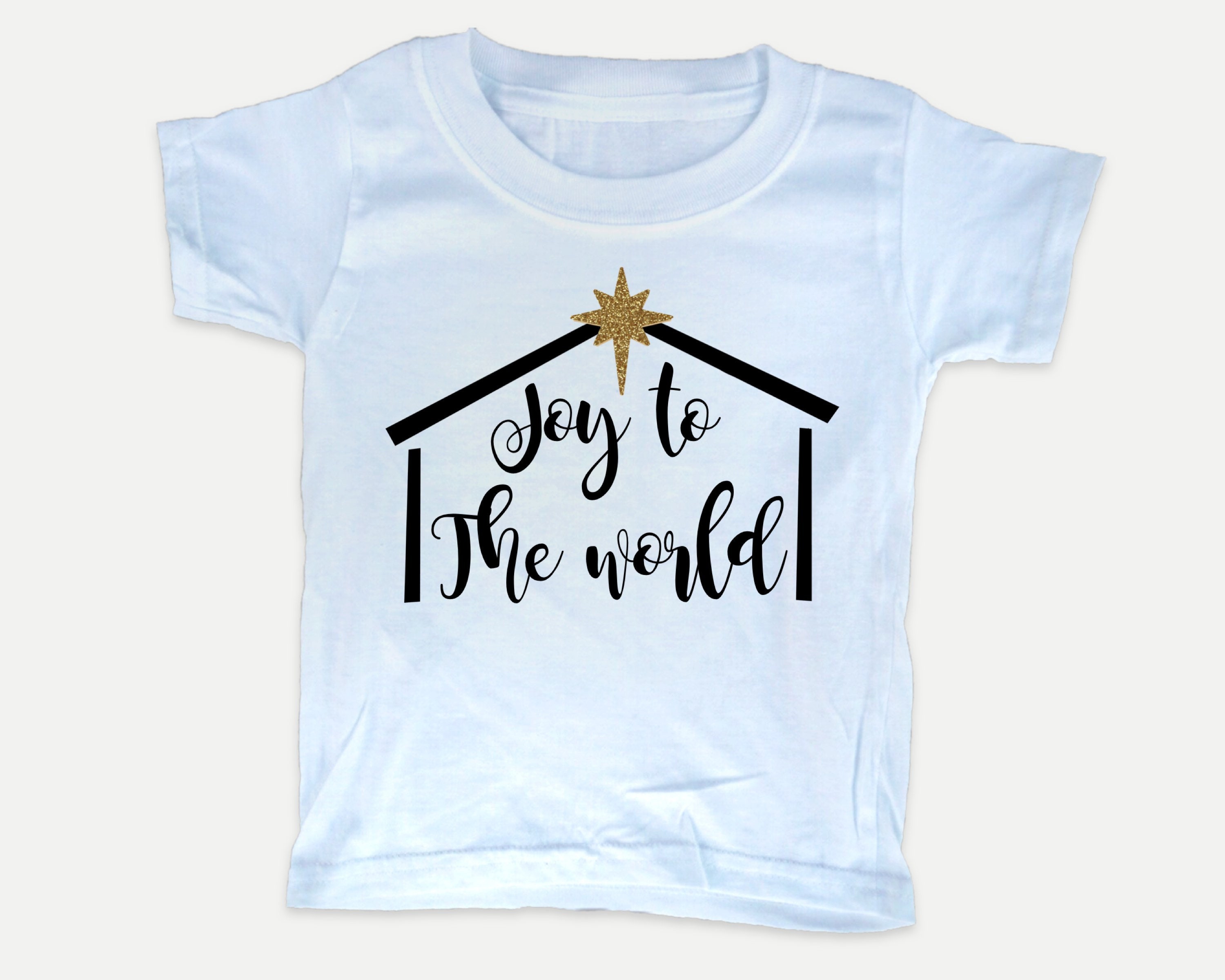 Soft cotton tshirt with a Joy to the World Nativity stable design in glitter and matte vinyl. A fun casual shirt for your kid to enjoy during the whole winter Christmas season.