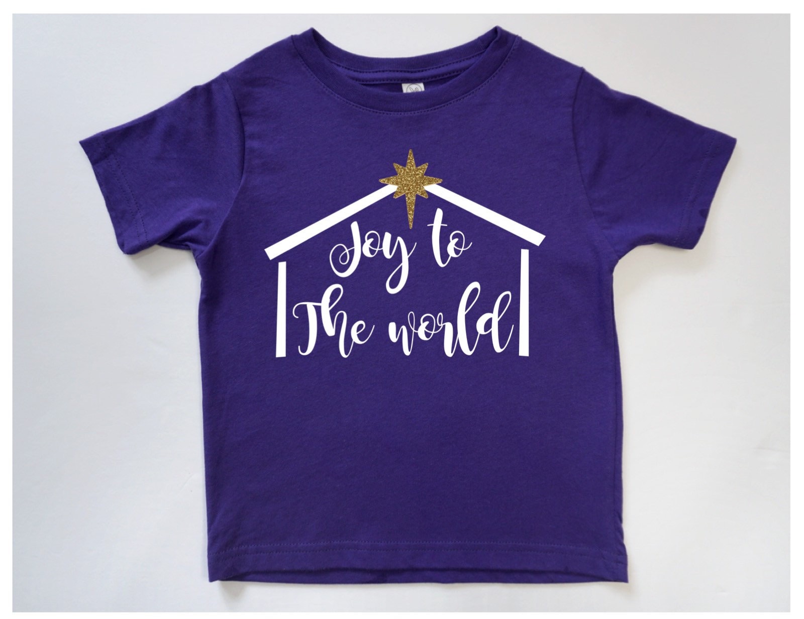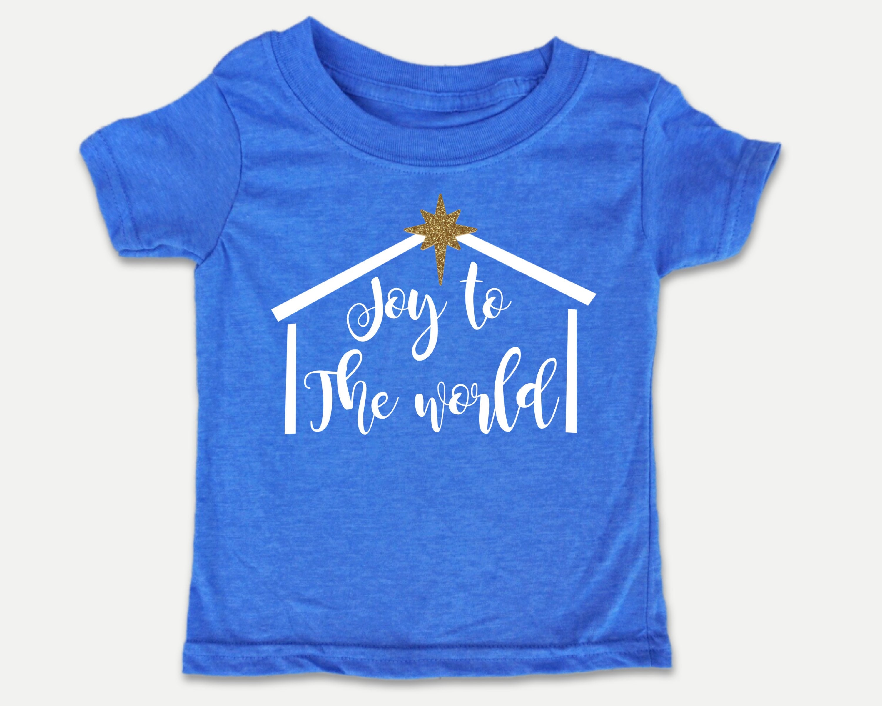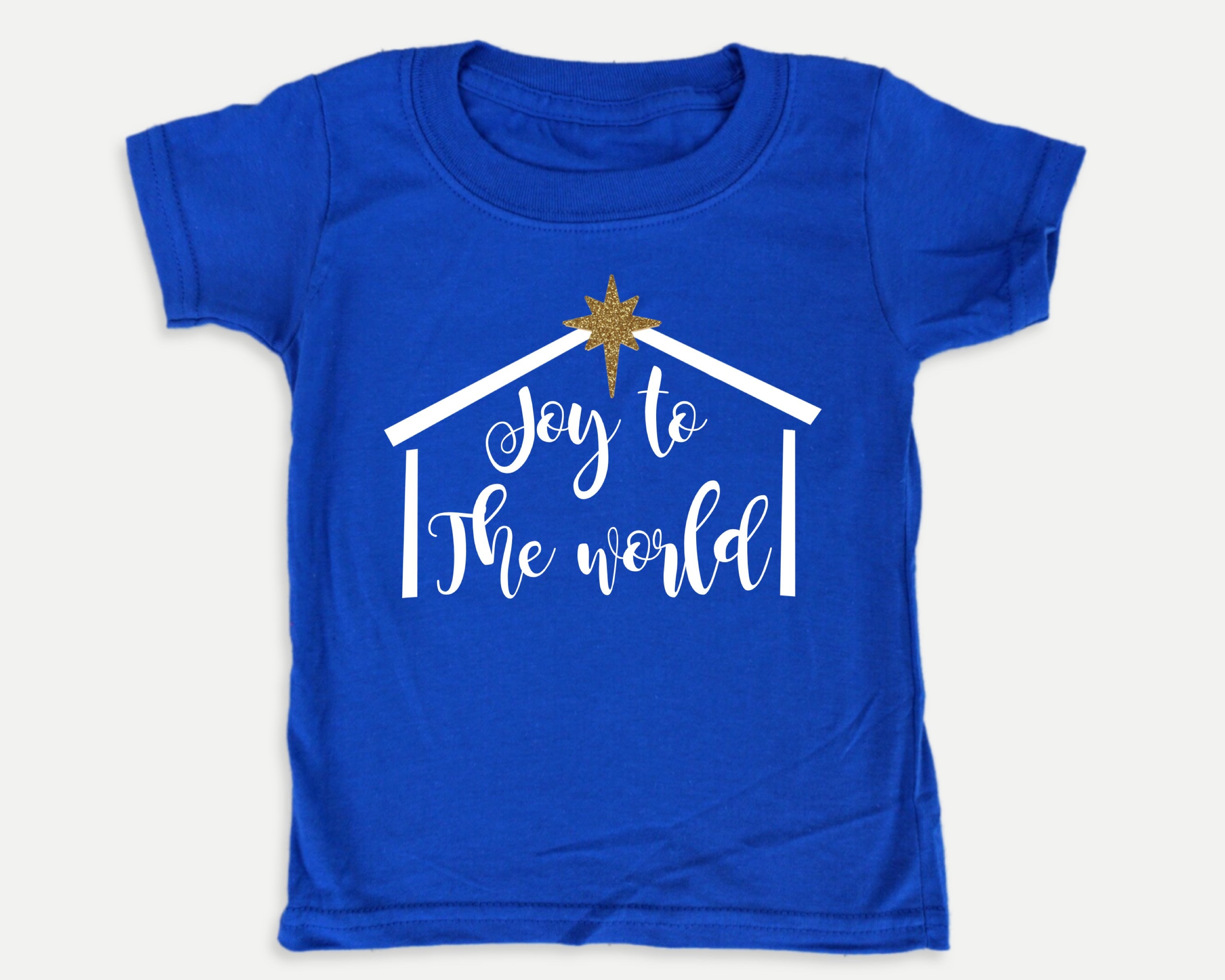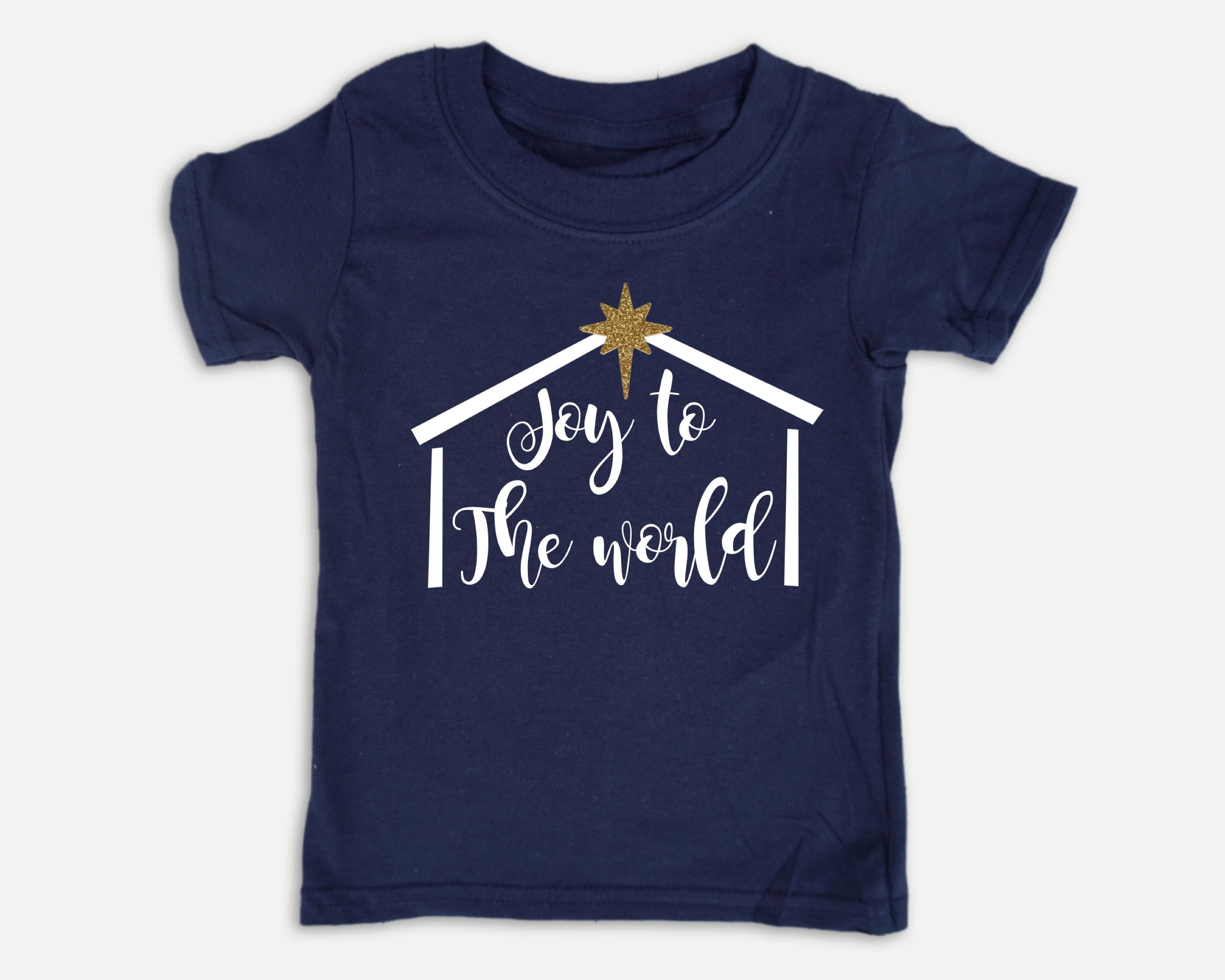 Soft cotton tshirt with a Joy to the World Nativity stable design in glitter and matte vinyl. A fun casual shirt for your kid to enjoy during the whole winter Christmas season.