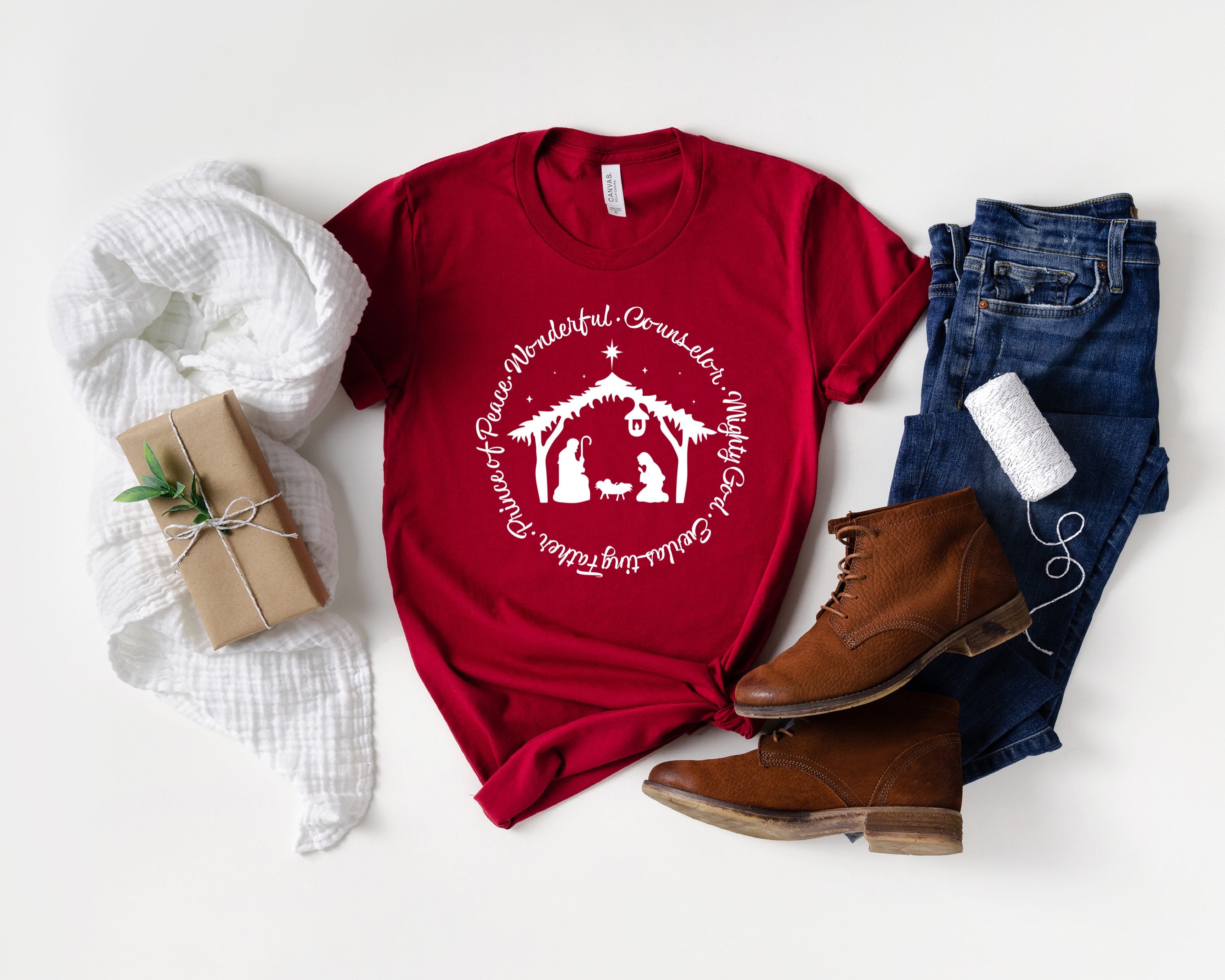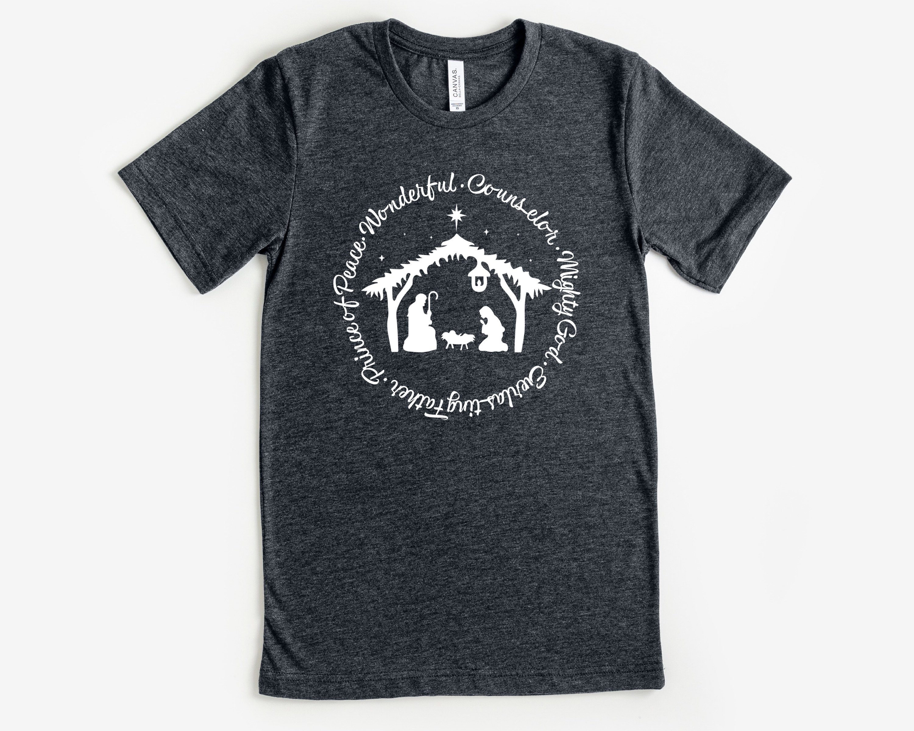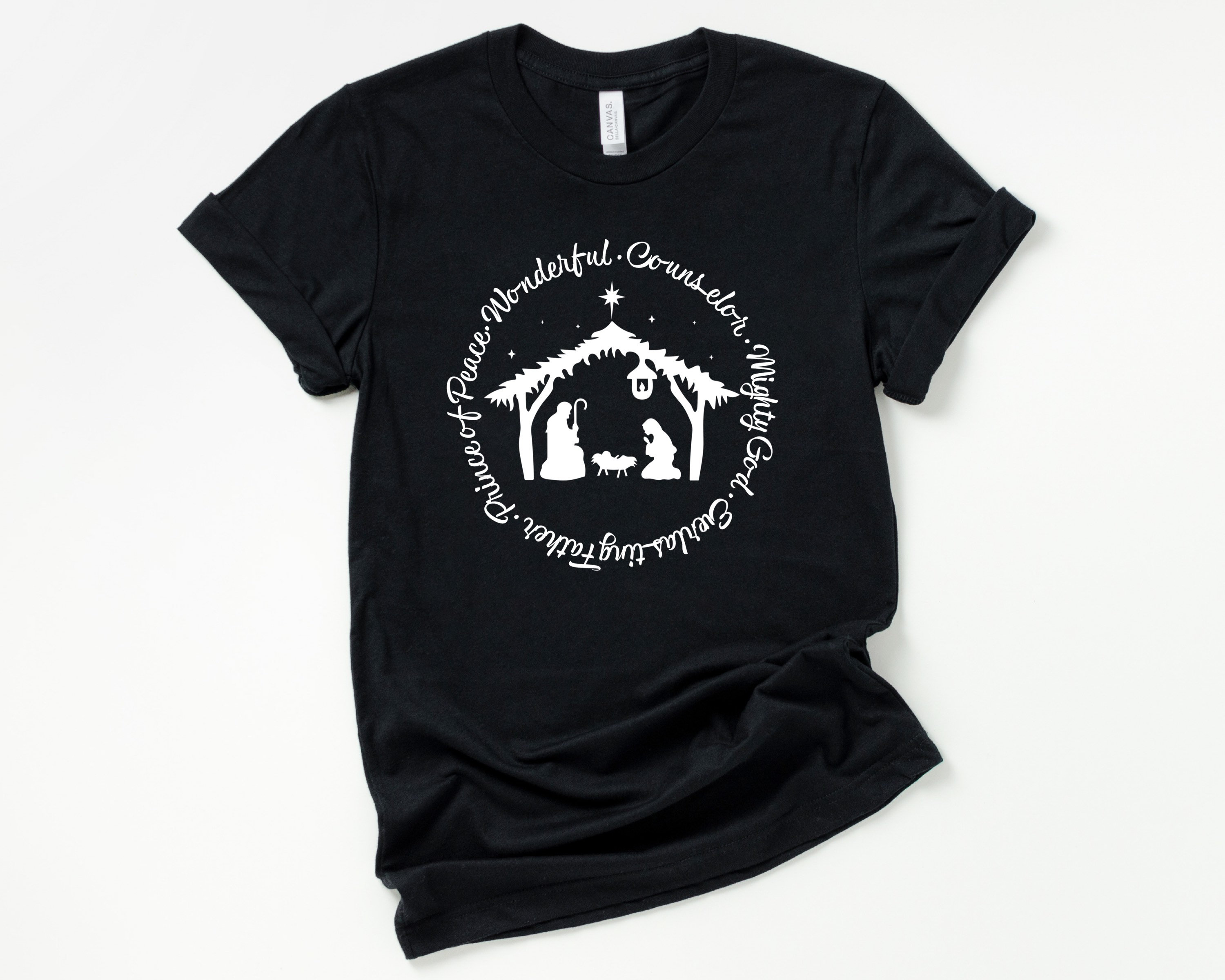 Christmas sayings t-shirt with a names of Jesus nativity design on a heavy cotton or soft cotton tshirt.
