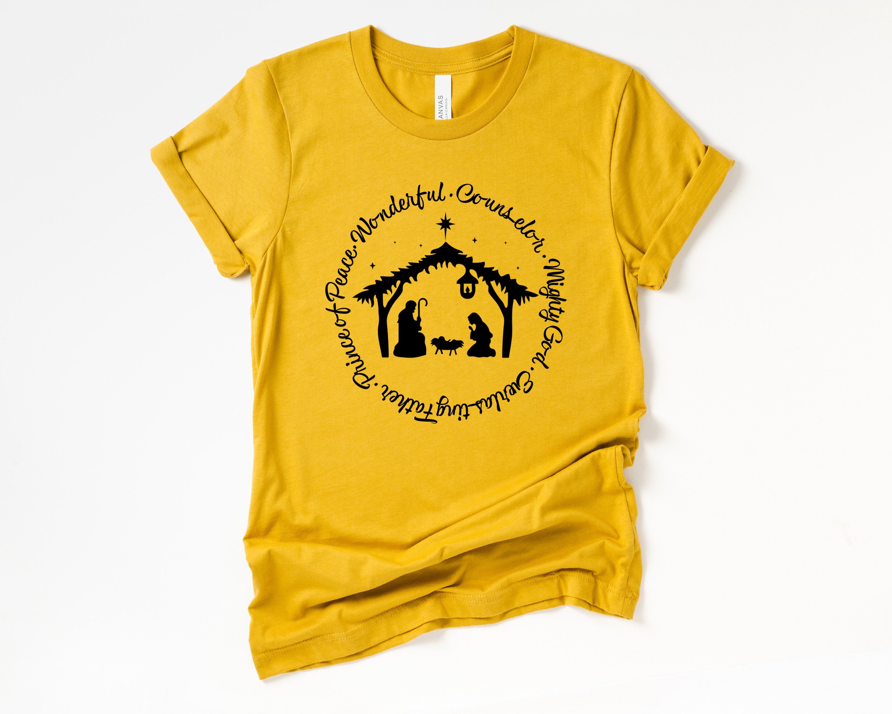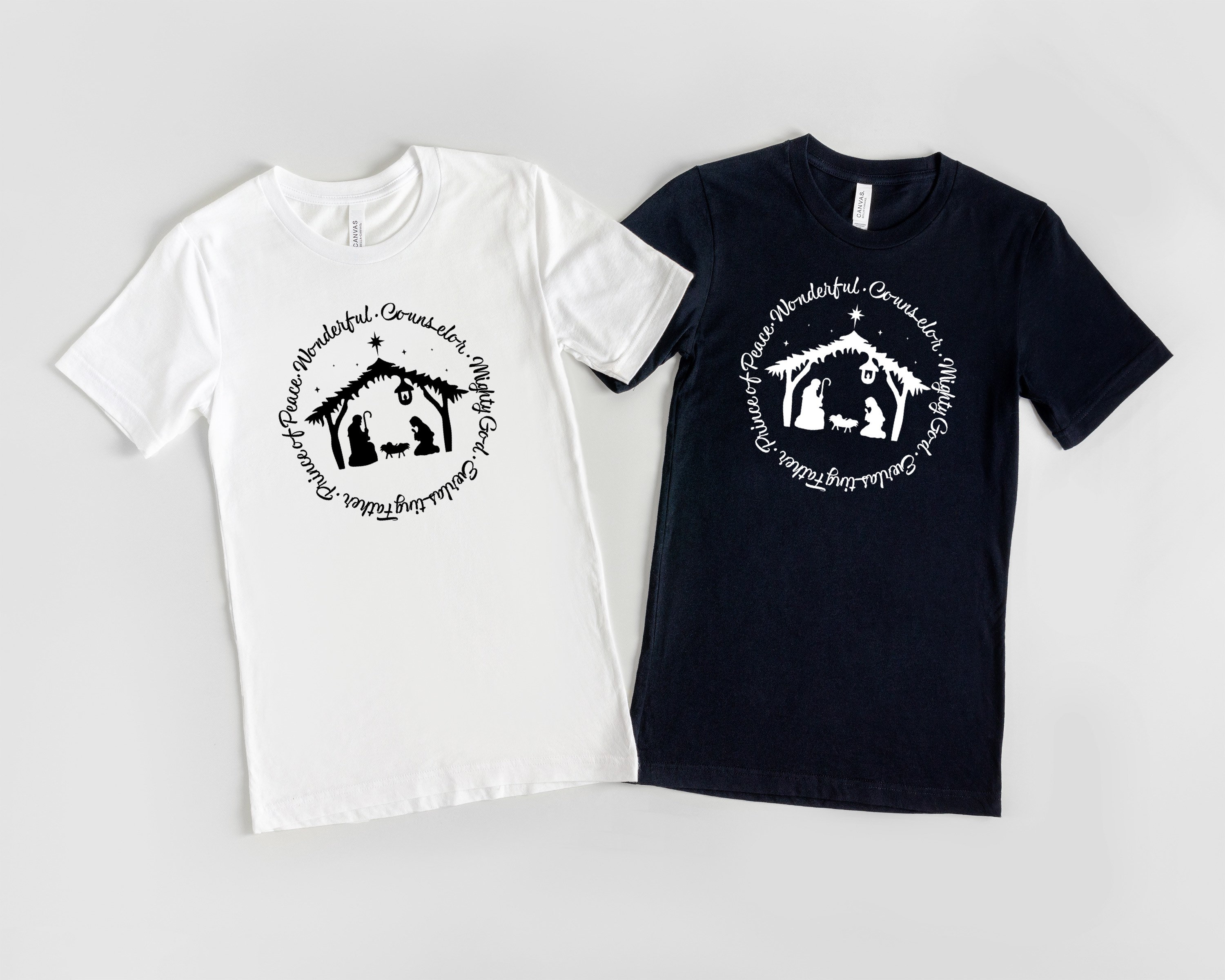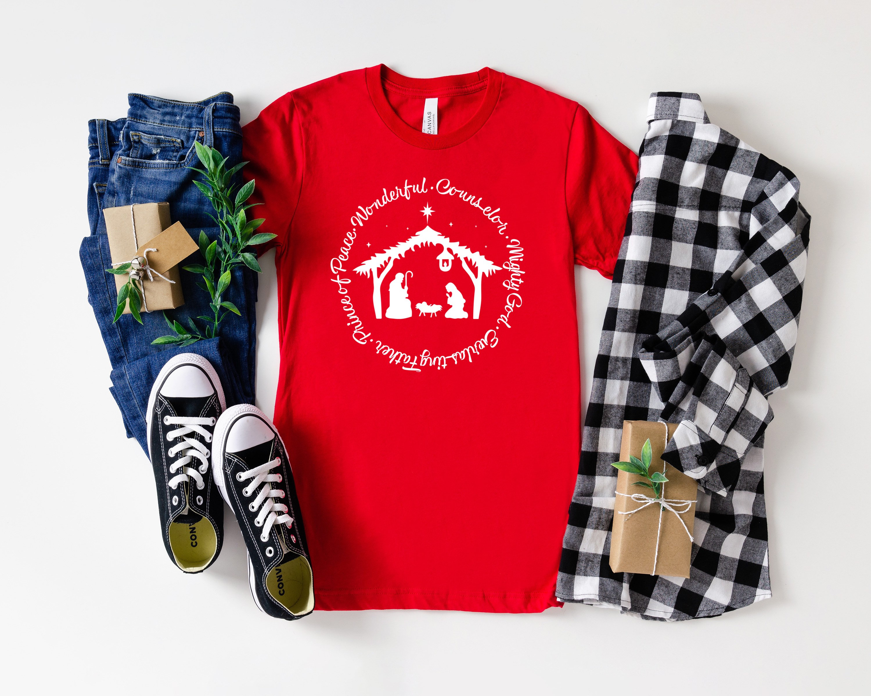 Christmas sayings t-shirt with a names of Jesus nativity design on a heavy cotton or soft cotton tshirt.