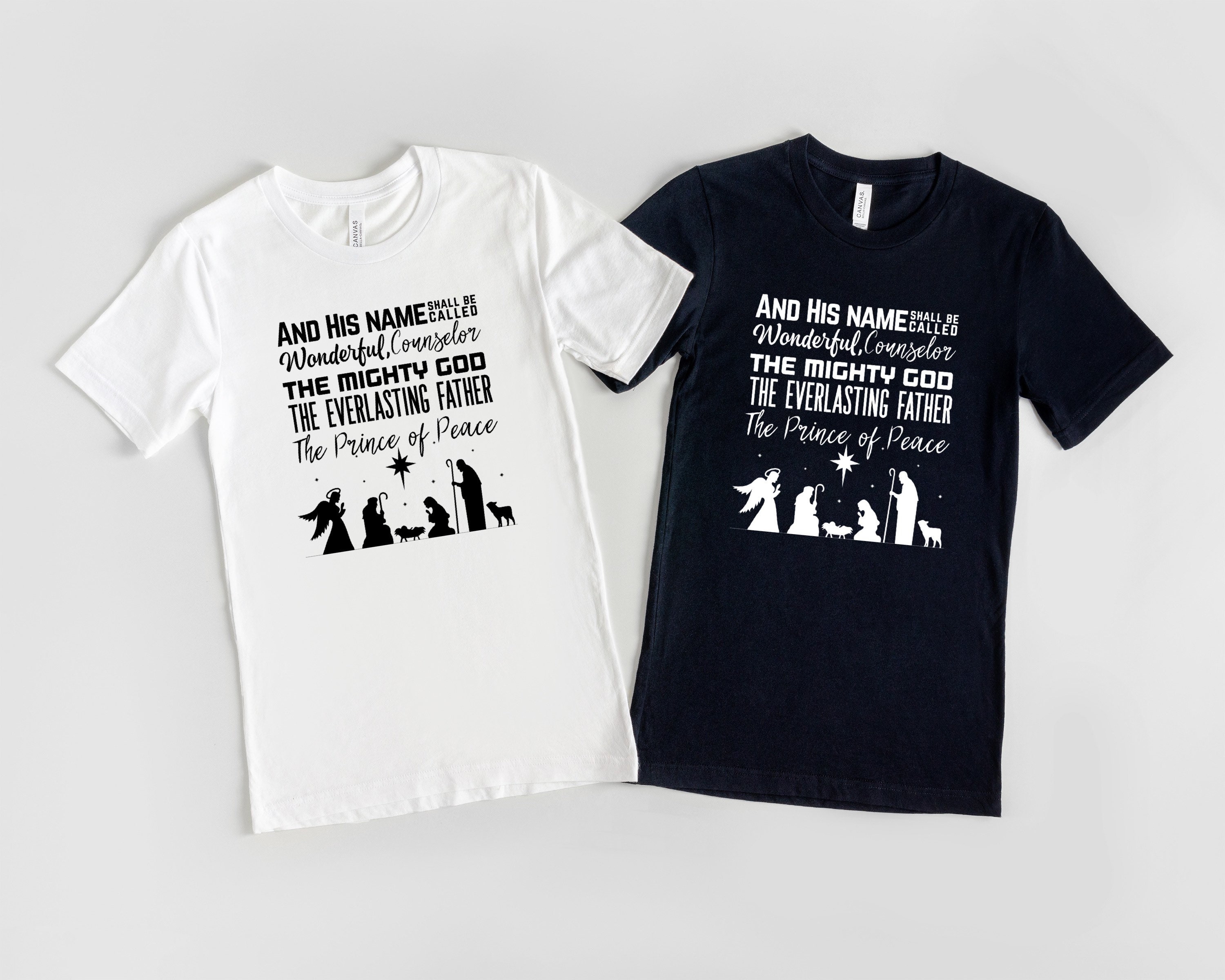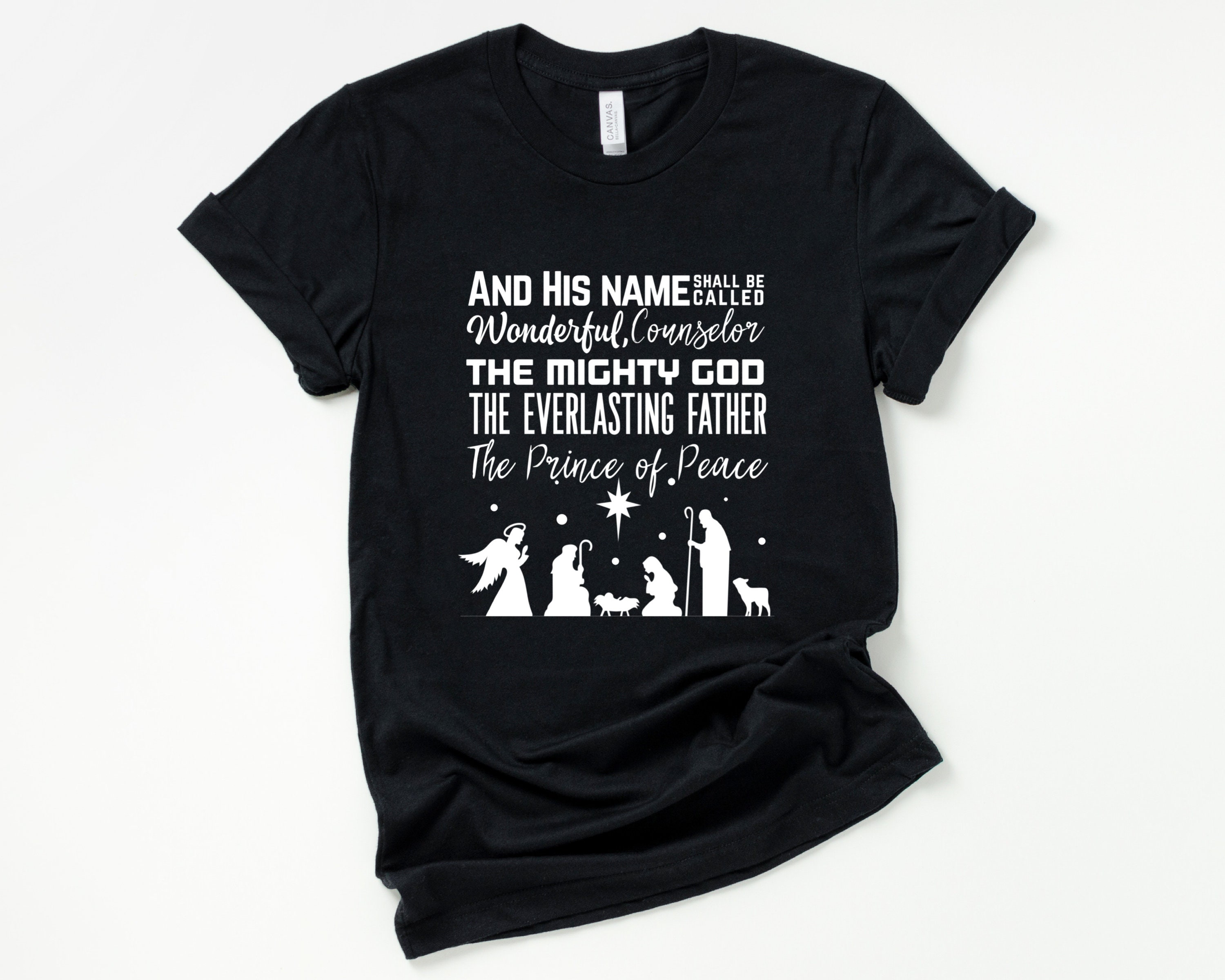Christmas sayings t-shirt with a names of Jesus nativity design on a heavy cotton or soft cotton tshirt.