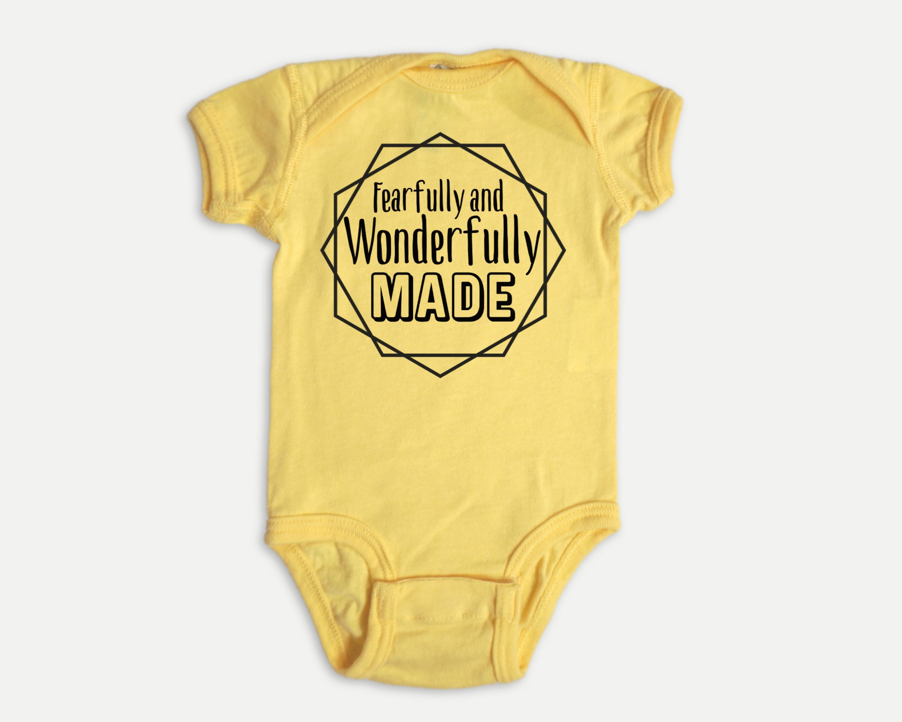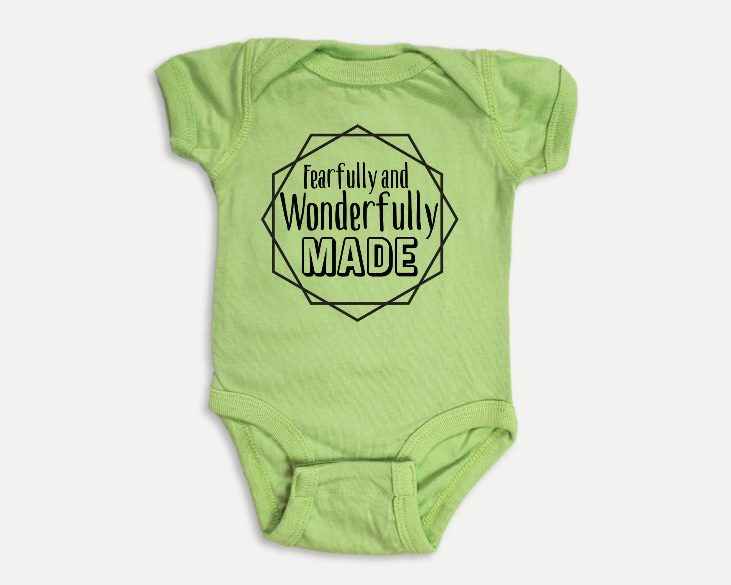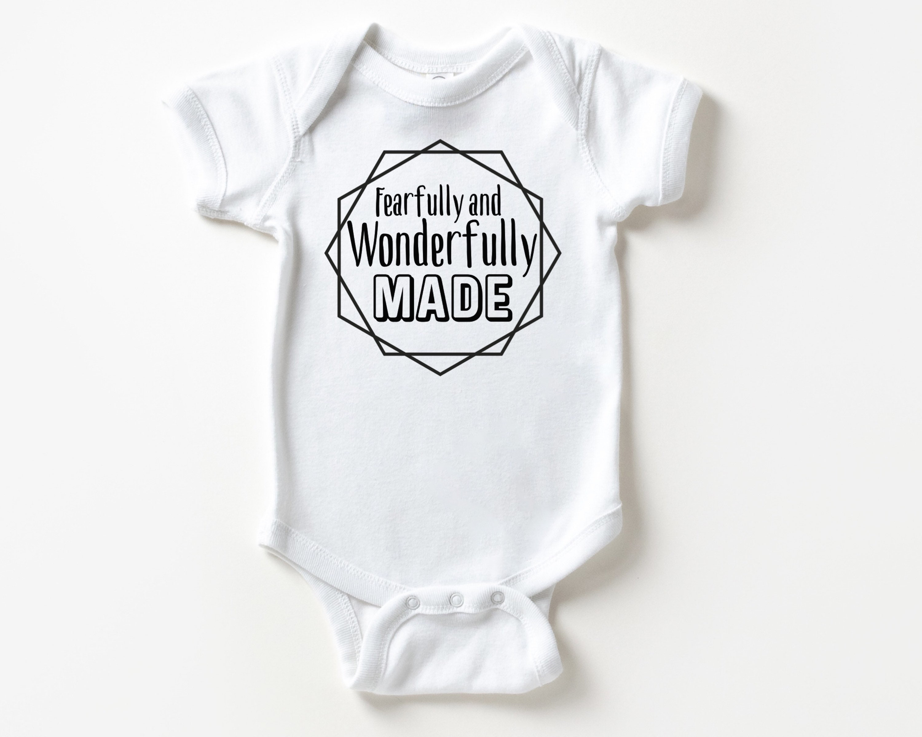 Christian baby bodysuit featuring "Fearfully and Wonderfully Made", in a softstyle infant bodysuit. Your baby or grandbaby will be the talk of the Sunday School nursery dressed in this Bible-blazened infant bodysuit! Or wow the mom-to-be and claim the best baby shower gift prize by pairing this outfit with several of our other Bible baby outfits to make a set. This design would also work well for a family waiting to find out the gender of the baby and prefer gender-neutral baby clothes.