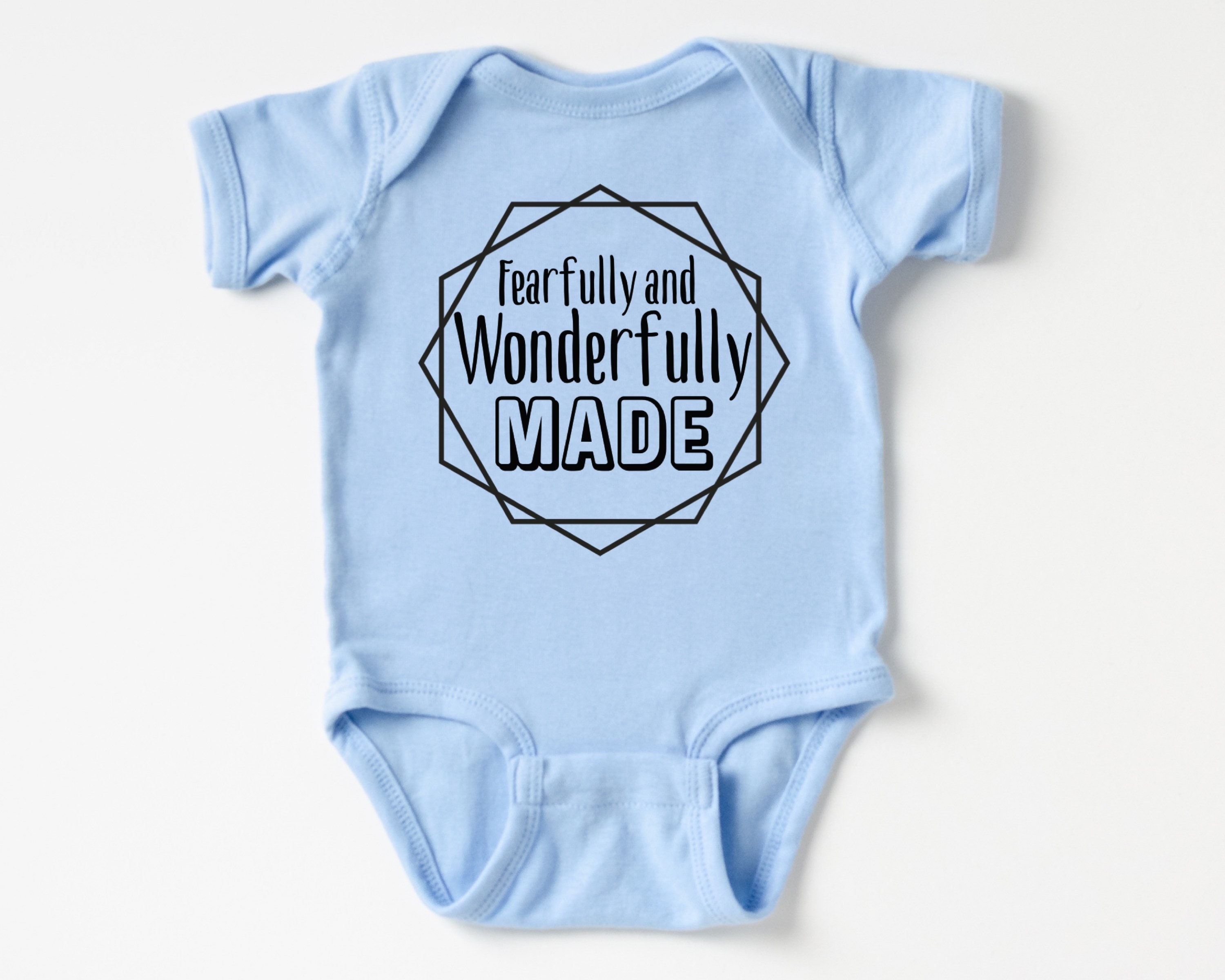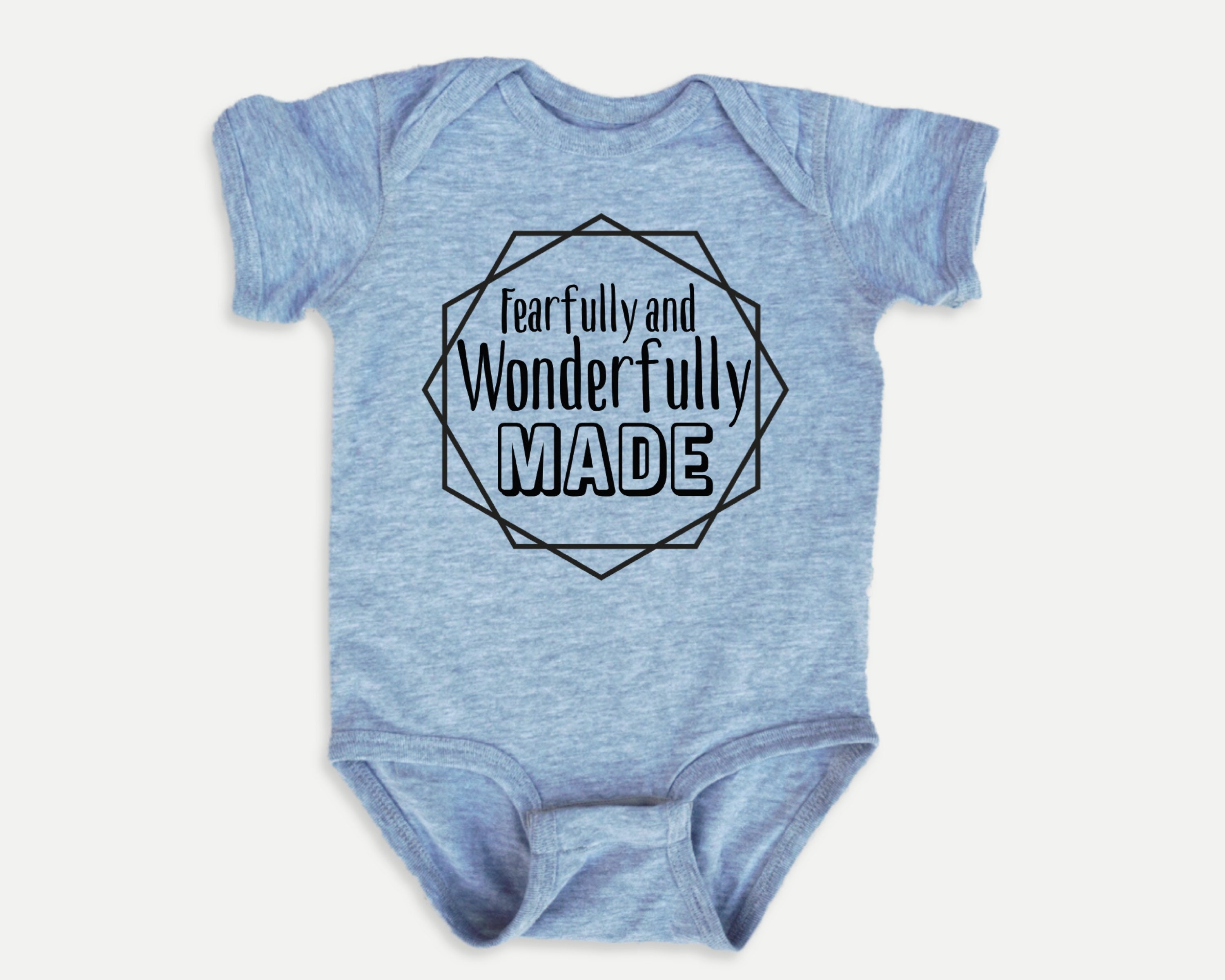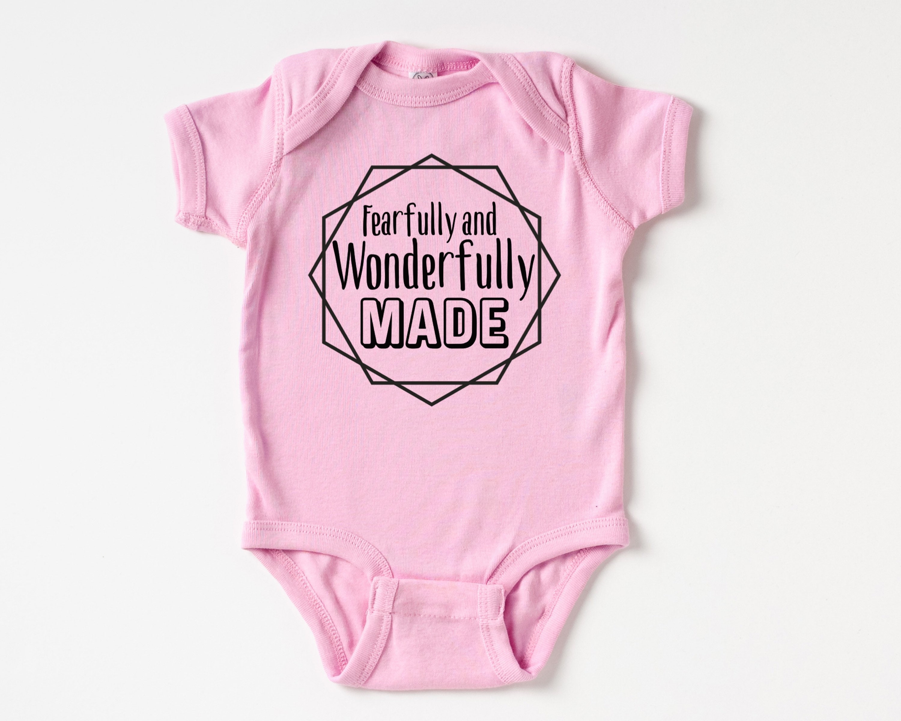 Christian baby bodysuit featuring "Fearfully and Wonderfully Made", in a softstyle infant bodysuit. Your baby or grandbaby will be the talk of the Sunday School nursery dressed in this Bible-blazened infant bodysuit! Or wow the mom-to-be and claim the best baby shower gift prize by pairing this outfit with several of our other Bible baby outfits to make a set. This design would also work well for a family waiting to find out the gender of the baby and prefer gender-neutral baby clothes.