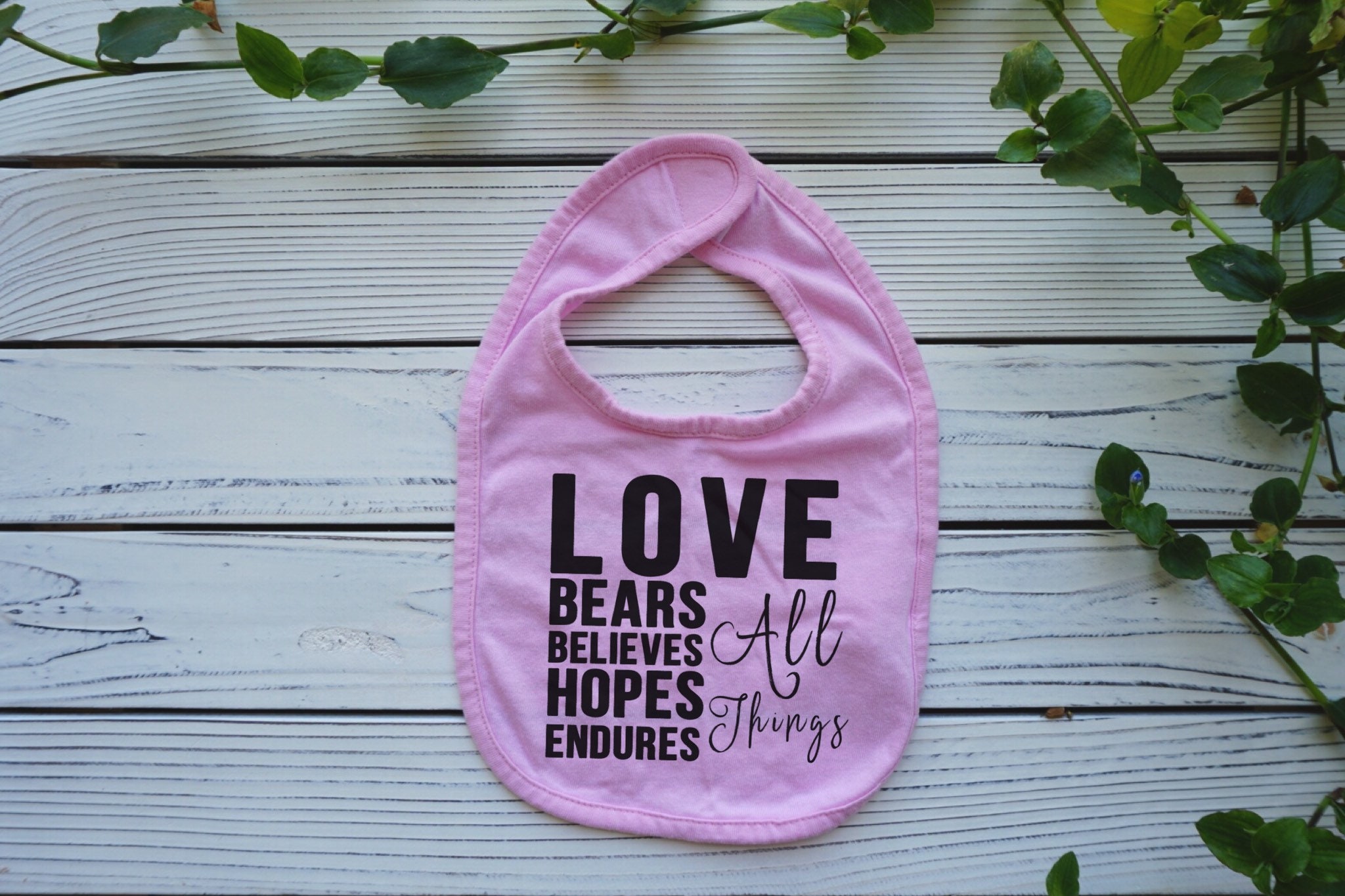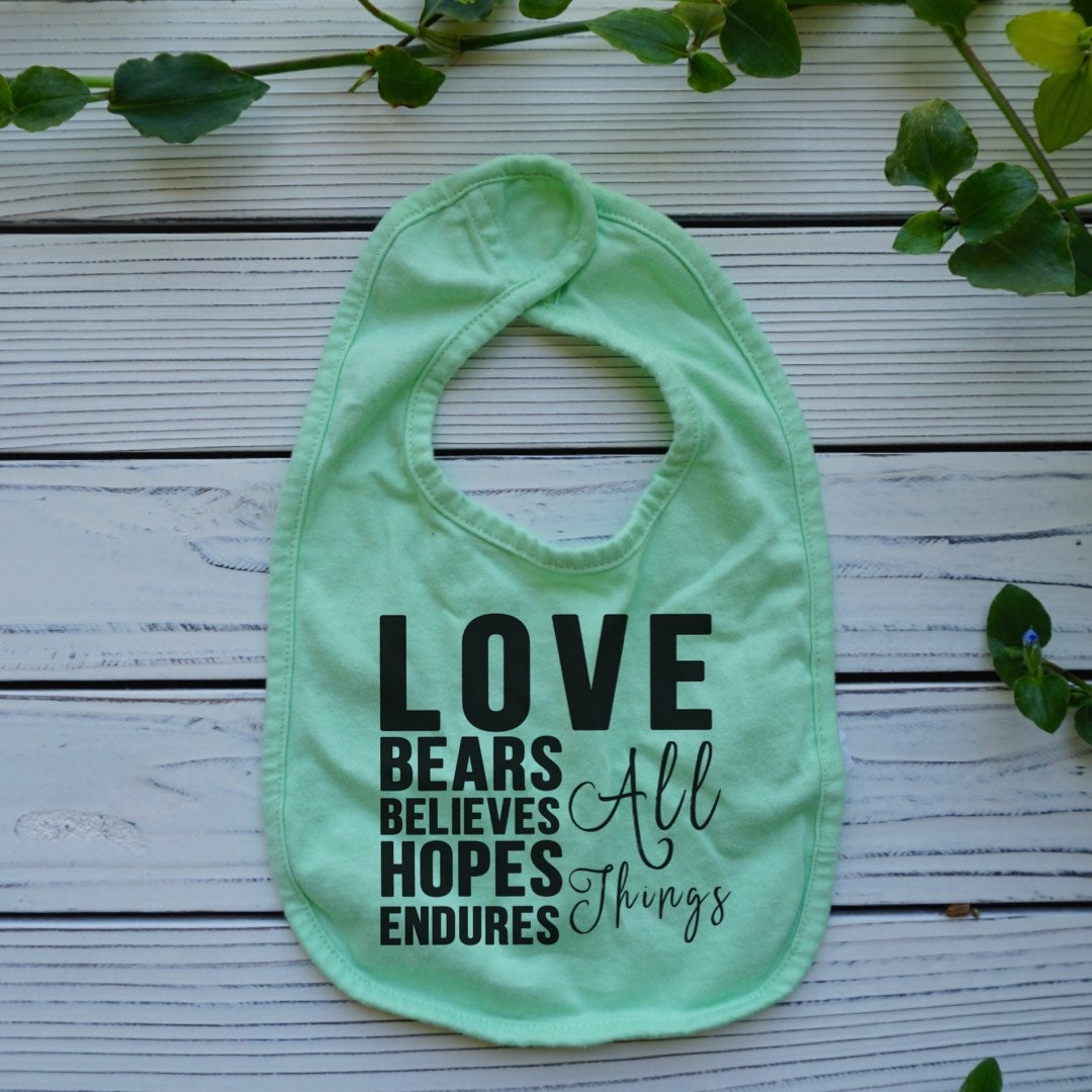 Christian baby bib featuring Love Bears All things design, in a soft, lightweight baby bib. Your baby or grandbaby will be the talk of the Sunday School nursery dressed in this Bible-blazened baby bib! Or wow the mom-to-be and claim the best baby shower gift prize by pairing this outfit with several of our other Bible baby outfits to make a set. This design would also work well for a family waiting to find out the gender of the baby and prefer gender-neutral baby clothes.