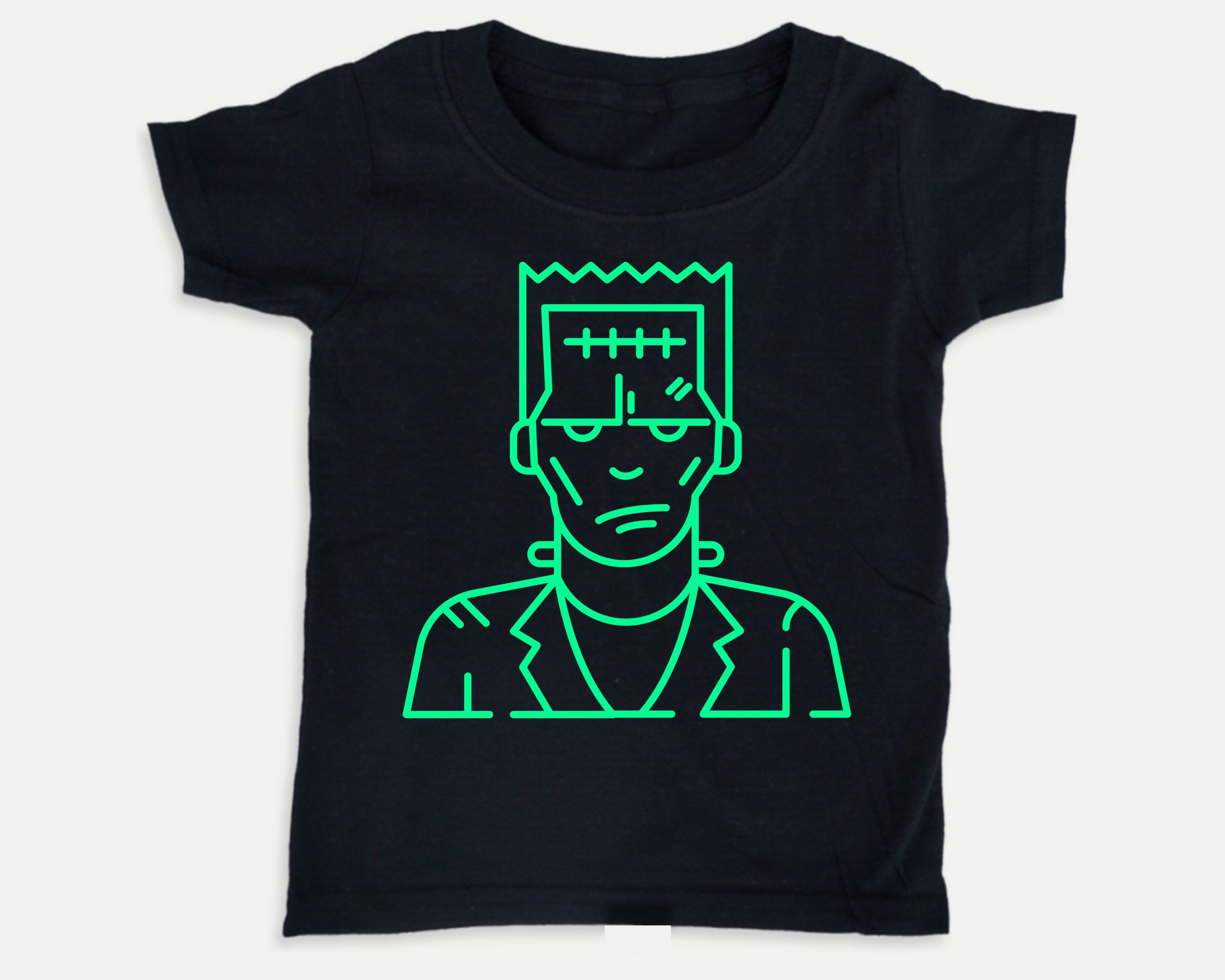 Glow-in-the-dark Halloween toddler or baby softstyle t-shirt featuring Frankenstien's monster. Take your little boy or girl out trick or treating in a stylish glow in the dark soft style toddler tee.
