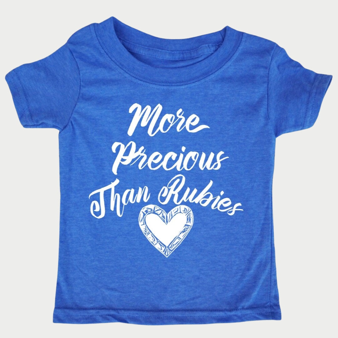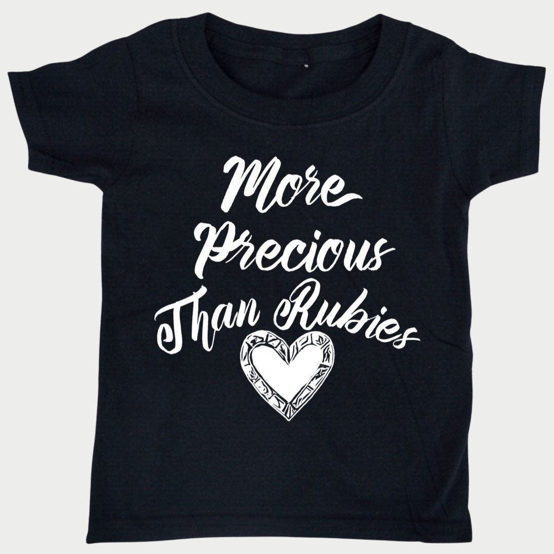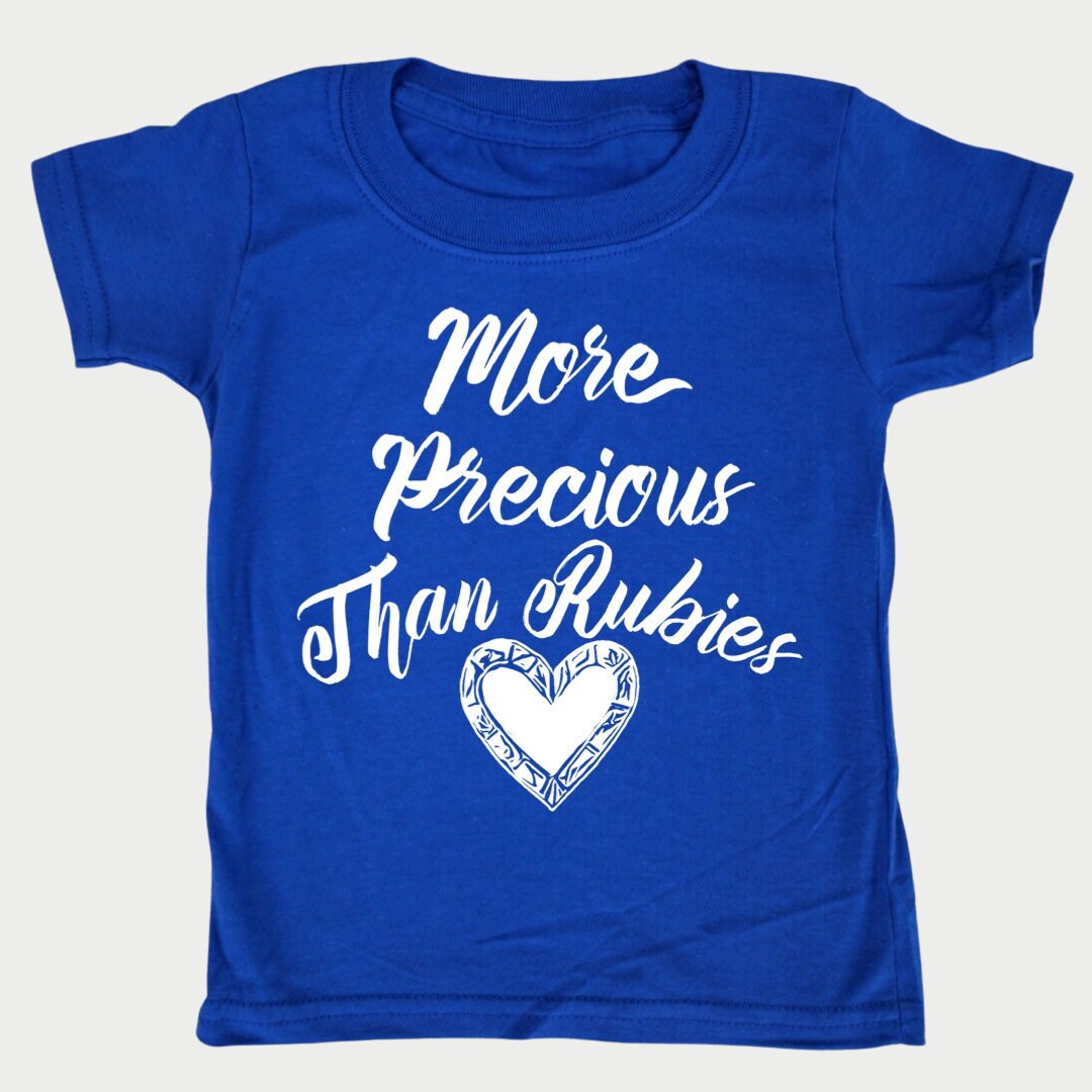 Christian toddler tshirt featuring More Precious than Rubies in a soft style toddler tee. Your child or grandchild will be the talk of the Sunday School nursery dressed in this Bible-blazened tshirt! Or wow the mom-to-be and claim the best baby shower gift prize by pairing this outfit with several of our other Bible kid and baby outfits to make a set.