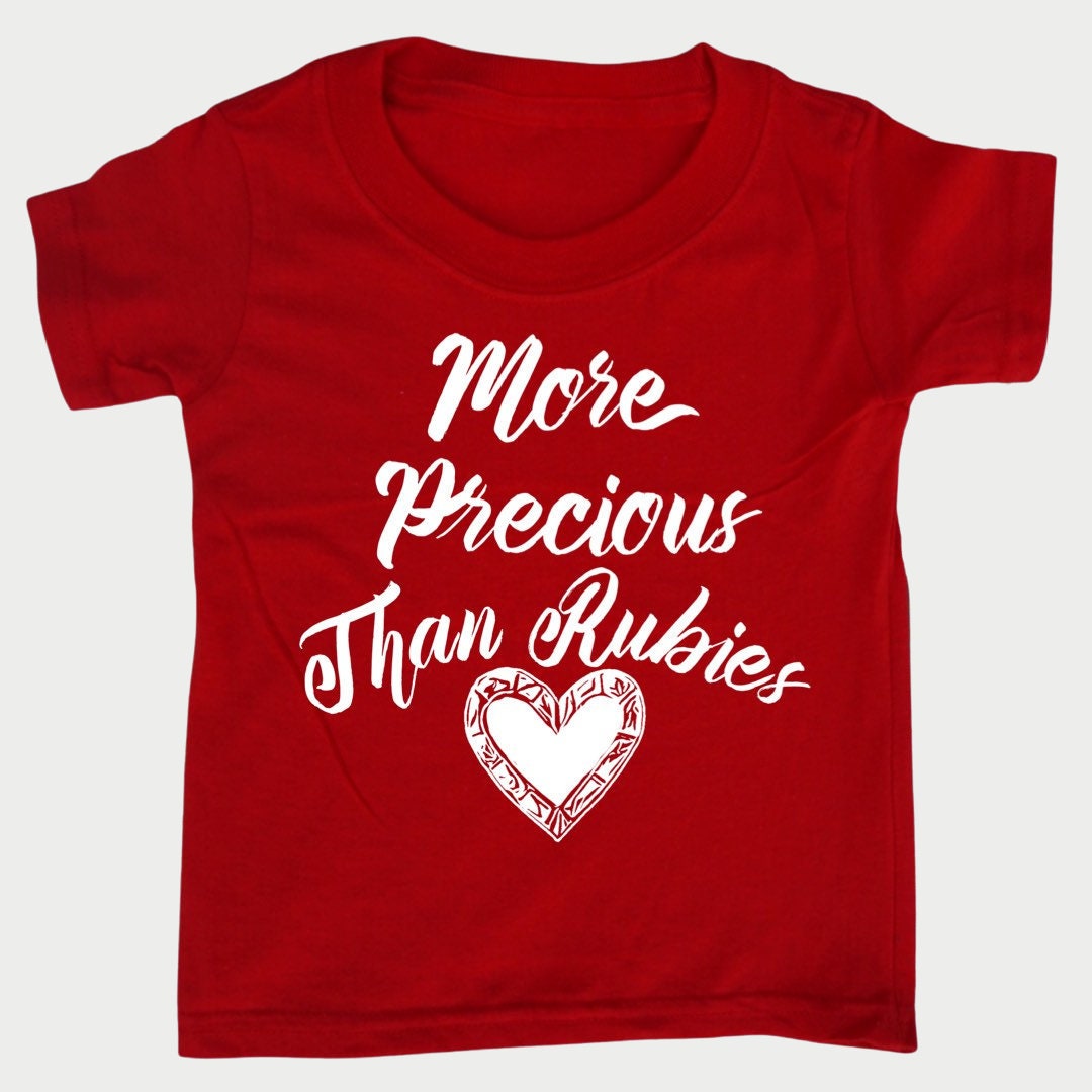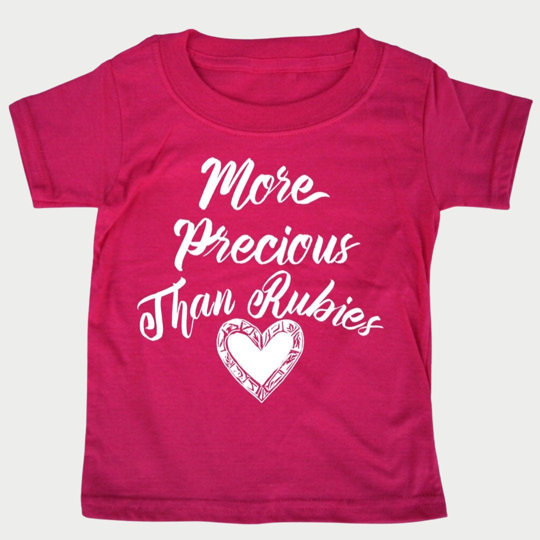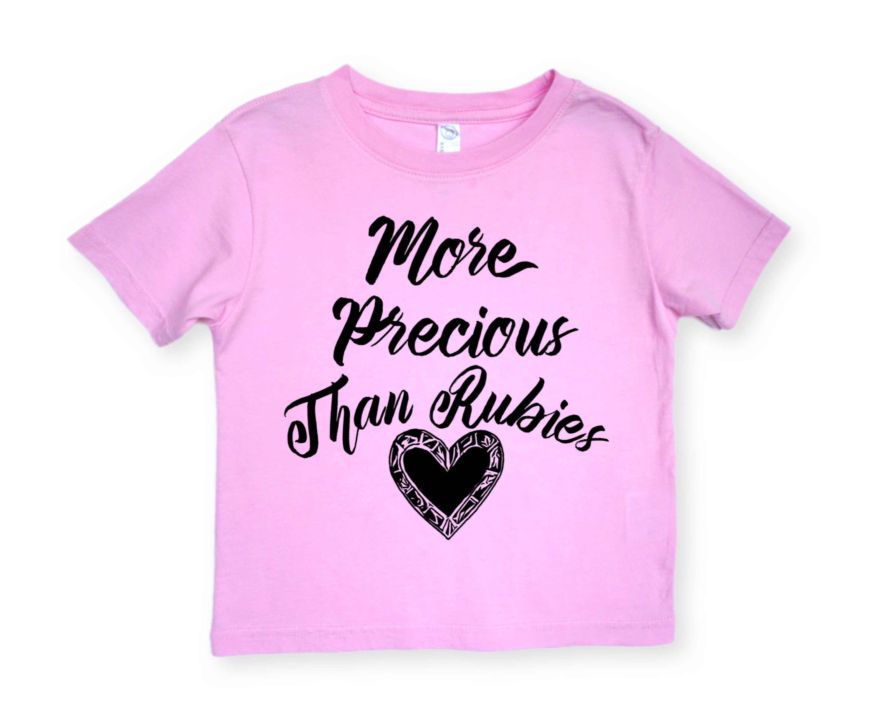 Christian toddler tshirt featuring More Precious than Rubies in a soft style toddler tee. Your child or grandchild will be the talk of the Sunday School nursery dressed in this Bible-blazened tshirt! Or wow the mom-to-be and claim the best baby shower gift prize by pairing this outfit with several of our other Bible kid and baby outfits to make a set.