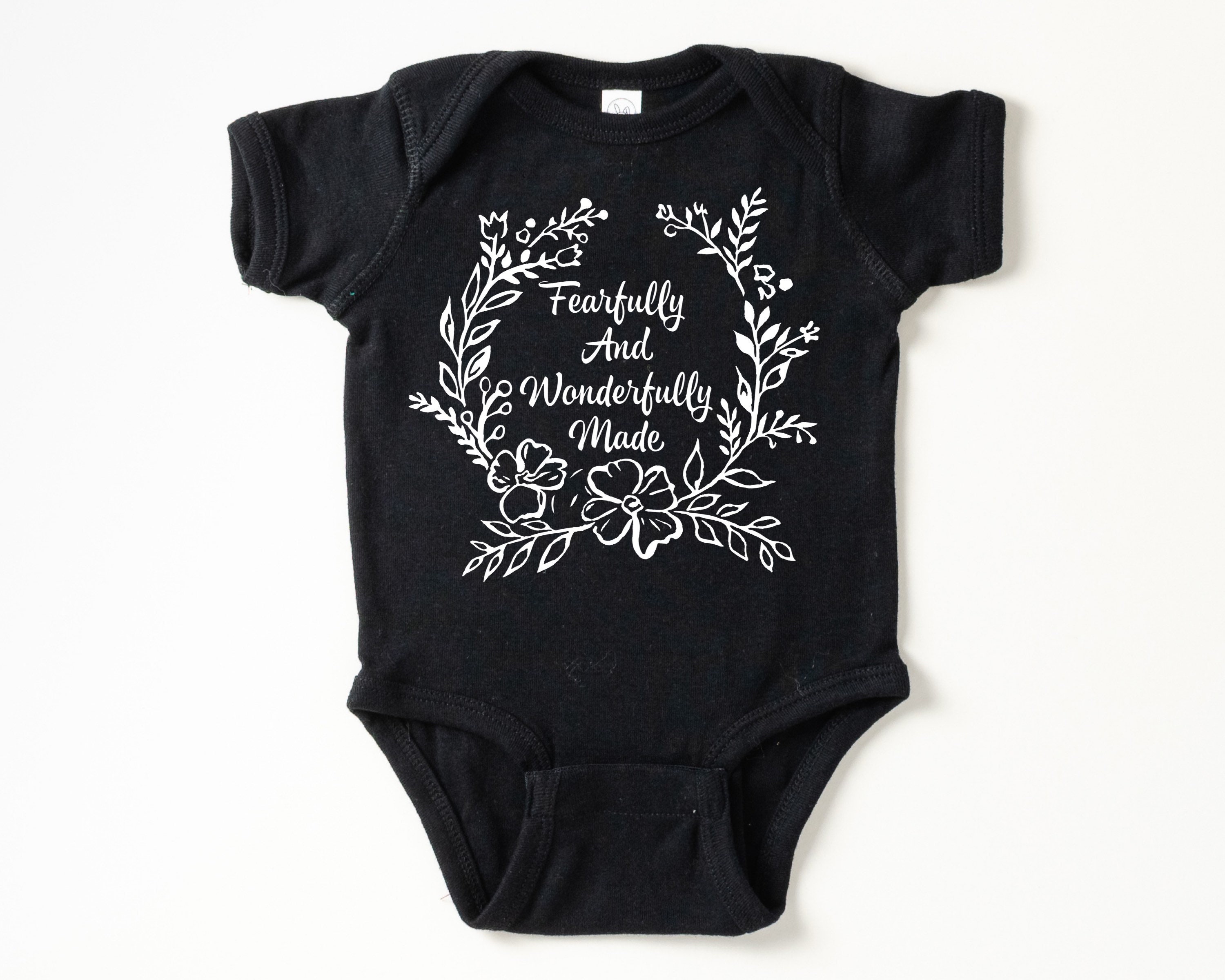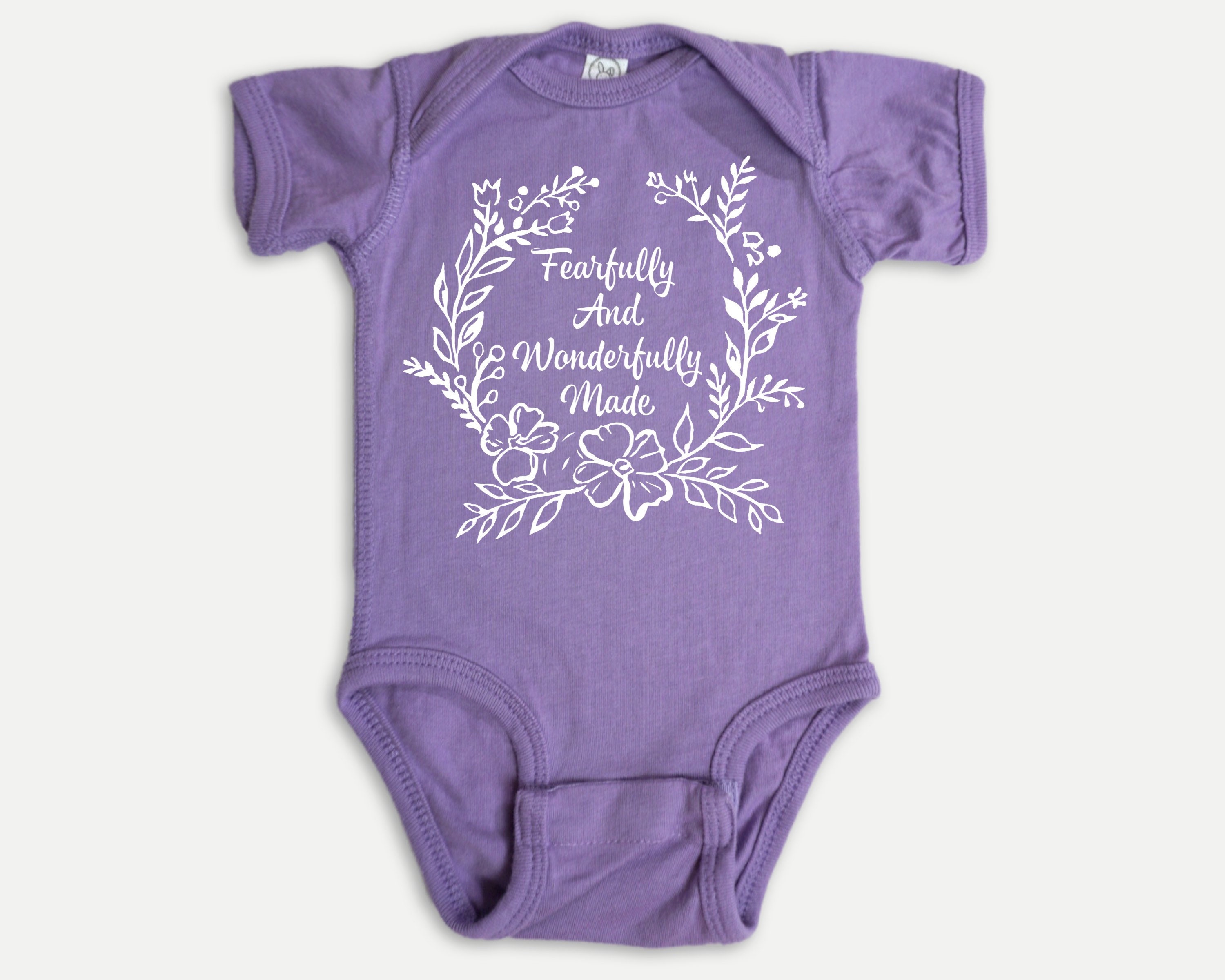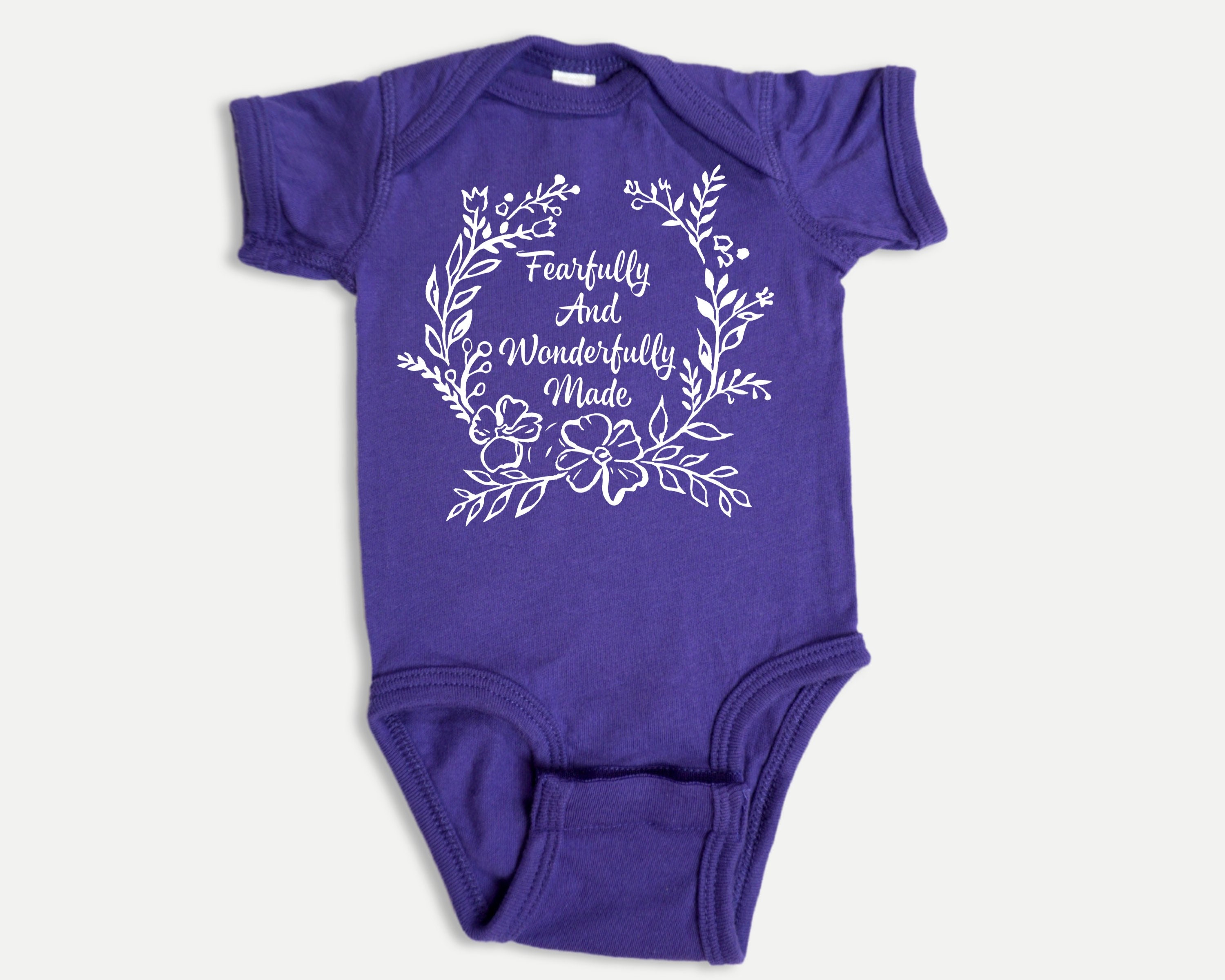 Christian baby bodysuit featuring a floral "Fearfully and Wonderfully Made" in a softstyle infant bodysuit. Your baby or grandbaby will be the talk of the Sunday School nursery dressed in this Bible-blazened infant bodysuit! Or wow the mom-to-be and claim the best baby shower gift prize by pairing this outfit with several of our other Bible baby outfits to make a set. This design would also work well for a family waiting to find out the gender of the baby and prefer gender-neutral baby clothes.