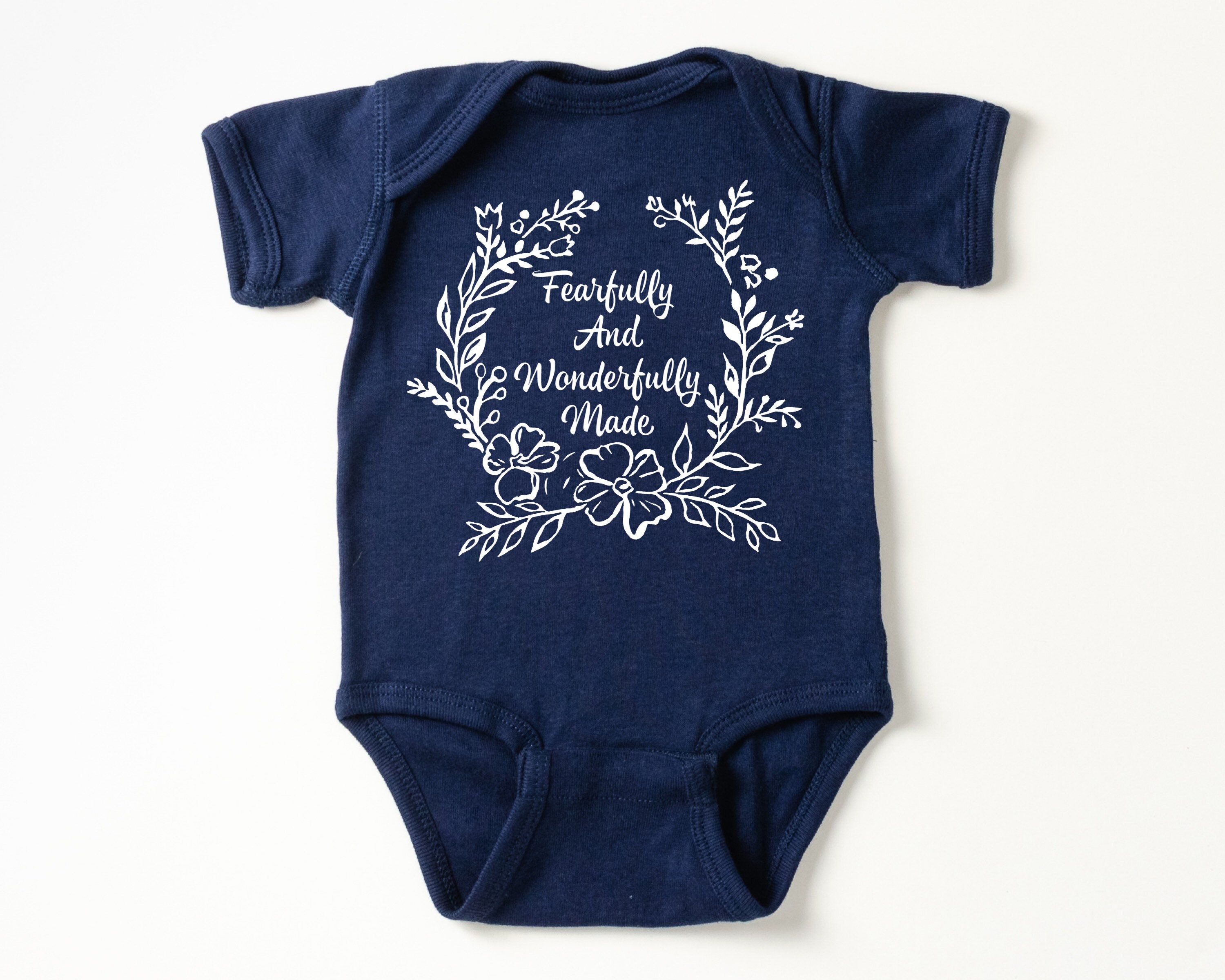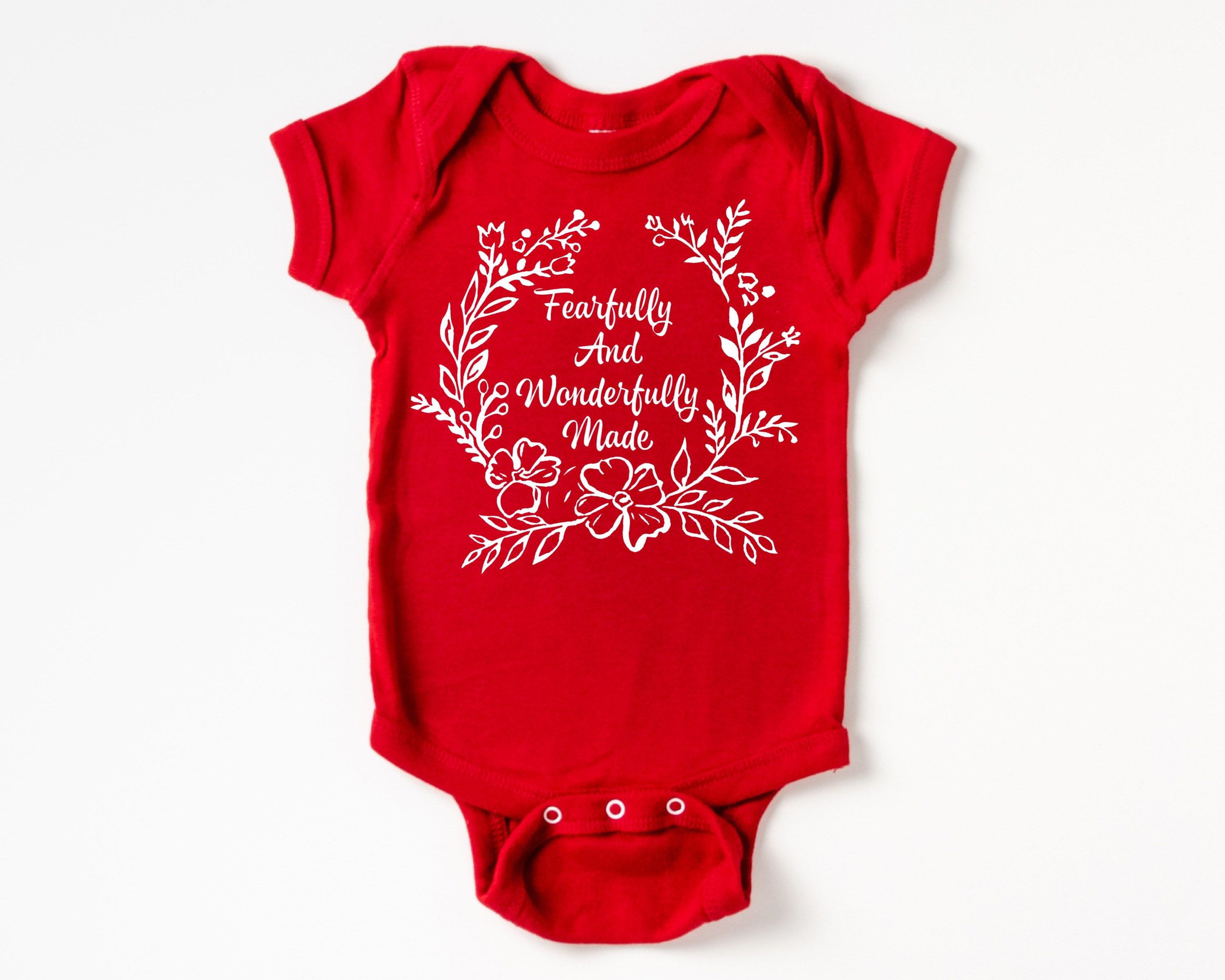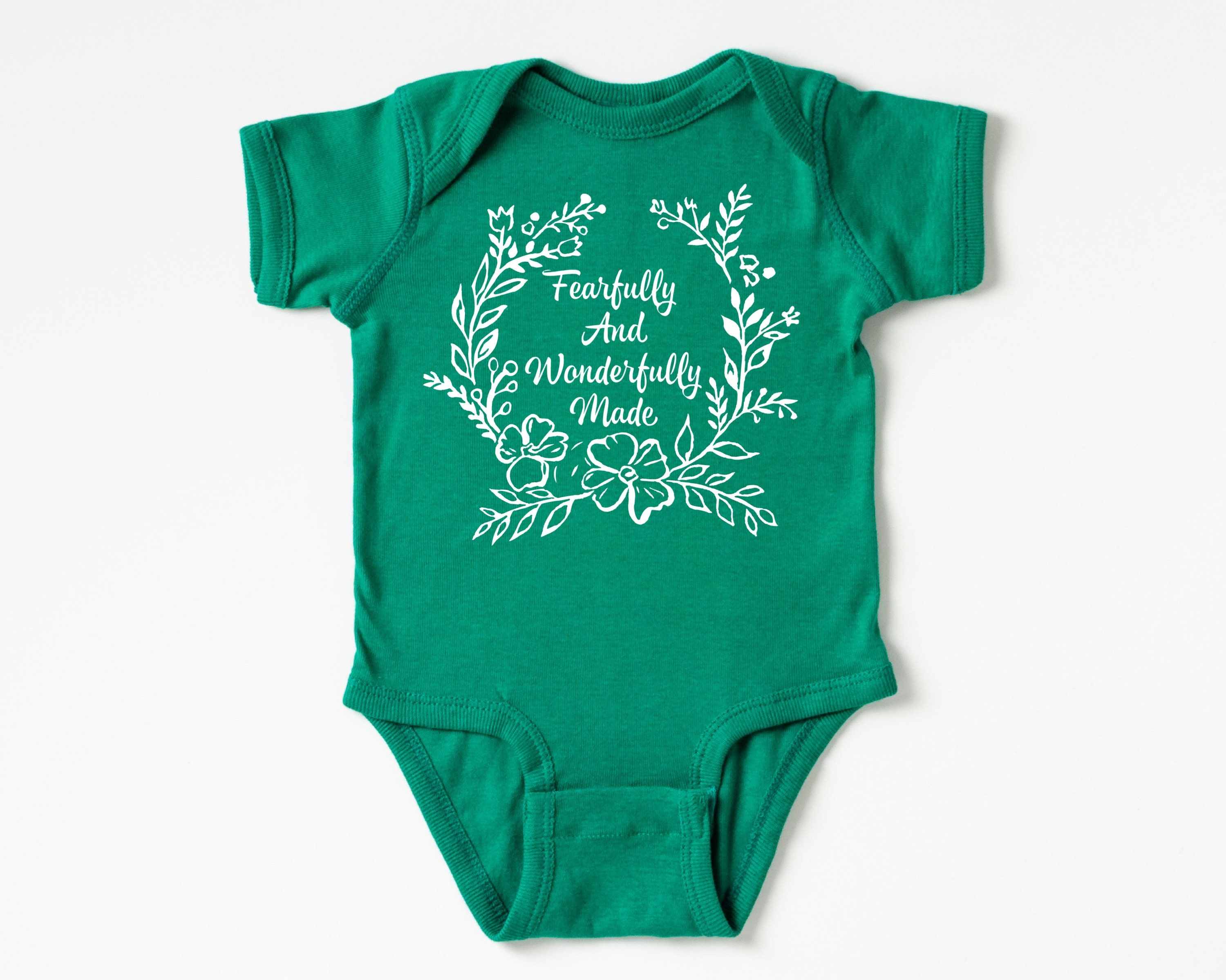 Christian baby bodysuit featuring a floral "Fearfully and Wonderfully Made" in a softstyle infant bodysuit. Your baby or grandbaby will be the talk of the Sunday School nursery dressed in this Bible-blazened infant bodysuit! Or wow the mom-to-be and claim the best baby shower gift prize by pairing this outfit with several of our other Bible baby outfits to make a set. This design would also work well for a family waiting to find out the gender of the baby and prefer gender-neutral baby clothes.