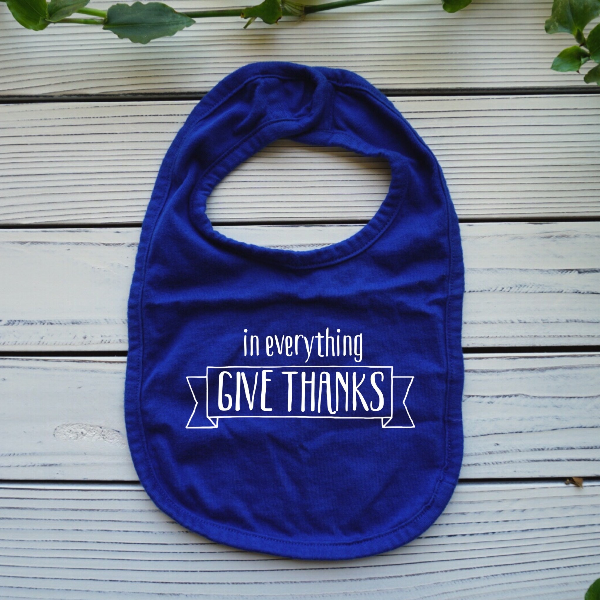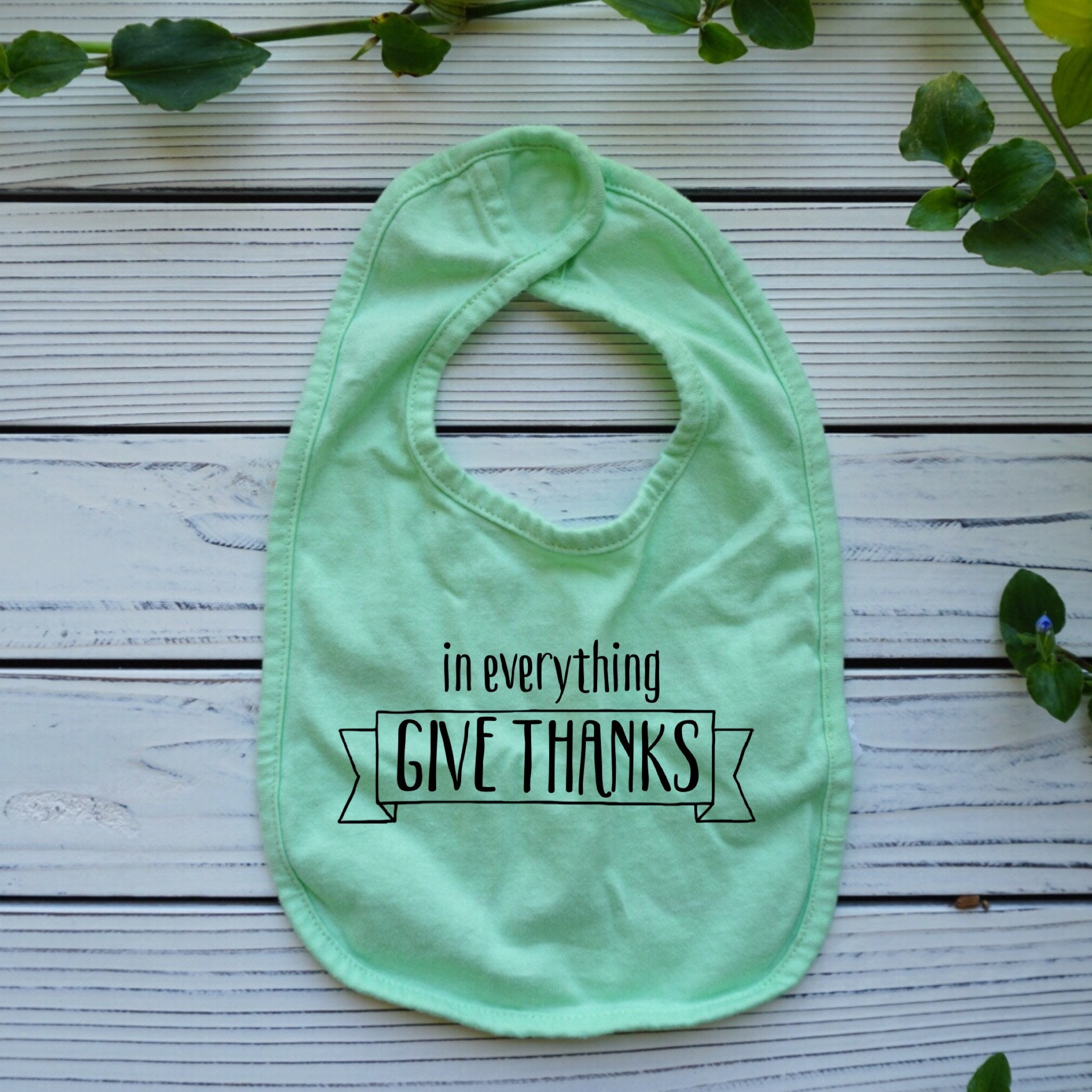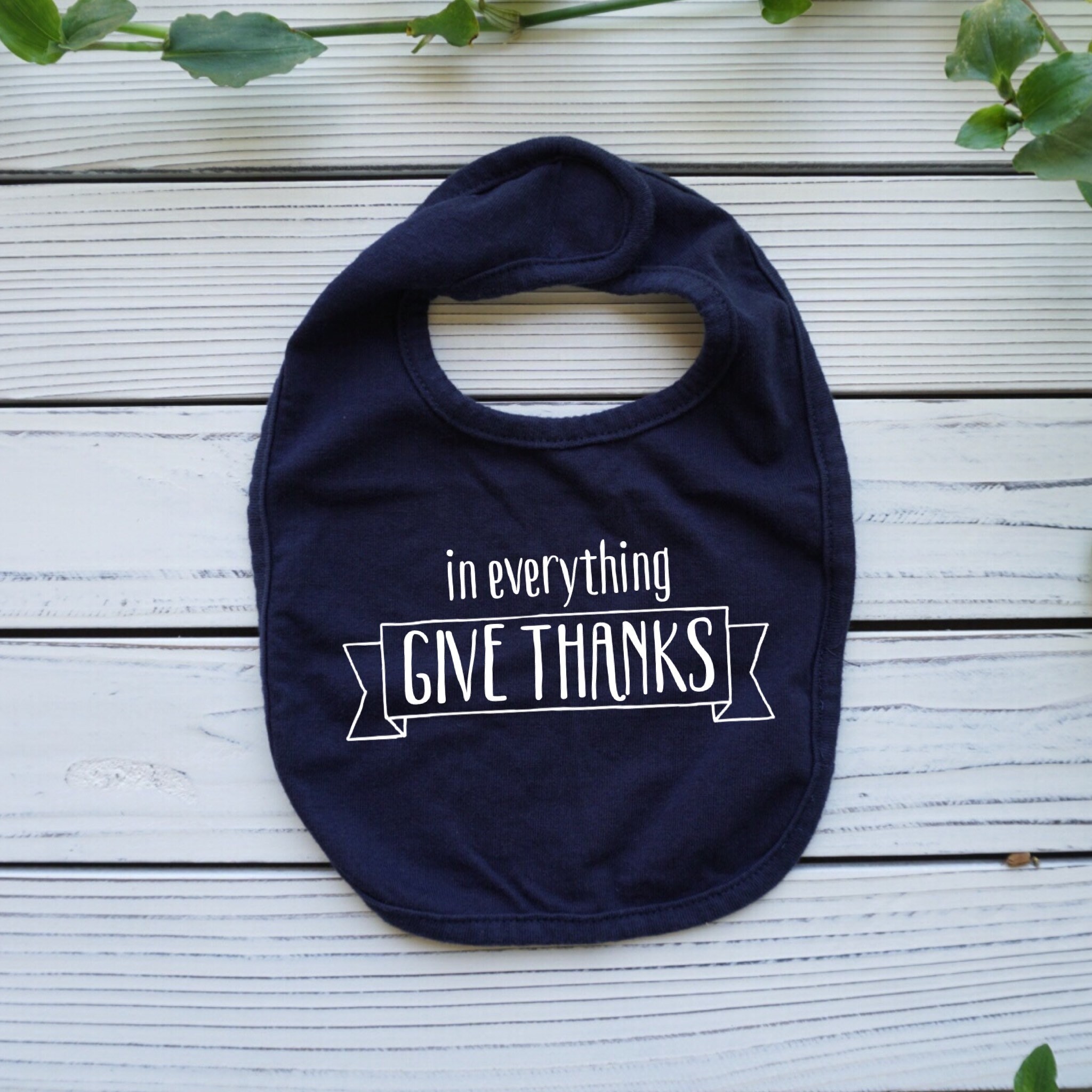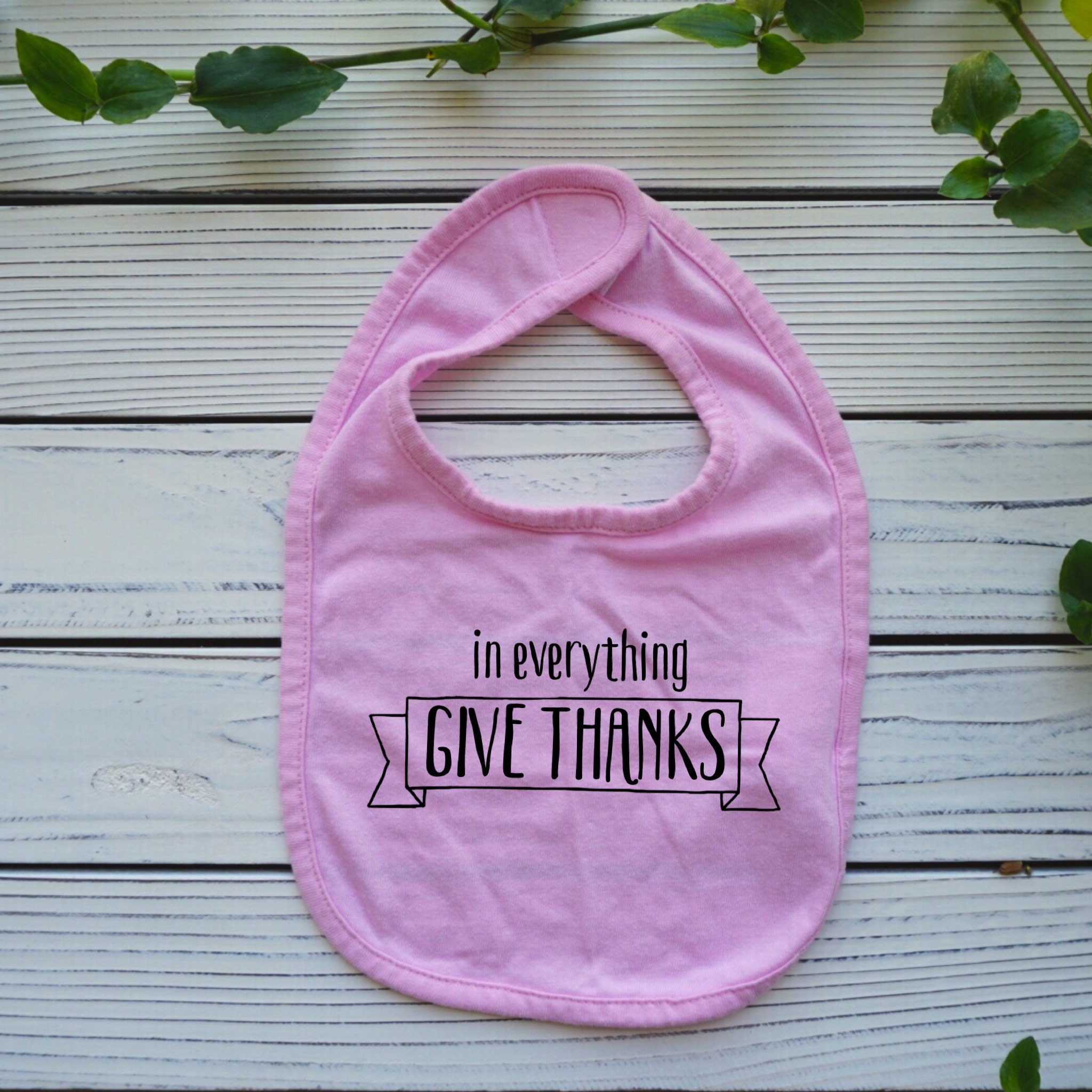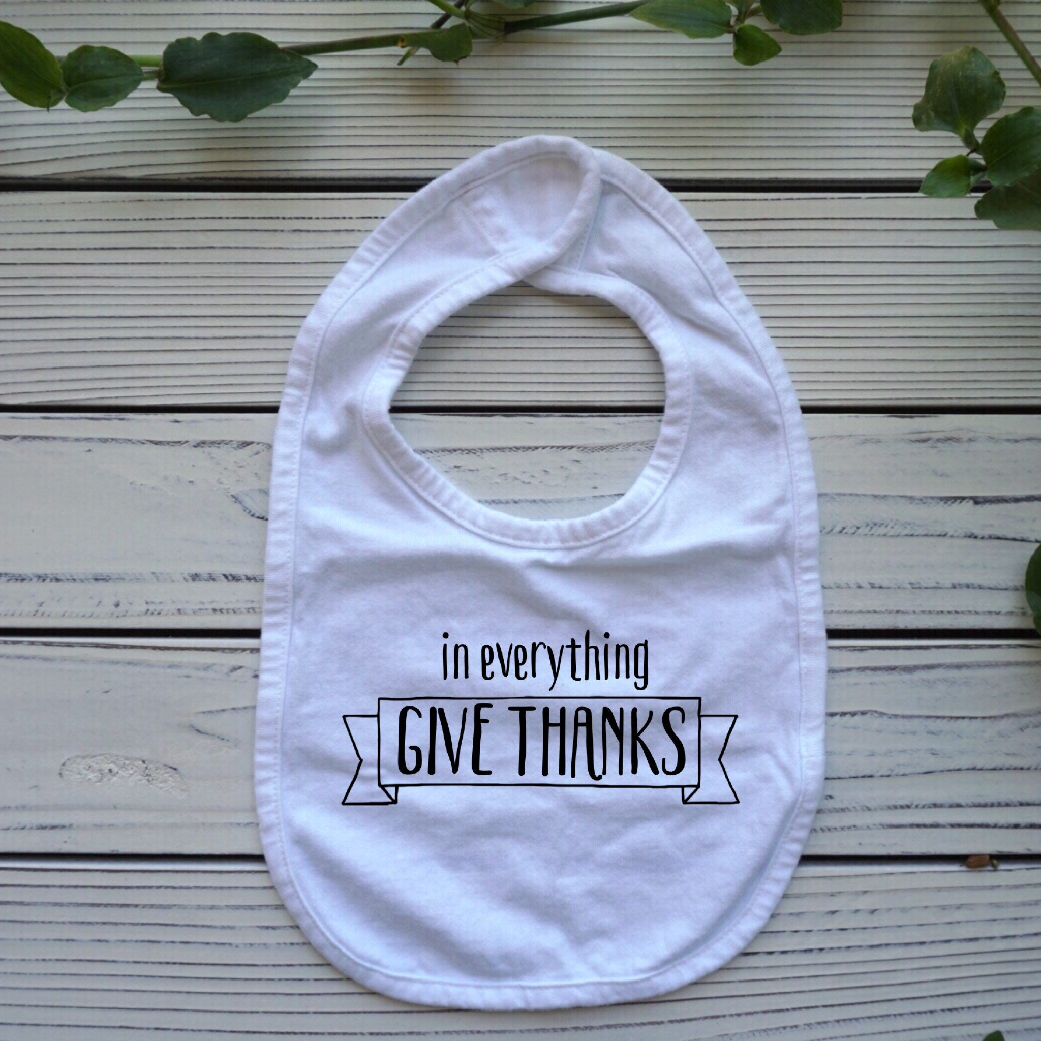 Christian baby bib featuring 1 Thessalonians 5:18 design in black or white vinyl on a soft, lightweight baby bib. Your baby or grandbaby will be the talk of the Sunday School nursery dressed in this Bible-blazened baby bib! Or wow the mom-to-be and claim the best baby shower gift prize by pairing this outfit with several of our other Bible baby outfits to make a set. This design would be a welcome gift to your Bible study leader, small group leader or pastor when they've had a baby or grandbaby.