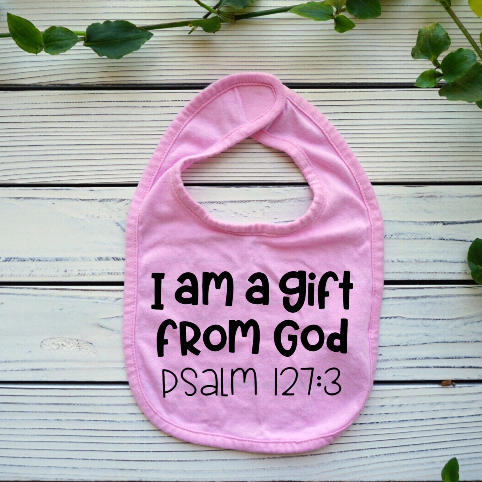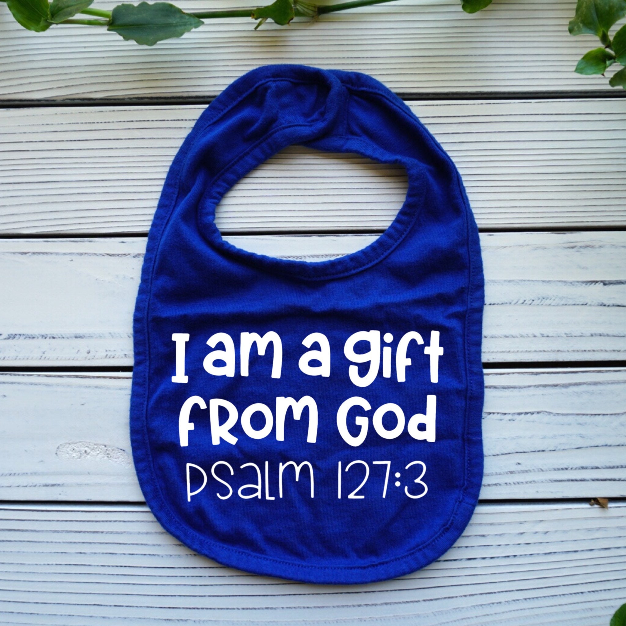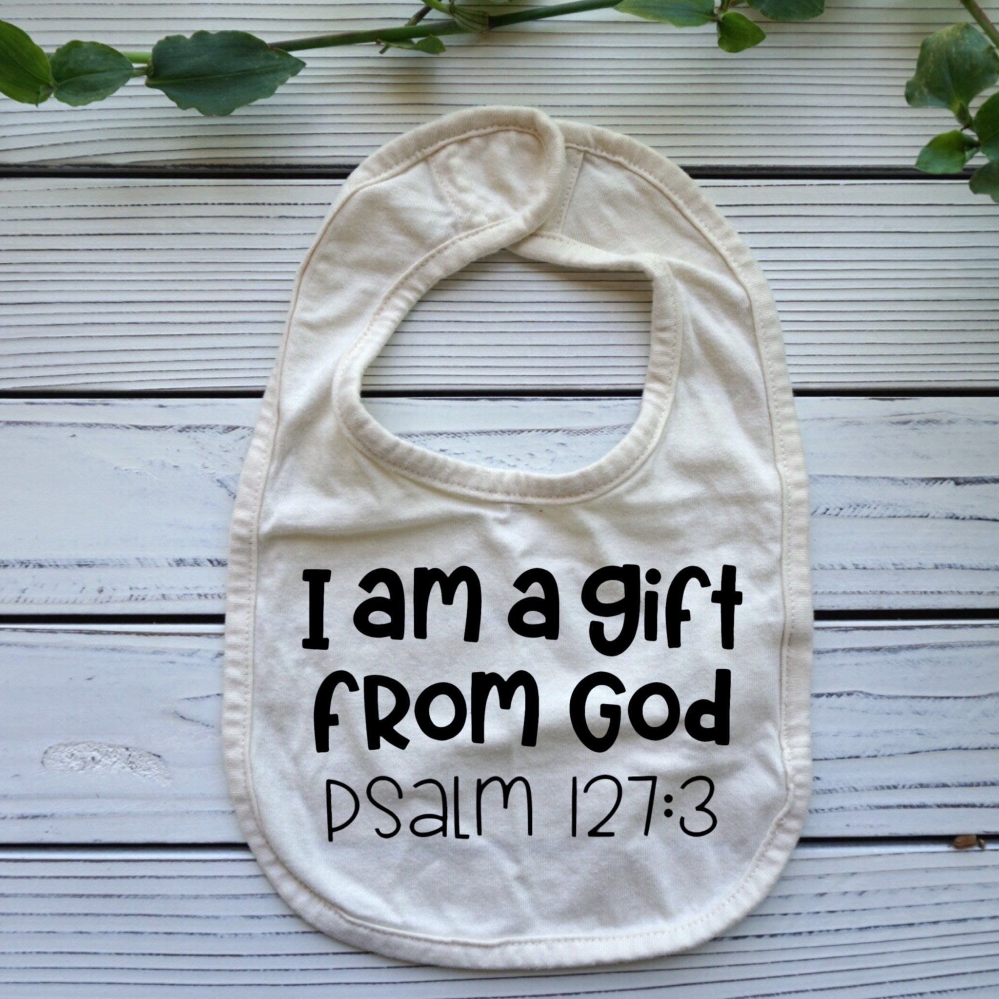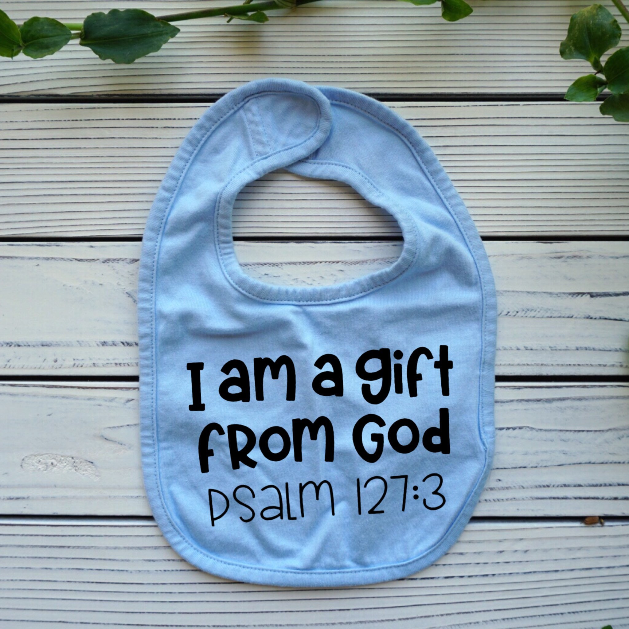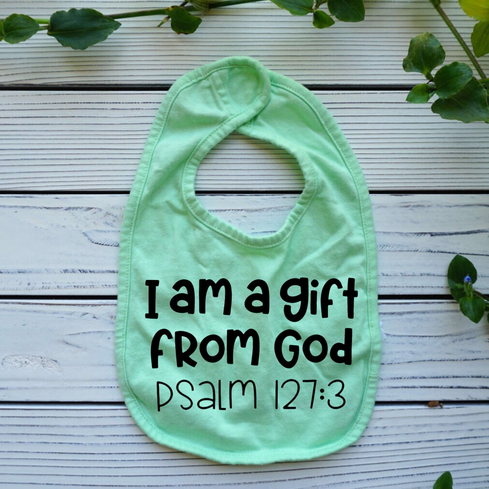 Christian baby bib featuring I am a Gift from God in a soft, lightweight baby bib. Your baby or grandbaby will be the talk of the Sunday School nursery dressed in this Bible-blazened baby bib! Or wow the mom-to-be and claim the best baby shower gift prize by pairing this outfit with several of our other Bible baby outfits to make a set. This design would also work well for a family waiting to find out the gender of the baby and prefer gender-neutral baby clothes.