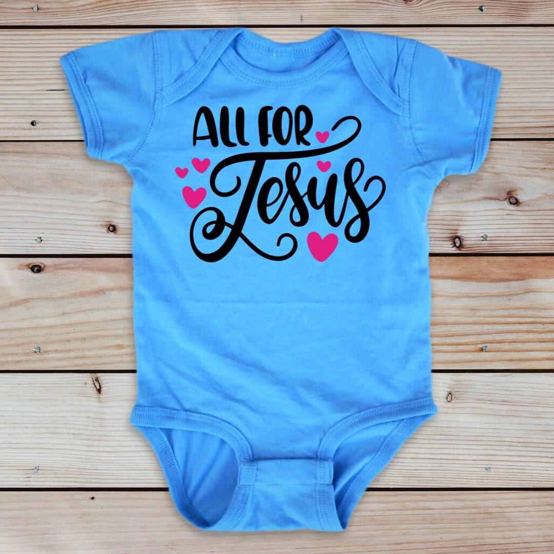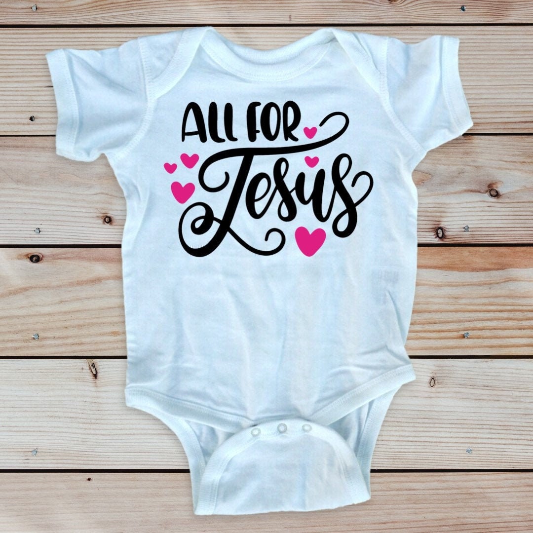Christian baby bodysuit featuring an All for Jesus design with pink hearts on a softstyle infant bodysuit. Your baby or grandbaby will be the talk of the Sunday School nursery dressed in this Bible-blazened infant bodysuit! Or wow the mom-to-be and claim the best baby shower gift prize by pairing this outfit with several of our other Bible baby outfits to make a set.