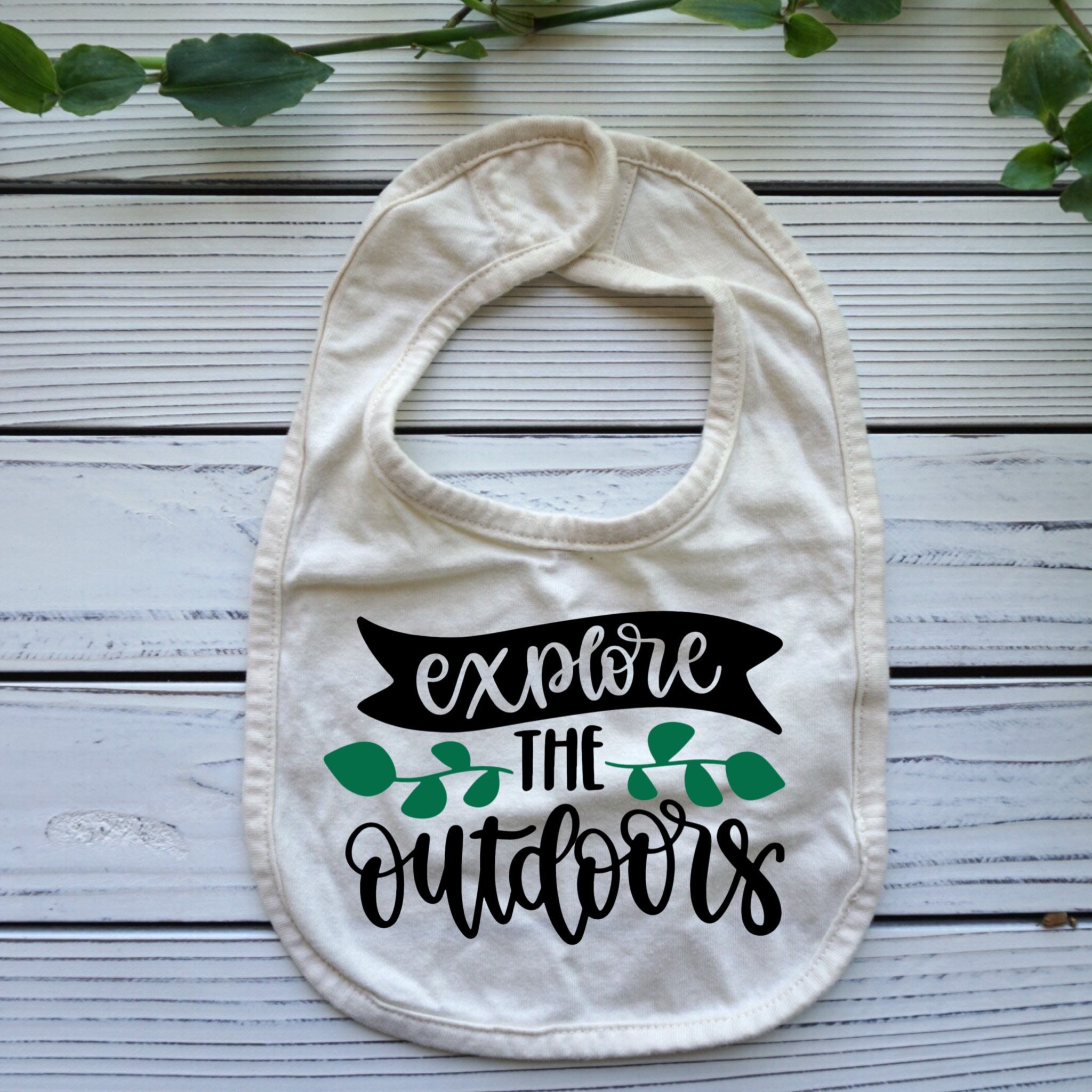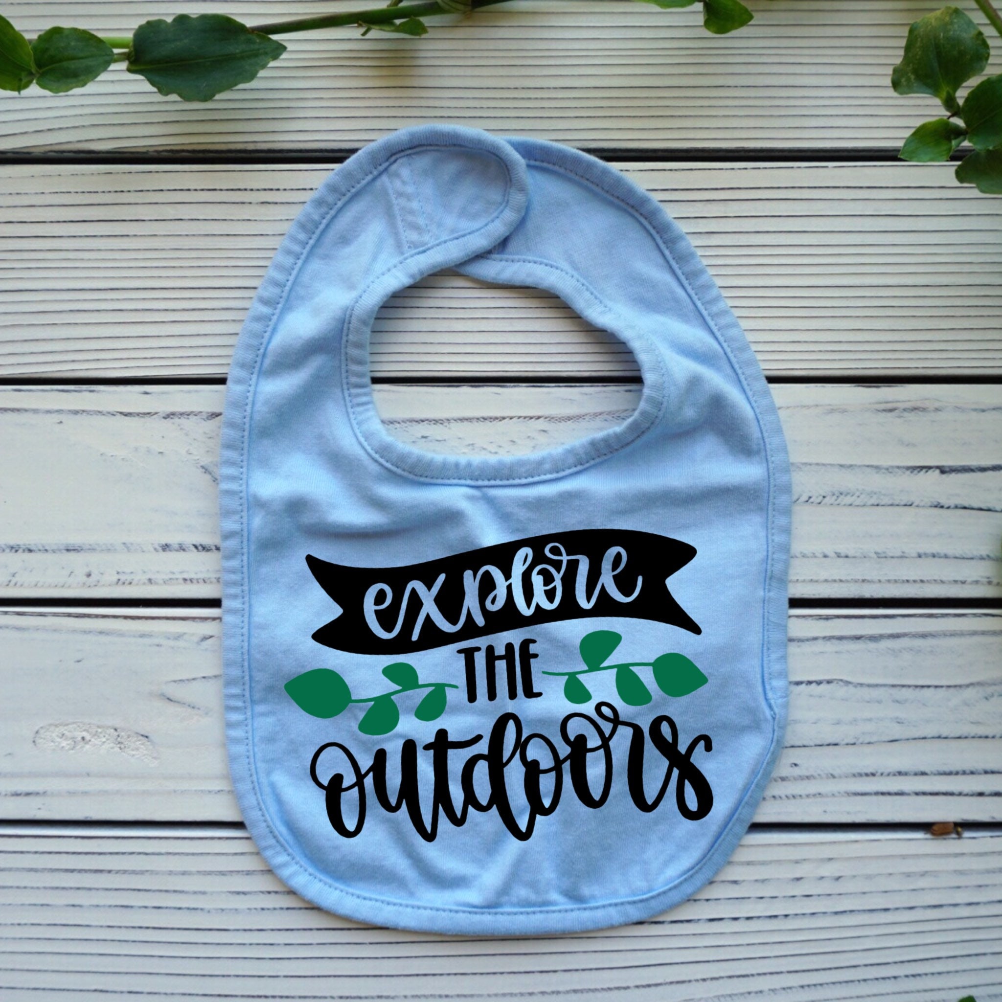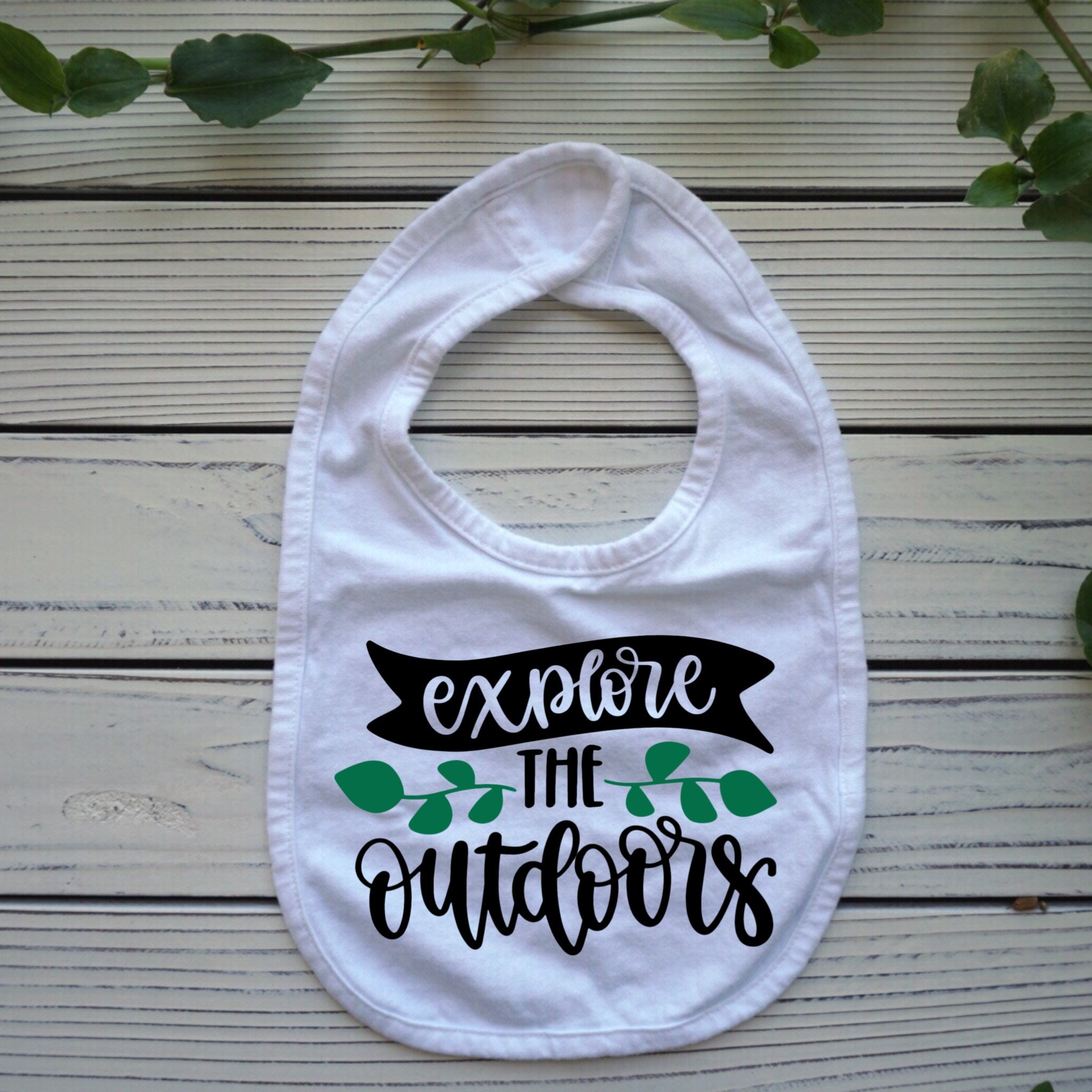 Wilderness baby bib featuring Explore the Outdoors design on a soft, lightweight baby bib. Text can be white or black vinyl. Wow the mom-to-be and claim the best baby shower gift prize with this outdoors themed baby gift. This design would also work well for a family waiting to find out the gender of the baby and prefer gender-neutral baby clothes.