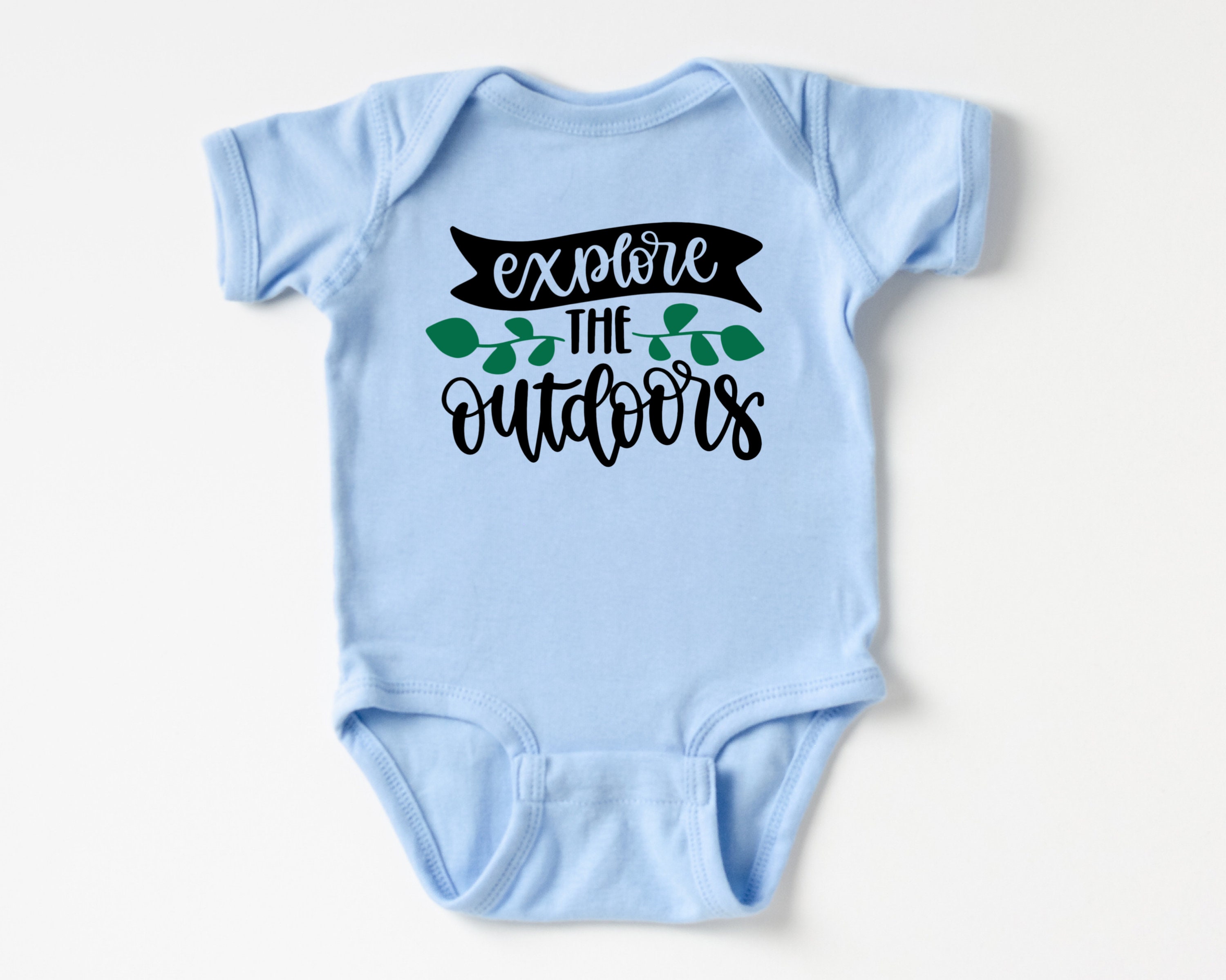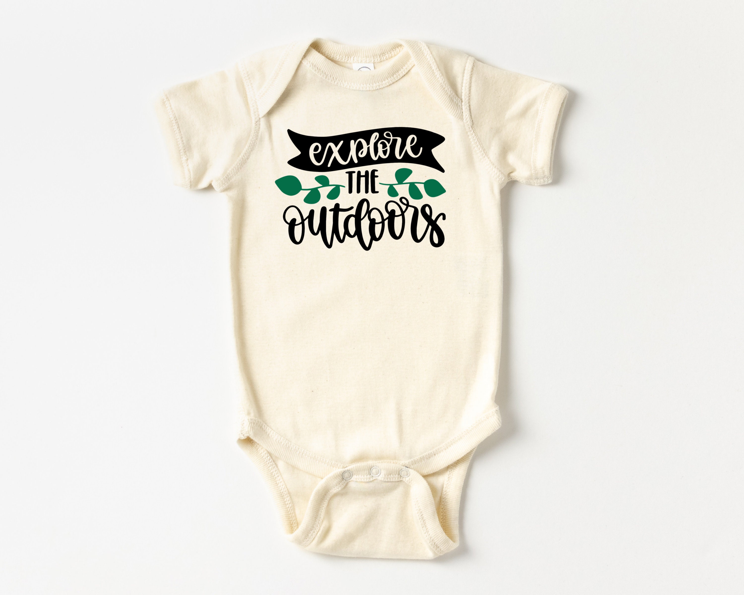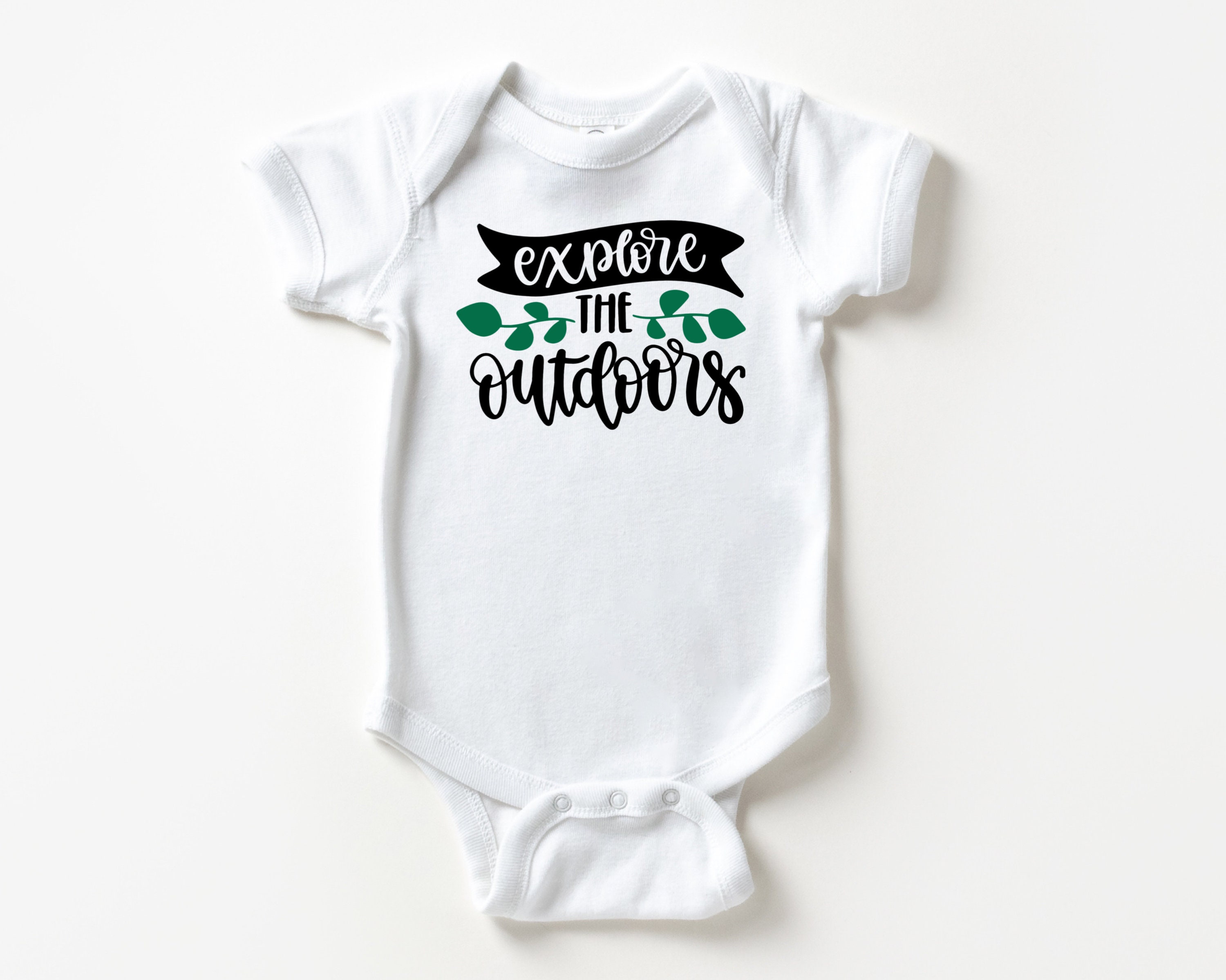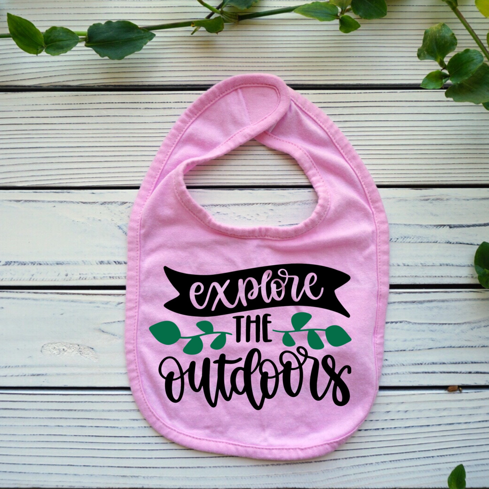 Wilderness baby bib featuring Explore the Outdoors design on a soft, lightweight baby bib. Text can be white or black vinyl. Wow the mom-to-be and claim the best baby shower gift prize with this outdoors themed baby gift. This design would also work well for a family waiting to find out the gender of the baby and prefer gender-neutral baby clothes.