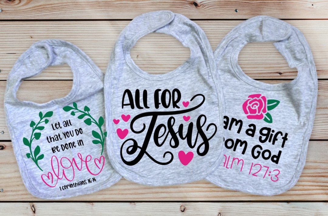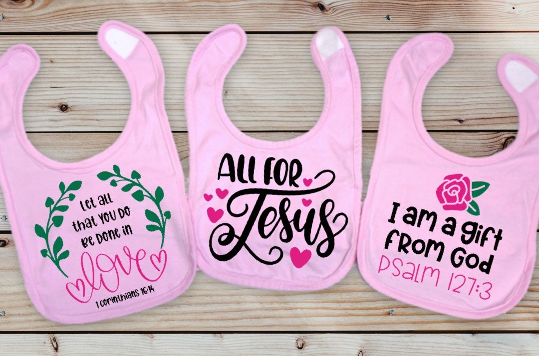Christian baby bibs featuring Bible verses on soft, lightweight baby bibs. Your baby or grandbaby will be the talk of the Sunday School nursery dressed in this Bible-blazened baby bibs! Or wow the mom-to-be and claim the best baby shower gift prize by pairing this outfit with several of our other Bible baby outfits. These designs would also work well for a family waiting to find out the gender of the baby and prefer gender-neutral baby clothes.