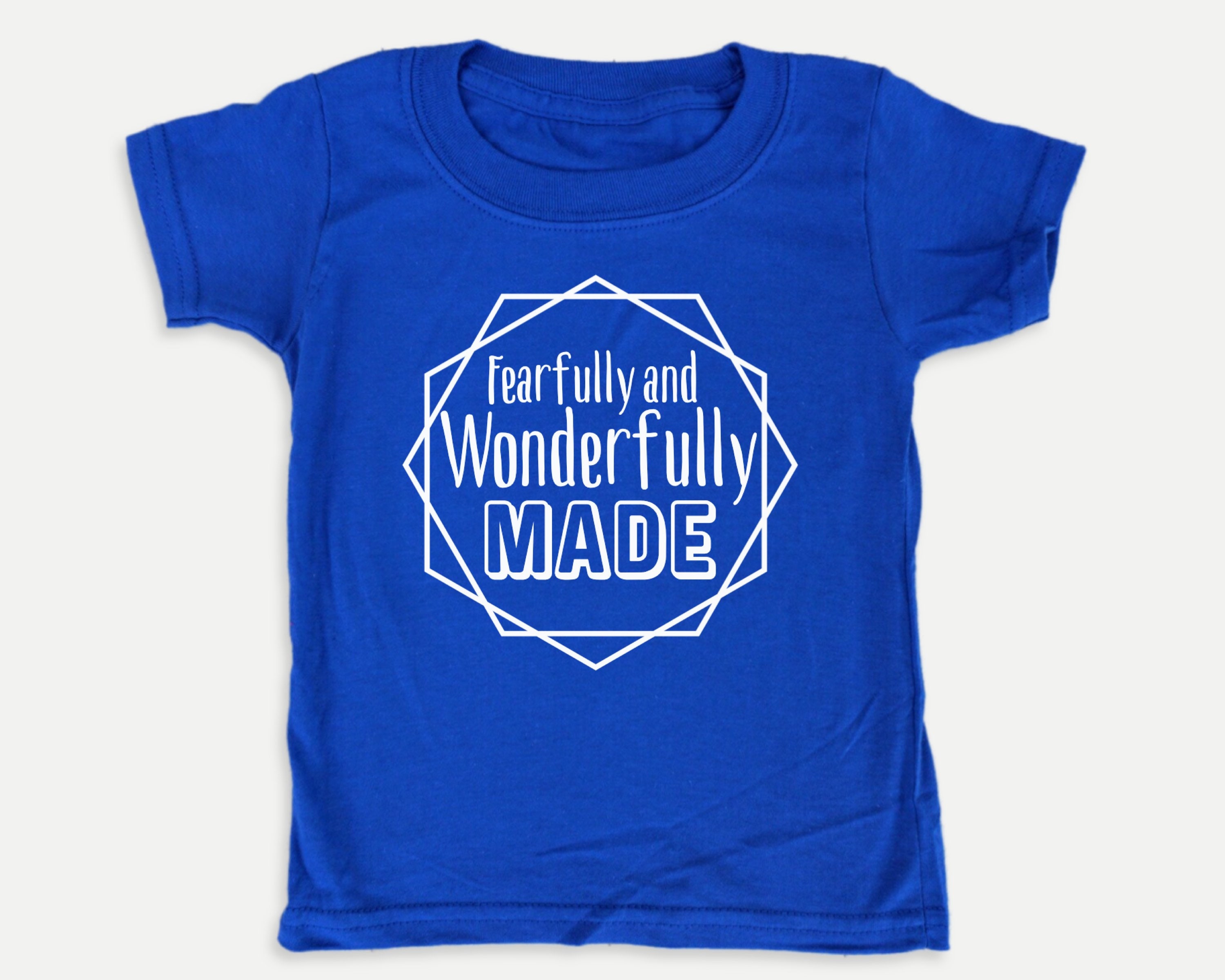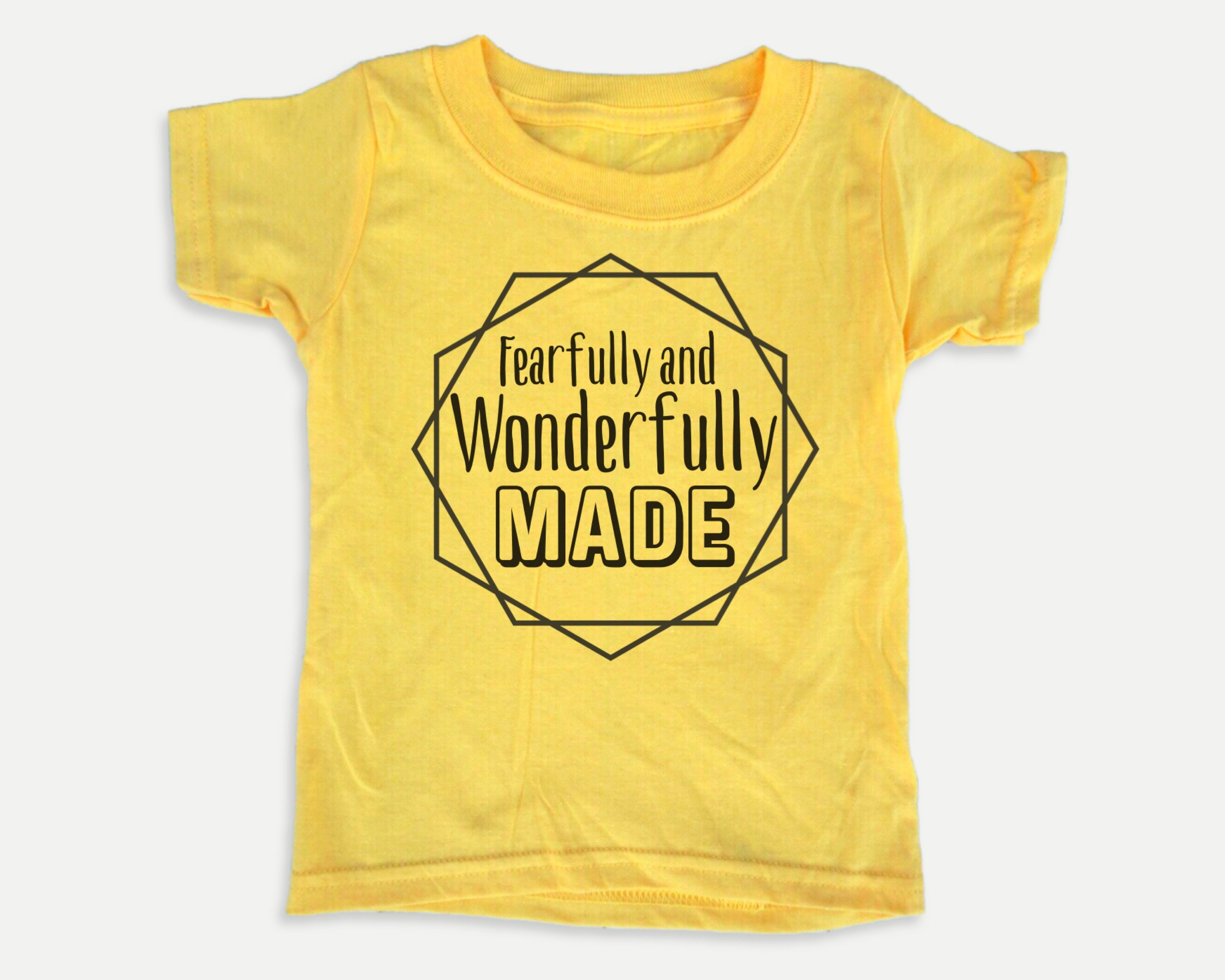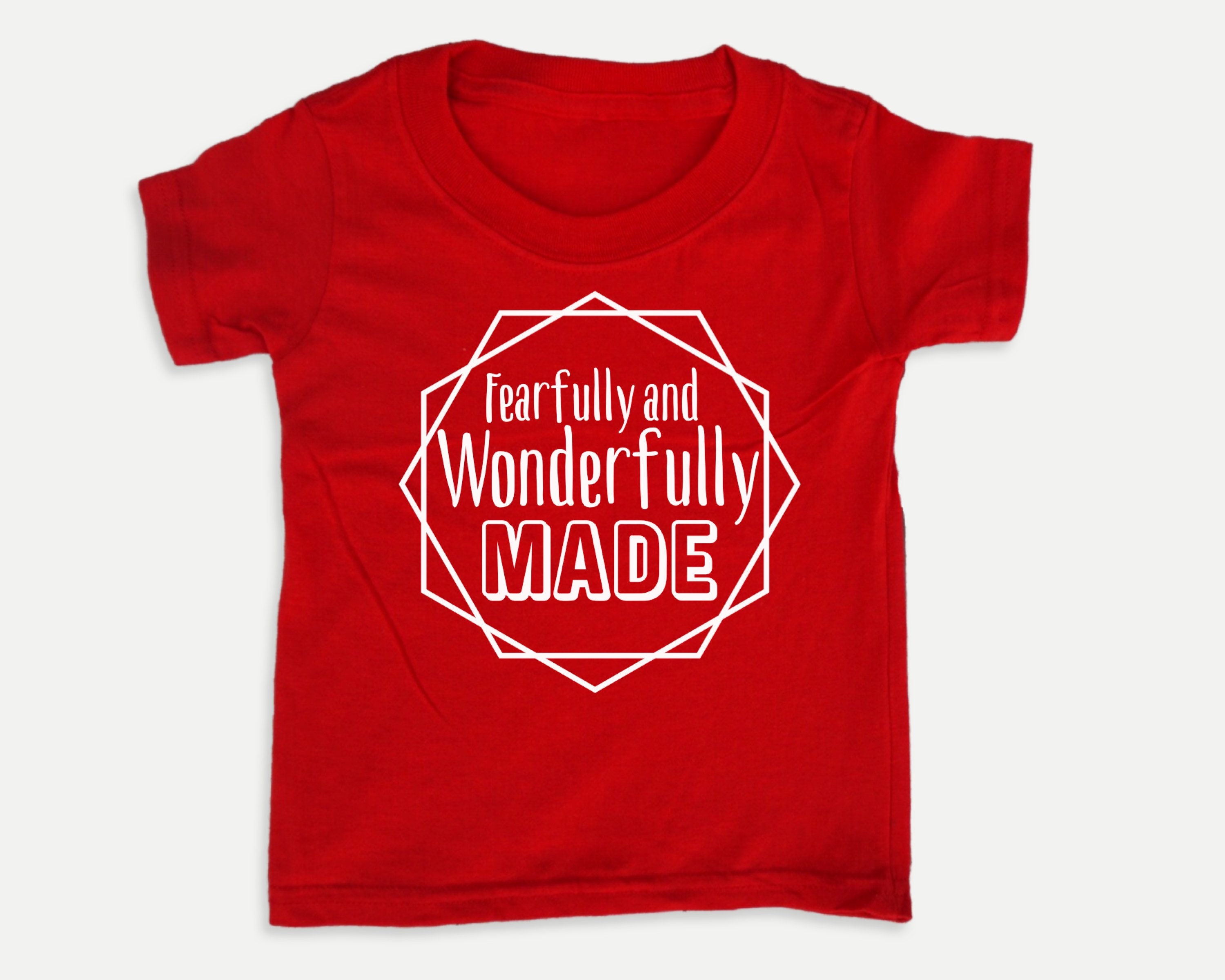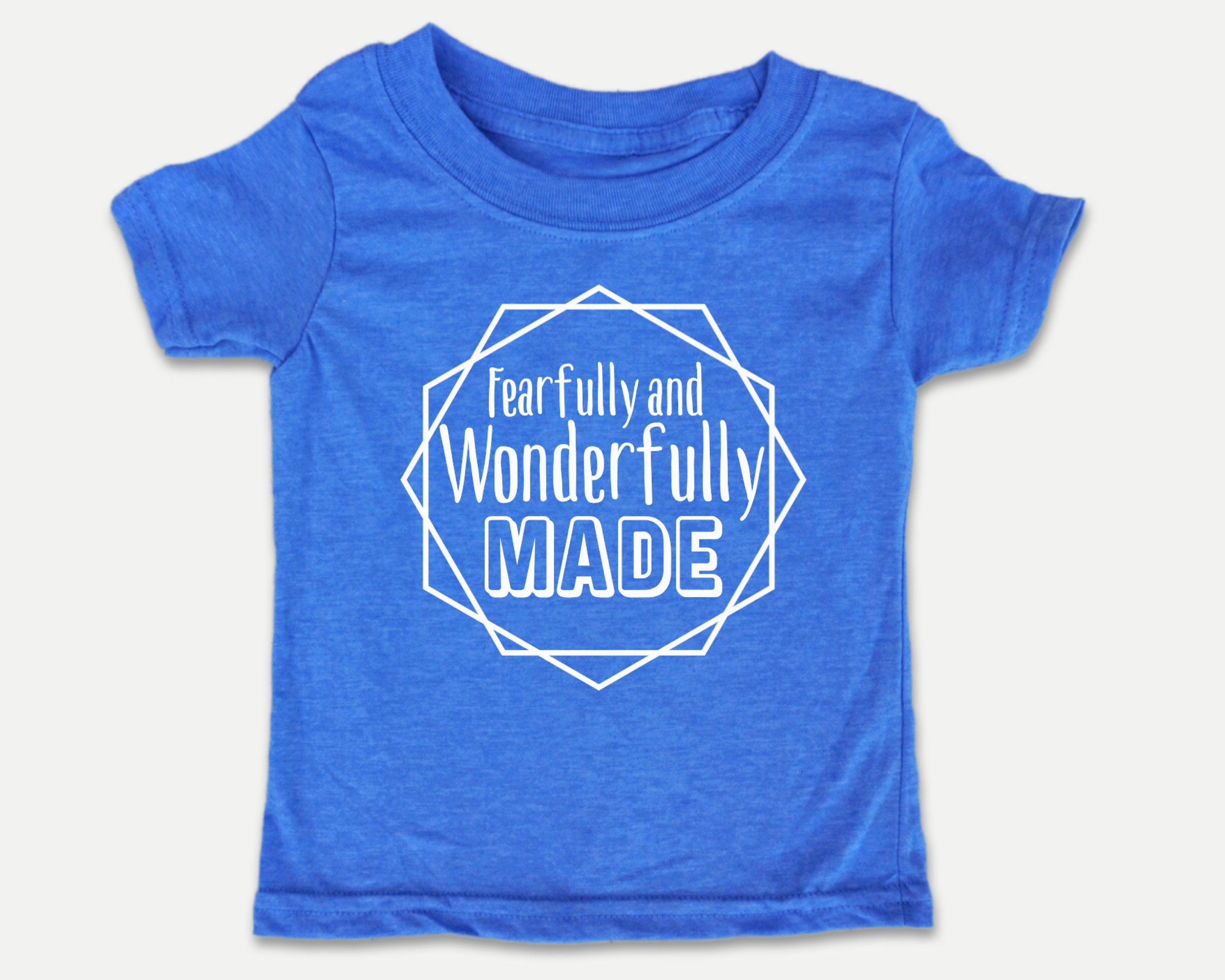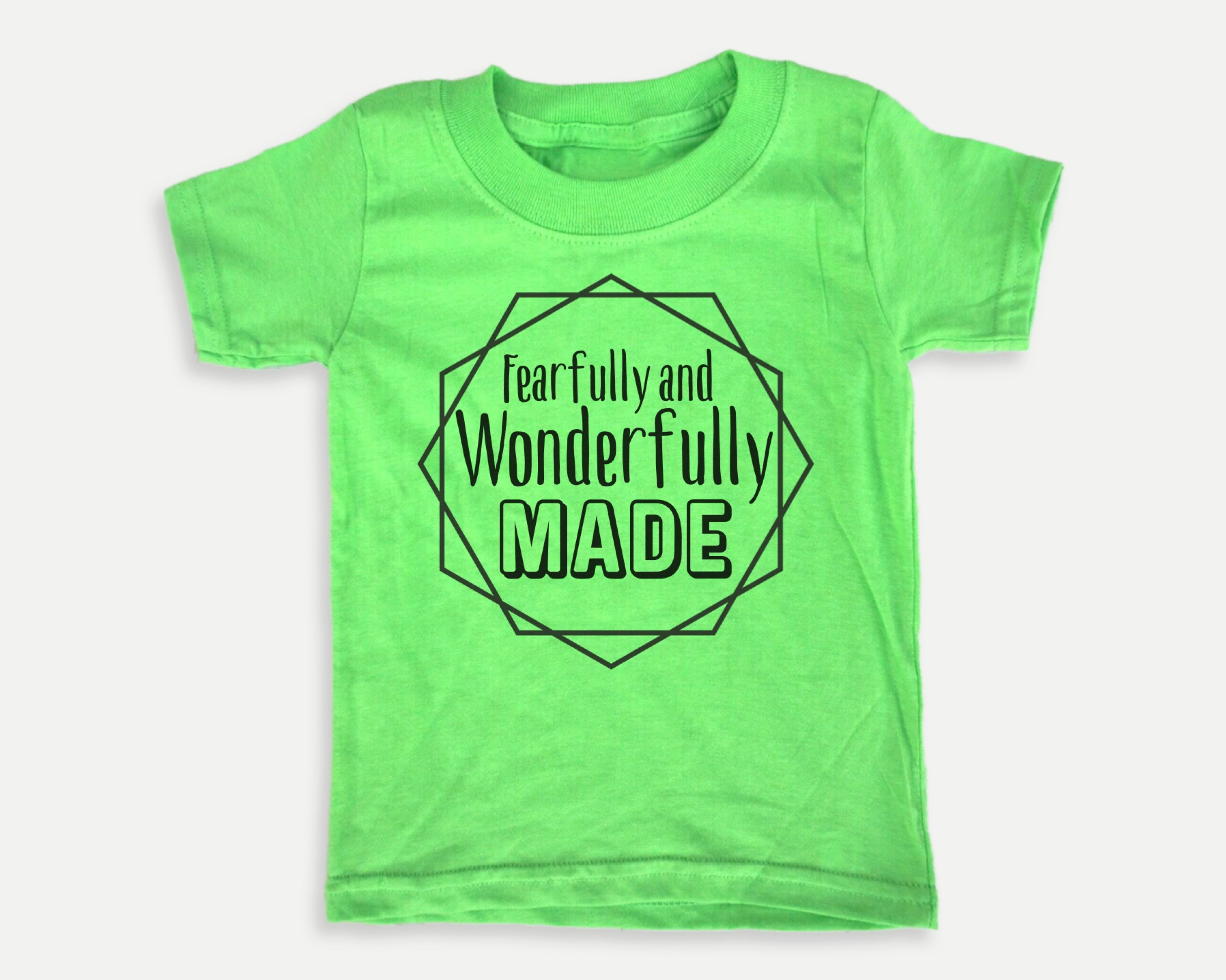 Christian toddler tshirt featuring "Fearfully and Wonderfully Made", in a softstyle toddler tee. Your child or grandchild will be the talk of the Sunday School nursery dressed in this Bible-blazened infant bodysuit! Or wow the mom-to-be and claim the best baby shower gift prize by pairing this outfit with several of our other Bible kid and baby outfits to make a set. This design would also work well for a family waiting to find out the gender of the baby and prefer gender-neutral baby clothes.