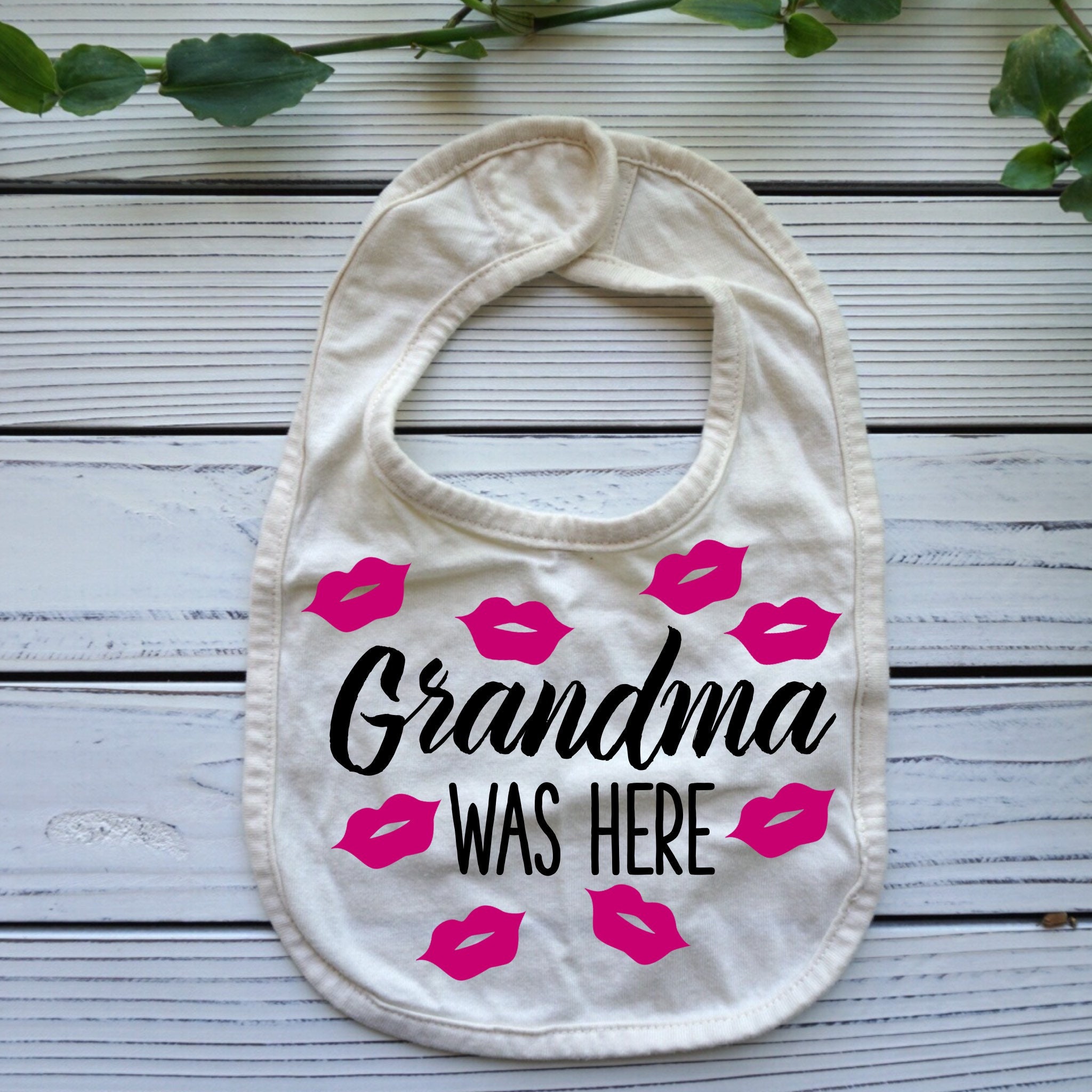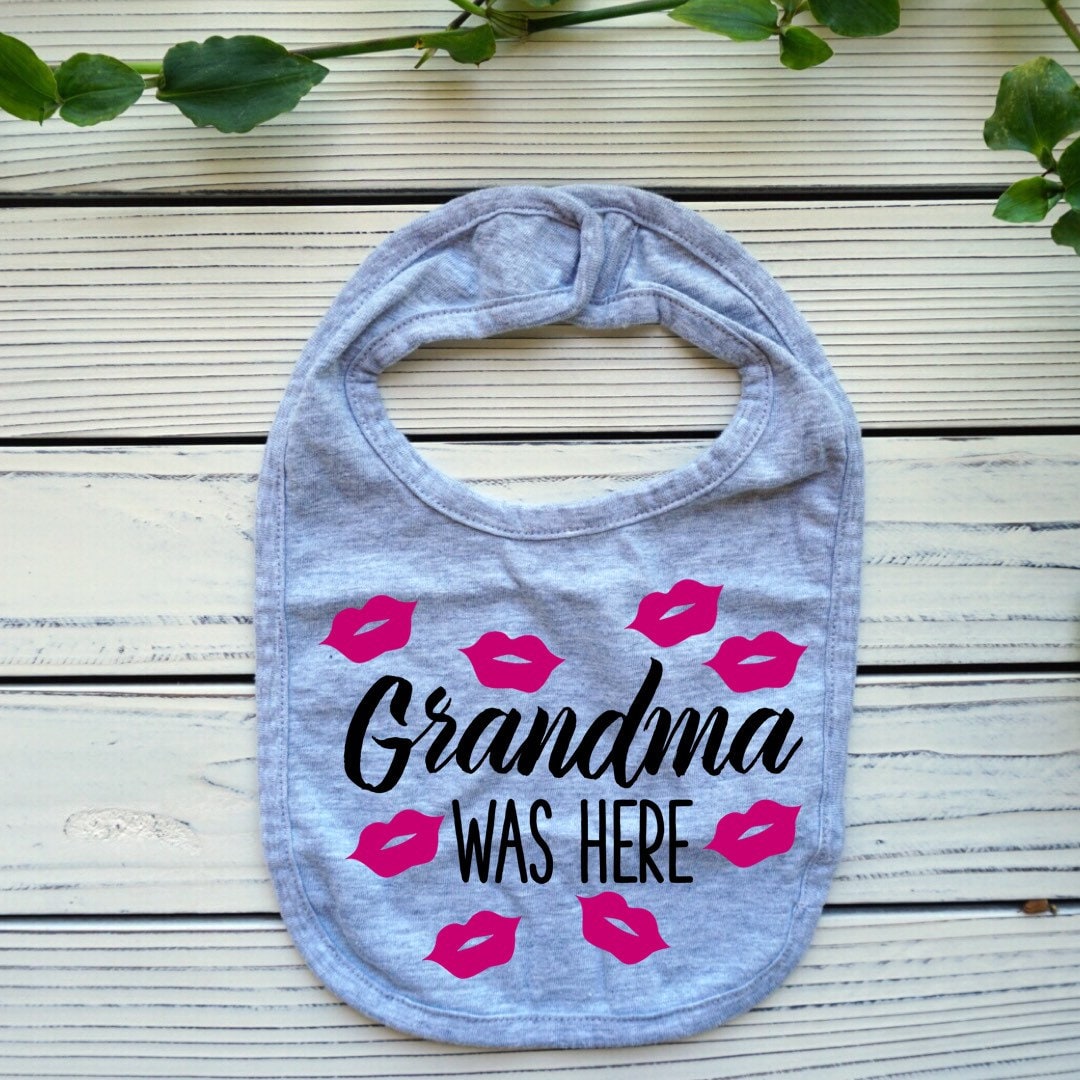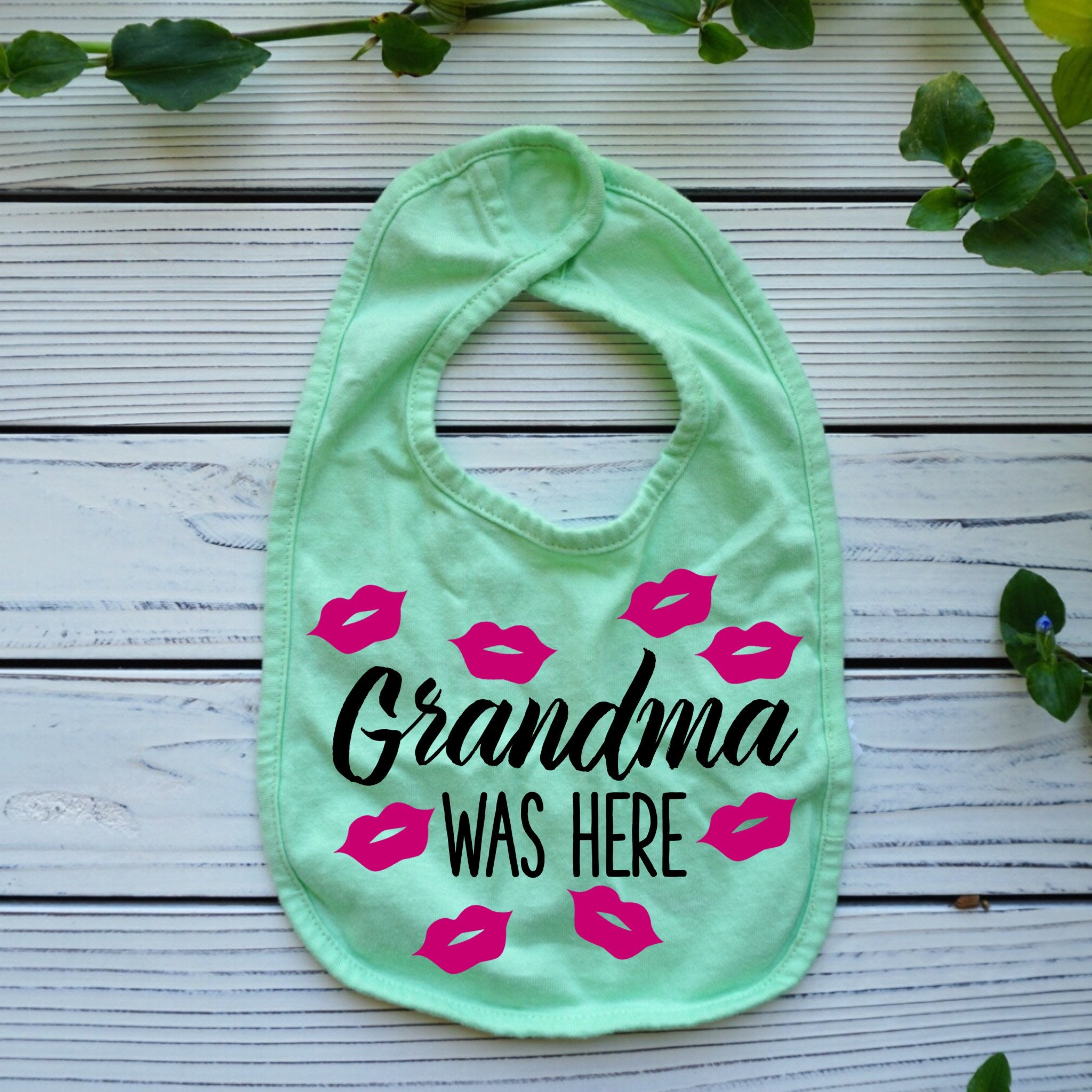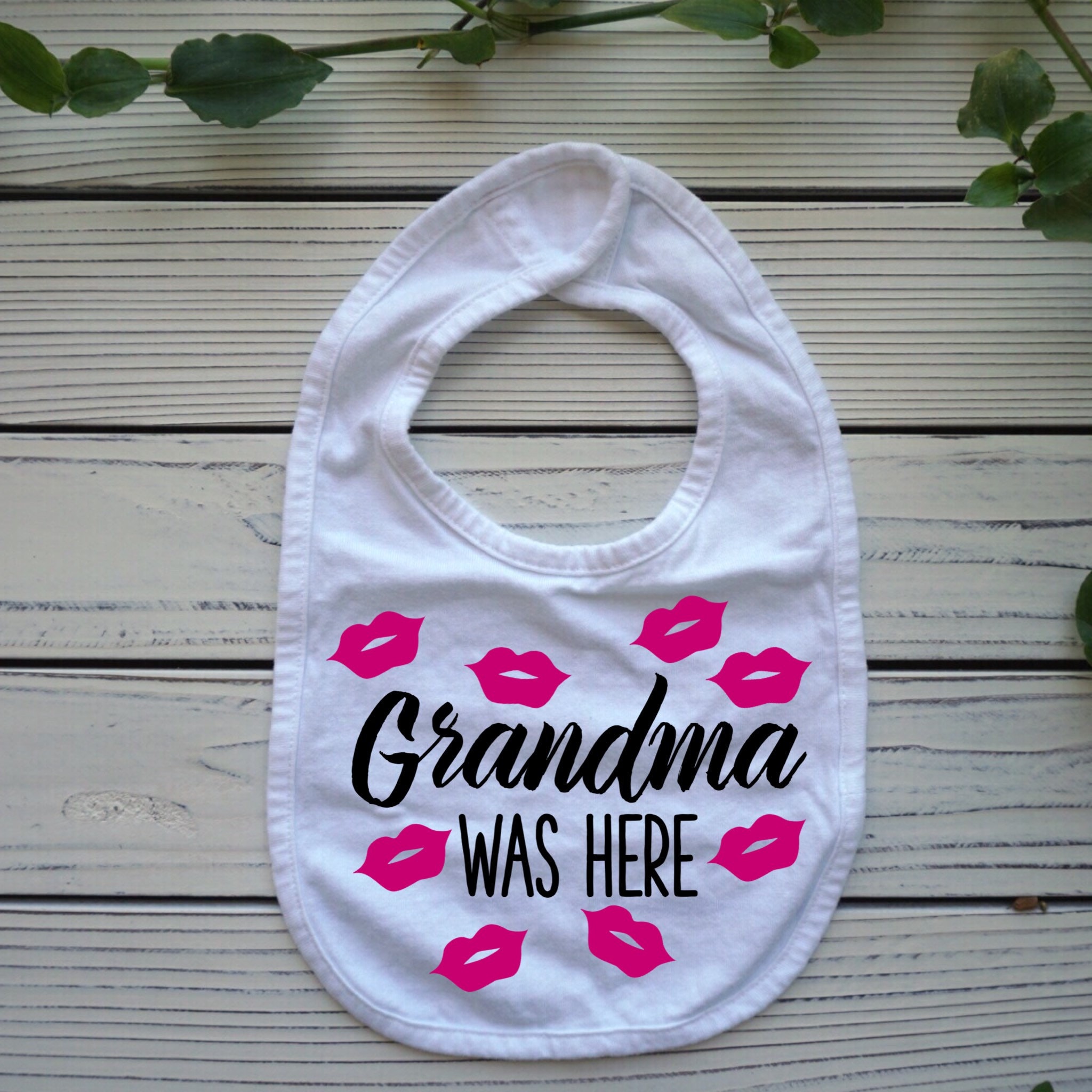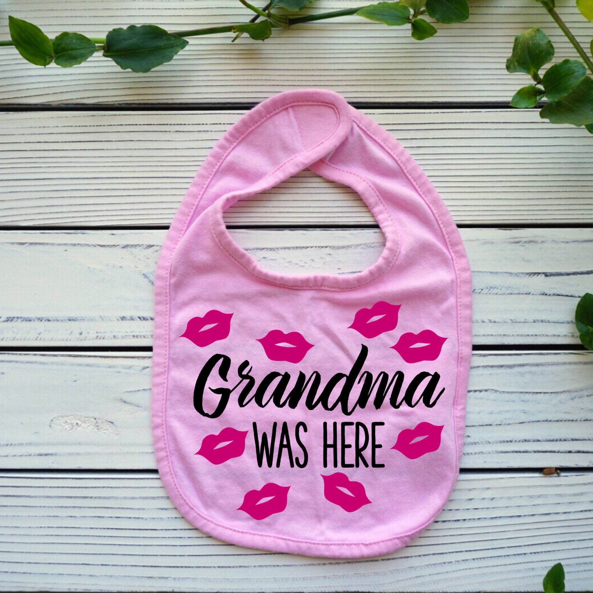 Grandma was here with kisses baby bib featuring a vinyl design on a soft, lightweight baby bib. Text can be white or black vinyl with pink hearts.