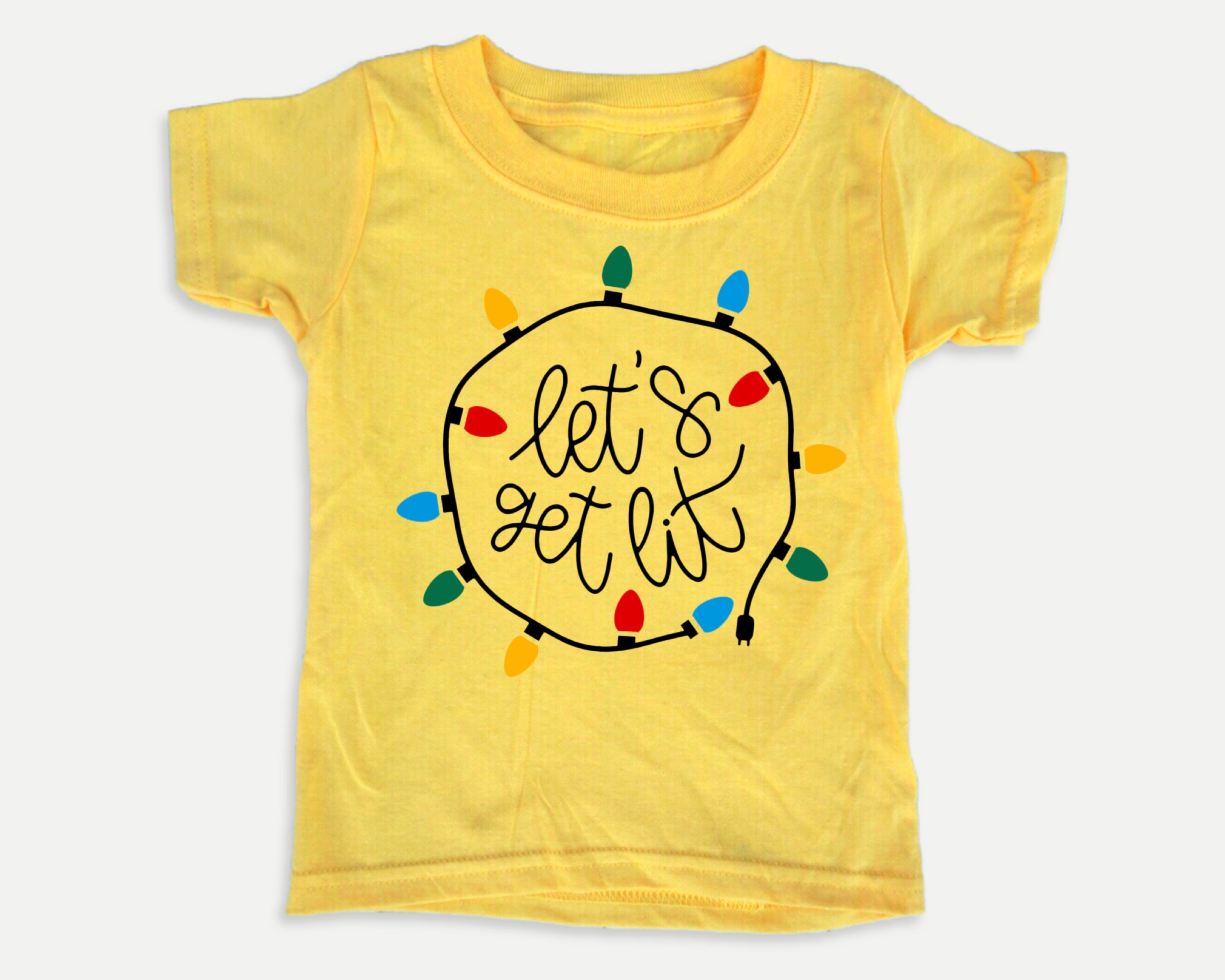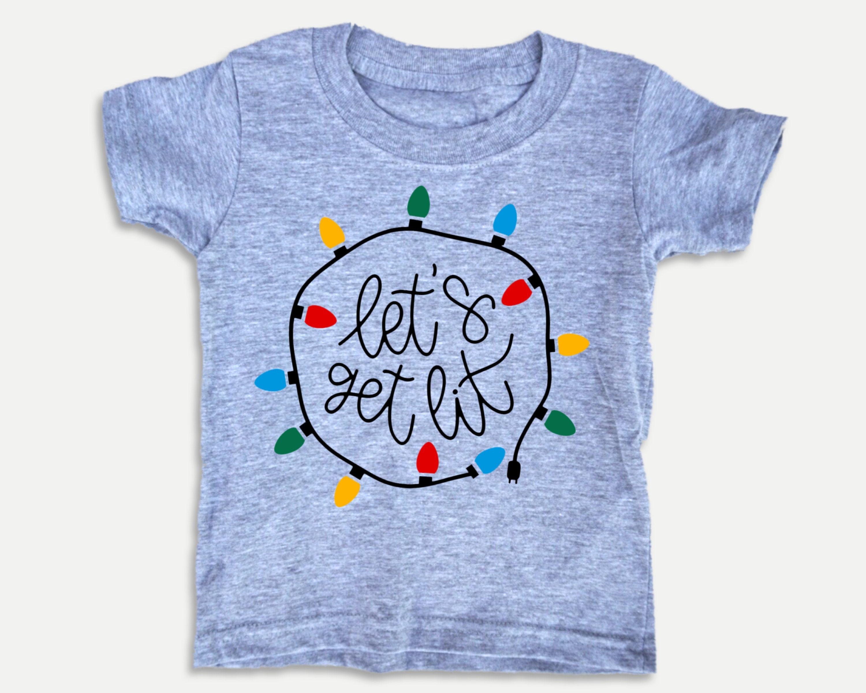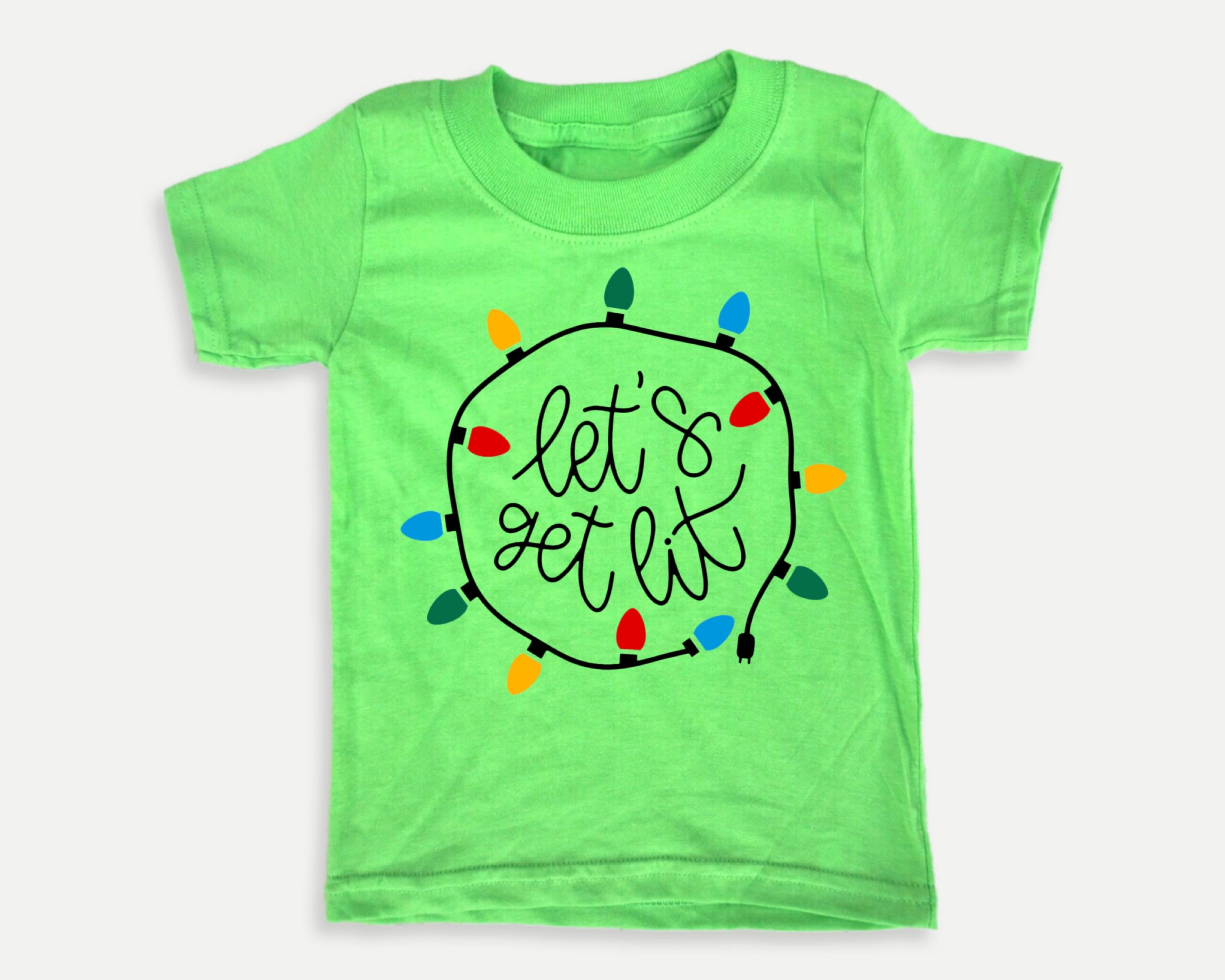 Funny Christmas toddler tee with Let’s Get Lit design in colorful and black vinyl.