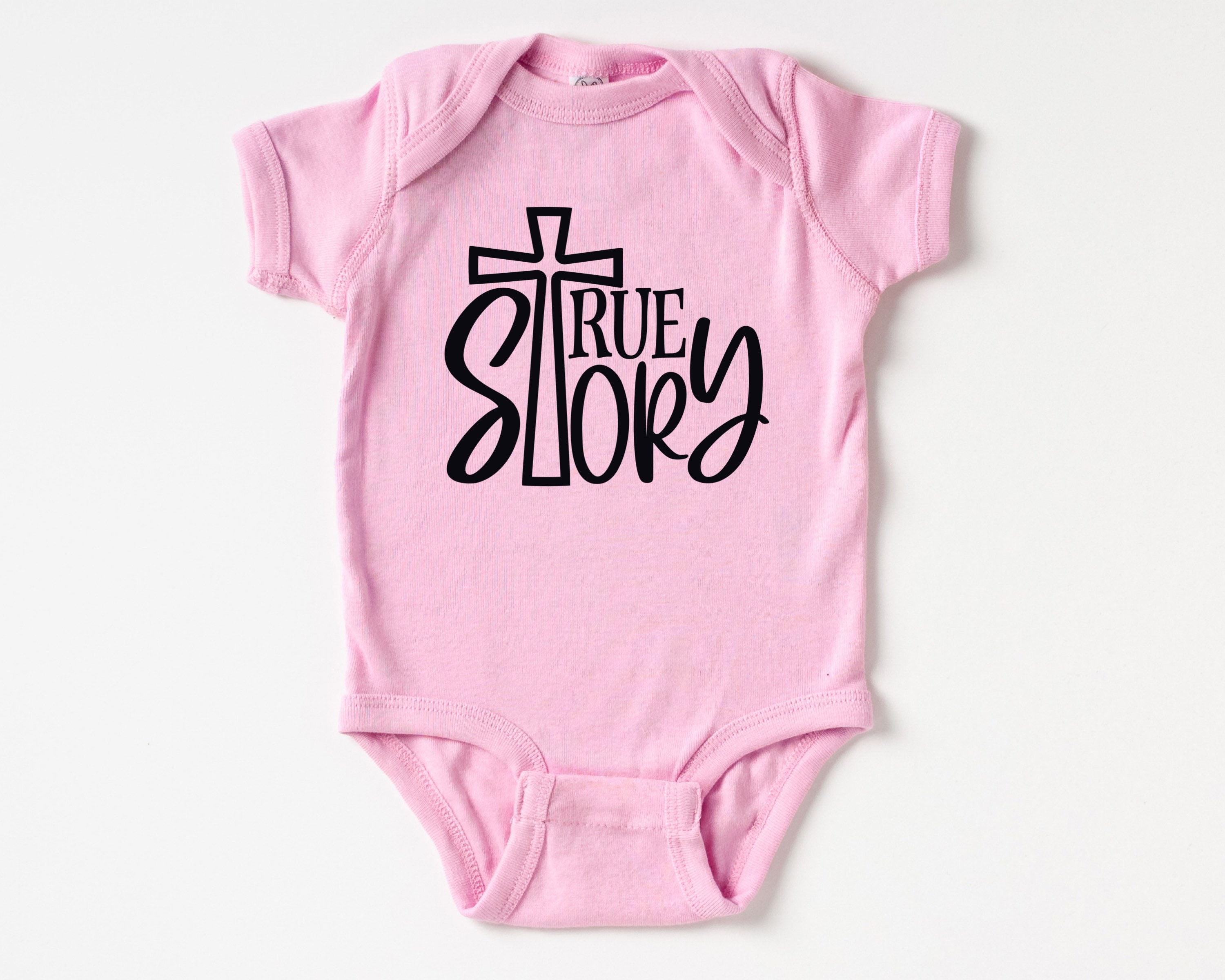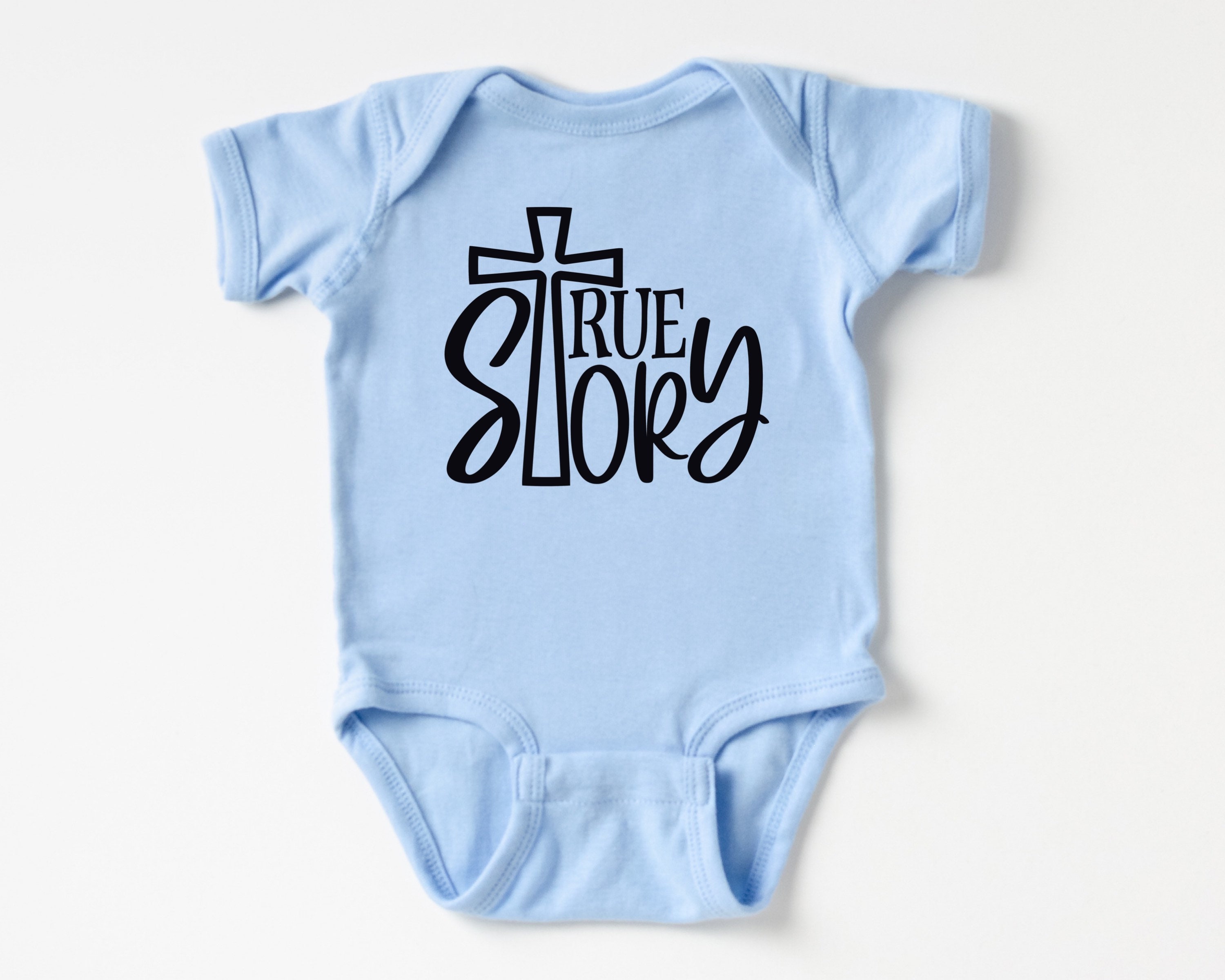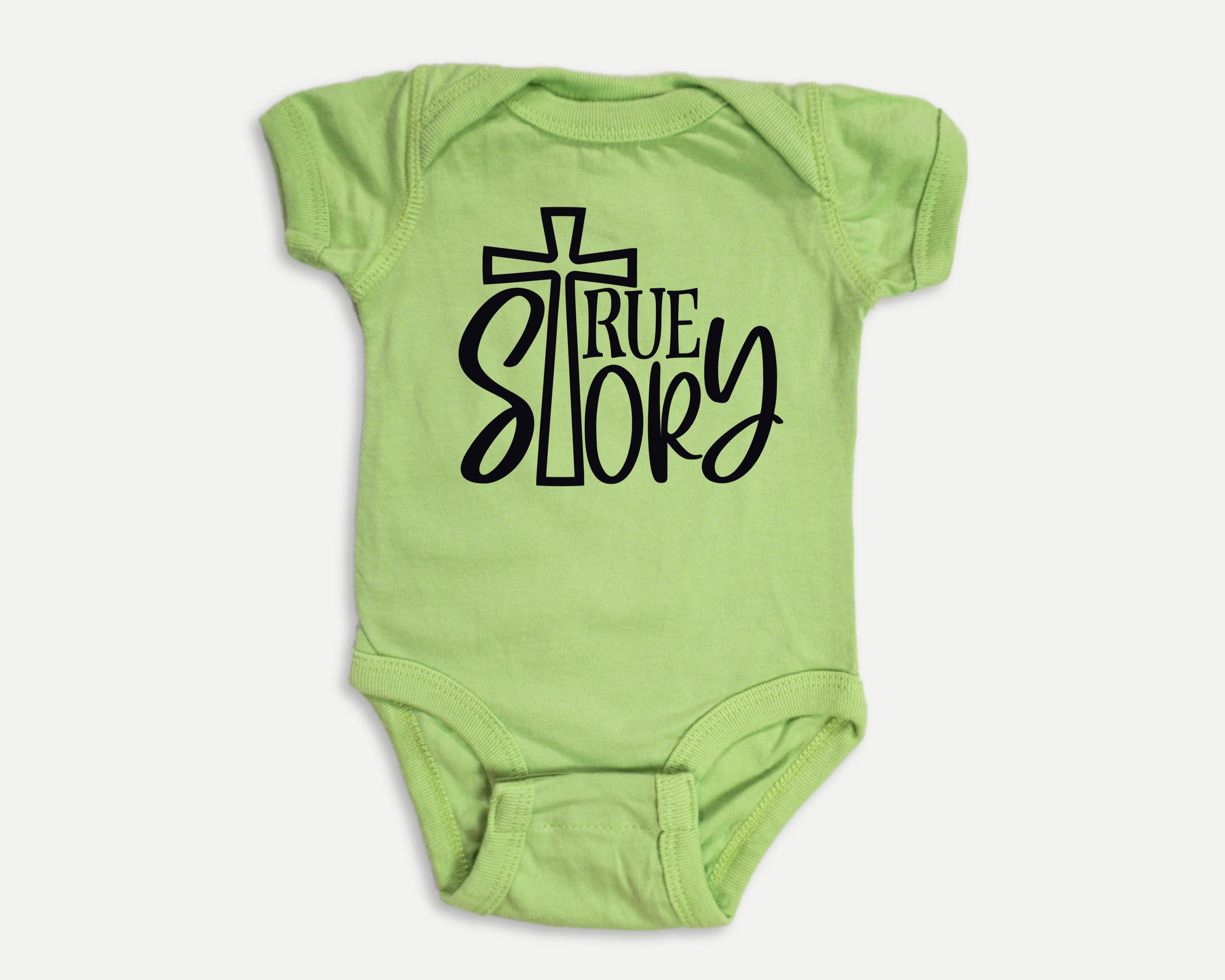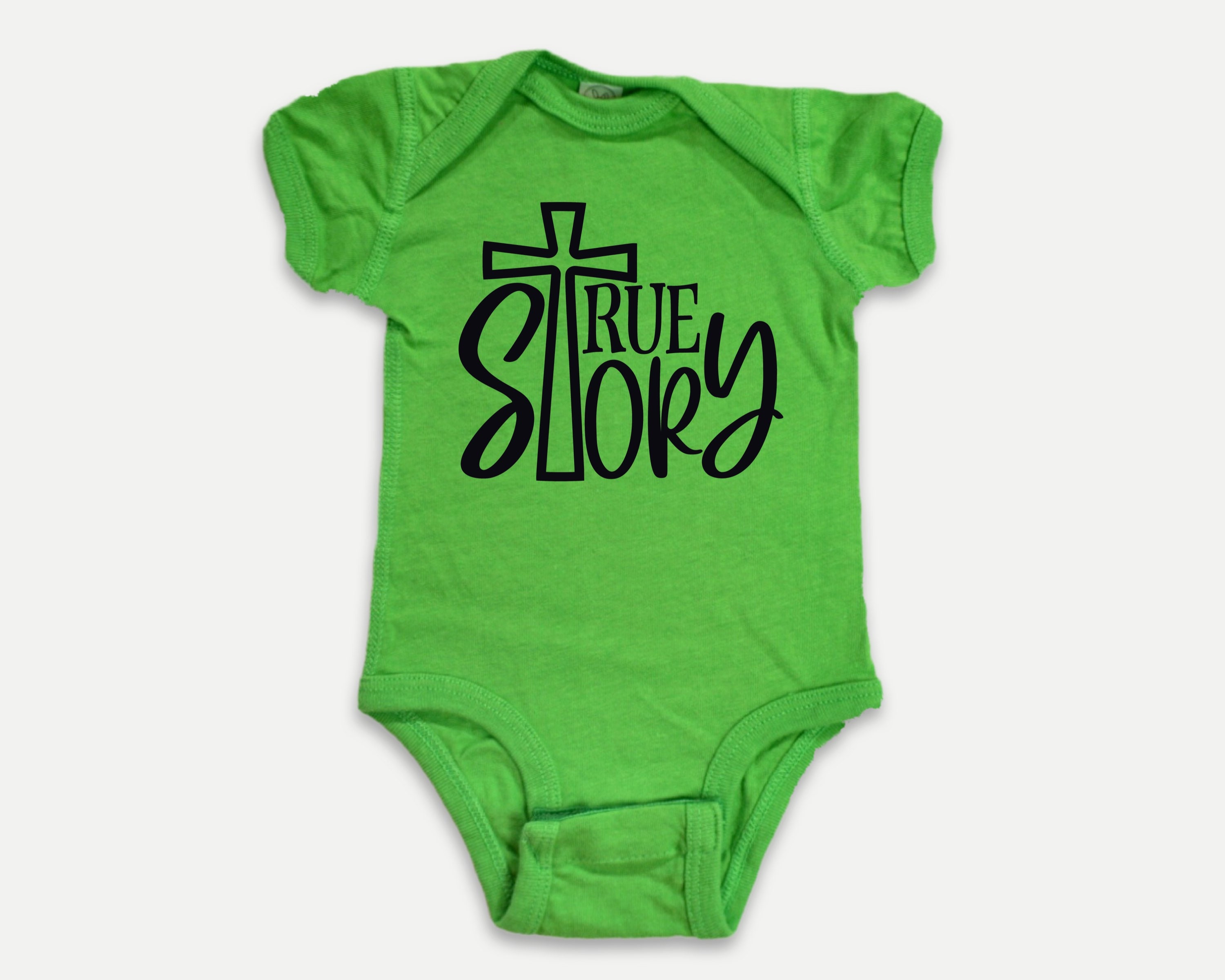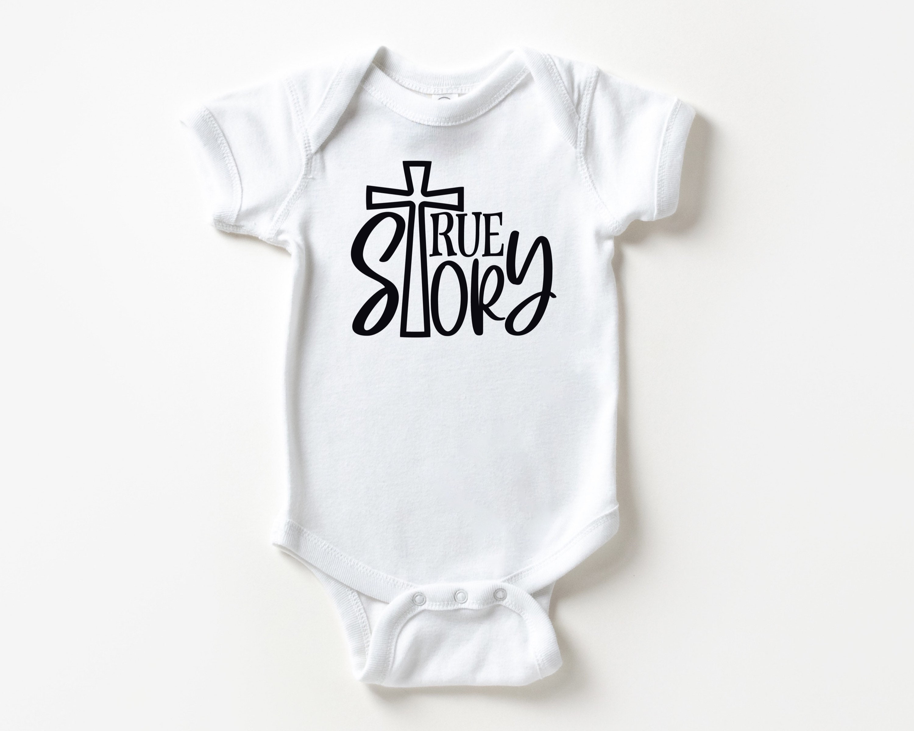 Christian baby bodysuit featuring a True Story design in white or black vinyl (see the color chart in the listing photos). on a softstyle infant bodysuit. Your baby or grandbaby will be the talk of the Sunday School nursery dressed in this Bible-blazened infant bodysuit! Or wow the mom-to-be and claim the best baby shower gift prize by pairing this outfit with several of our other Bible baby outfits to make a set. This design would also work well for a family waiting to find out the gender of the baby and prefer gender-neutral baby clothes.