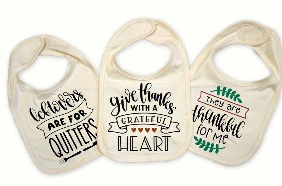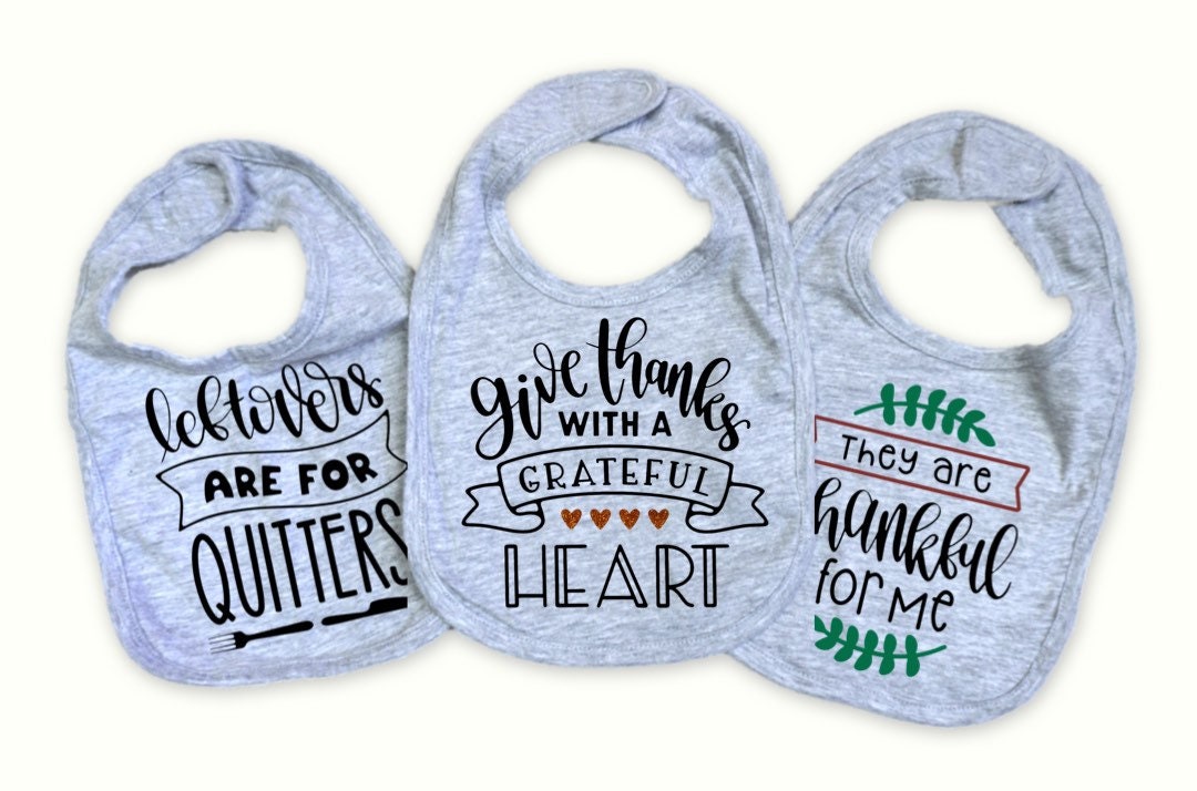 Thanksgiving baby bibs featuring holiday fun on soft, lightweight baby bibs.