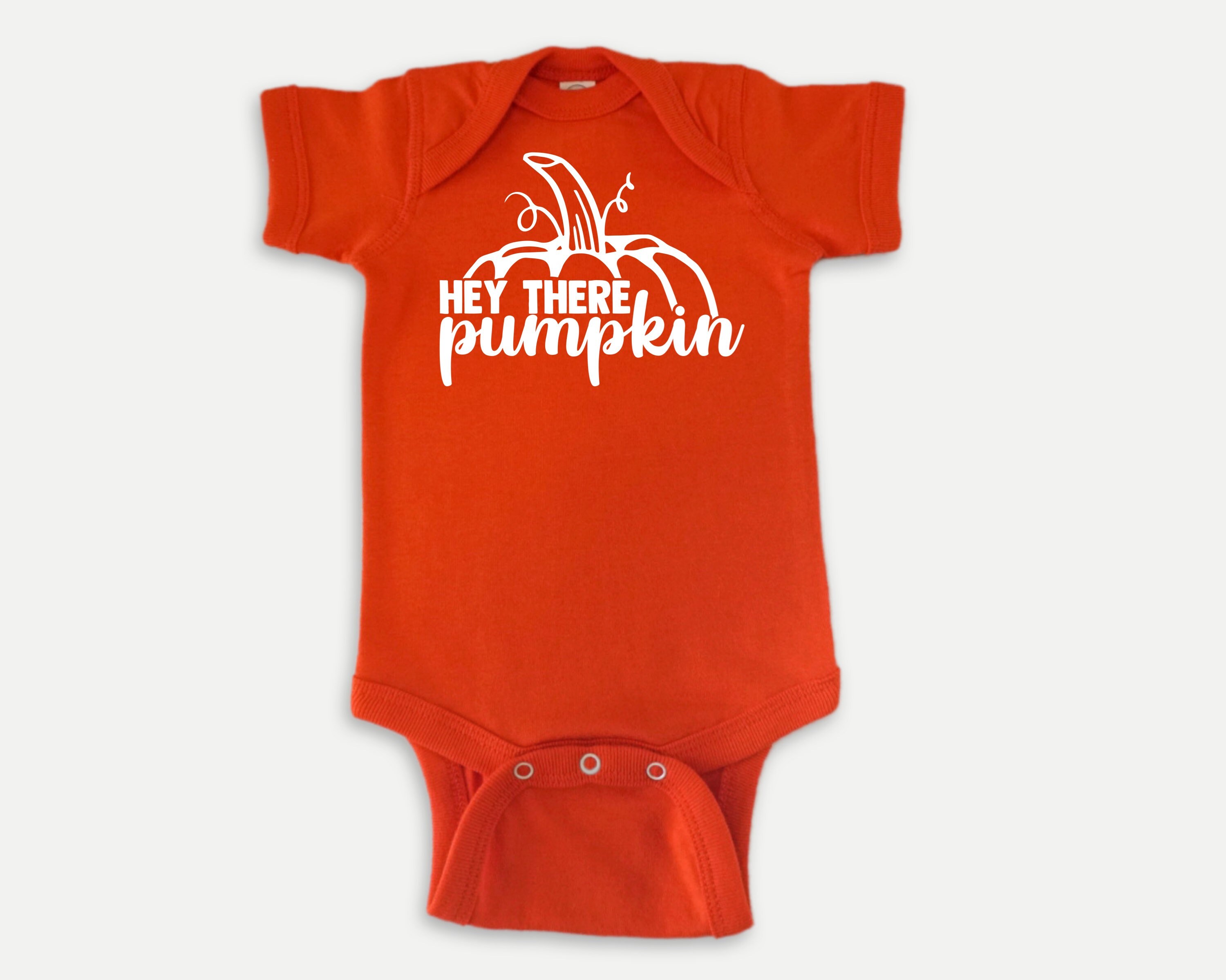 Hey There Pumpkin baby outfit made with a vinyl design on a soft infant bodysuit. Celebrate baby's first pumpkin patch in this soft cotton baby bodysuit. This fall infant bodysuit would be a perfect gift for a fall baby shower. For families waiting to find out the gender, this gender neutral pumpkin outfit is sure to delight.