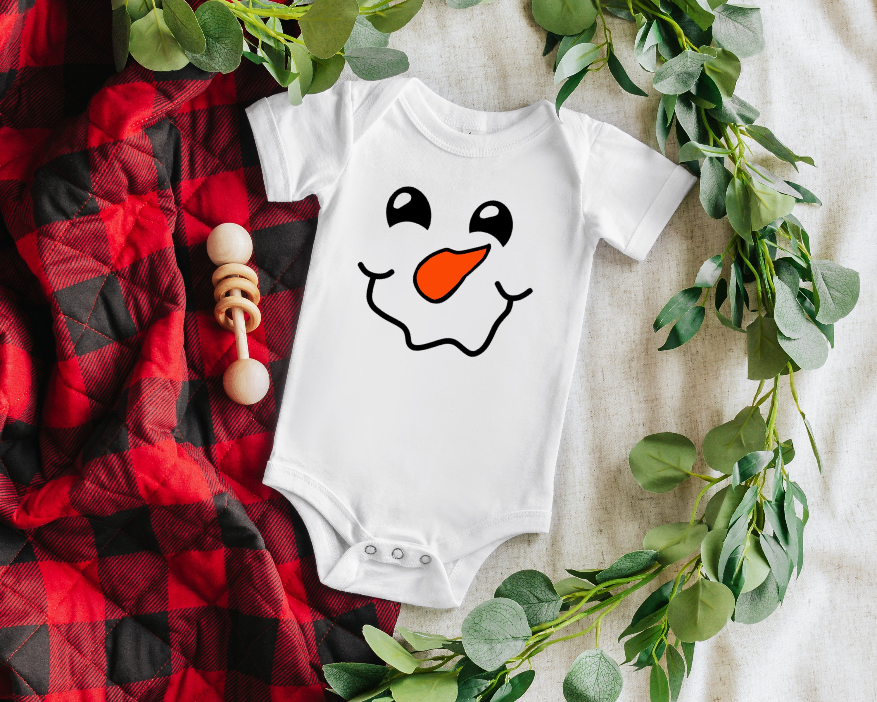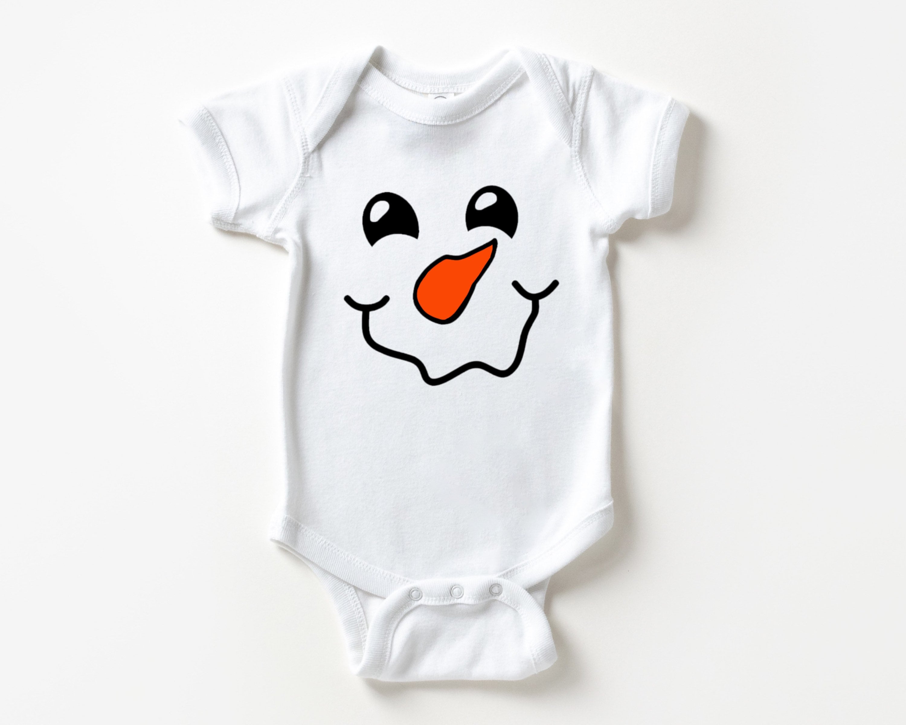 Soft baby bodysuit featuring a cute smiling snowman face design in colorful vinyl. This gender-neutral design would work perfectly as a winter holiday themed baby shower gift.