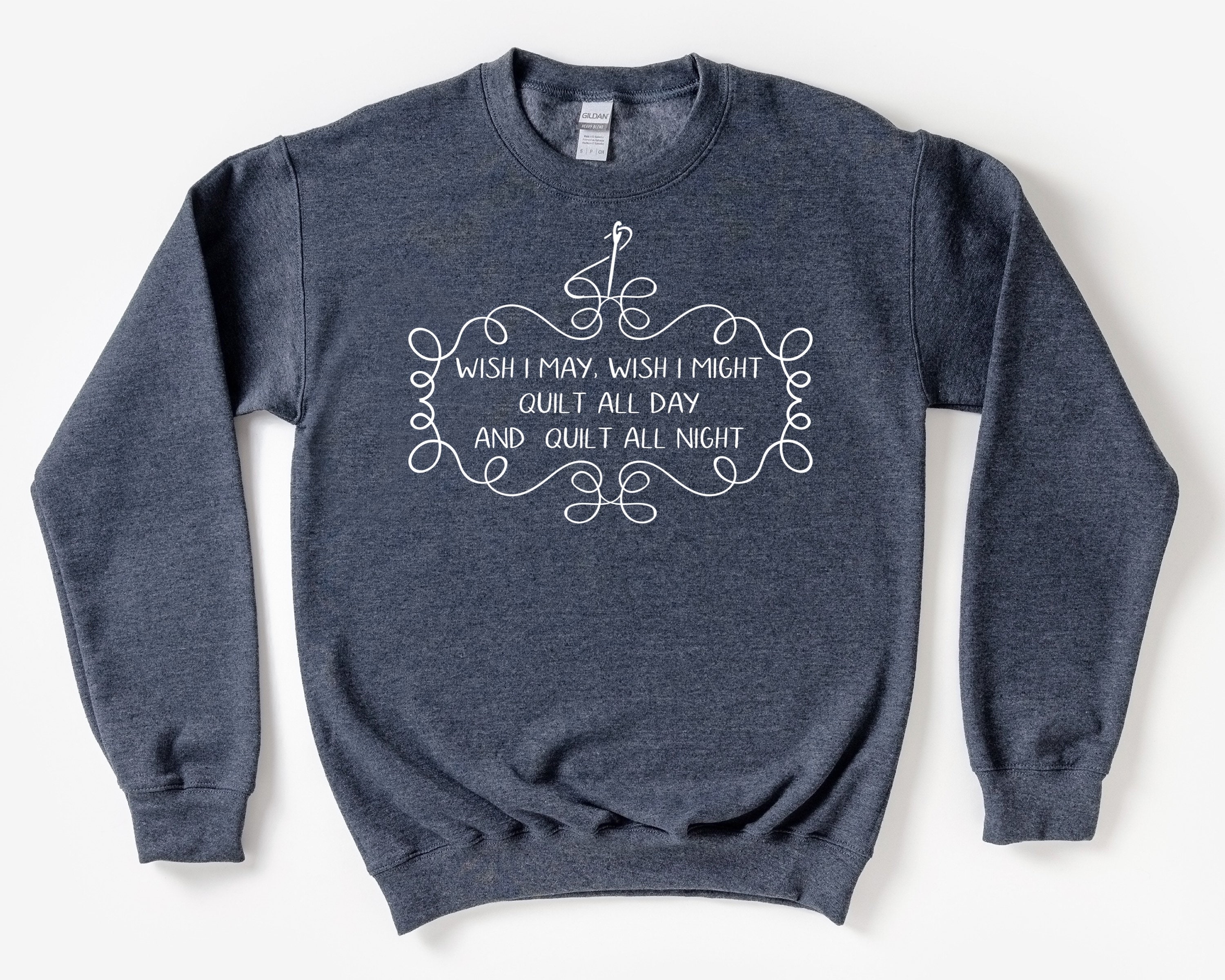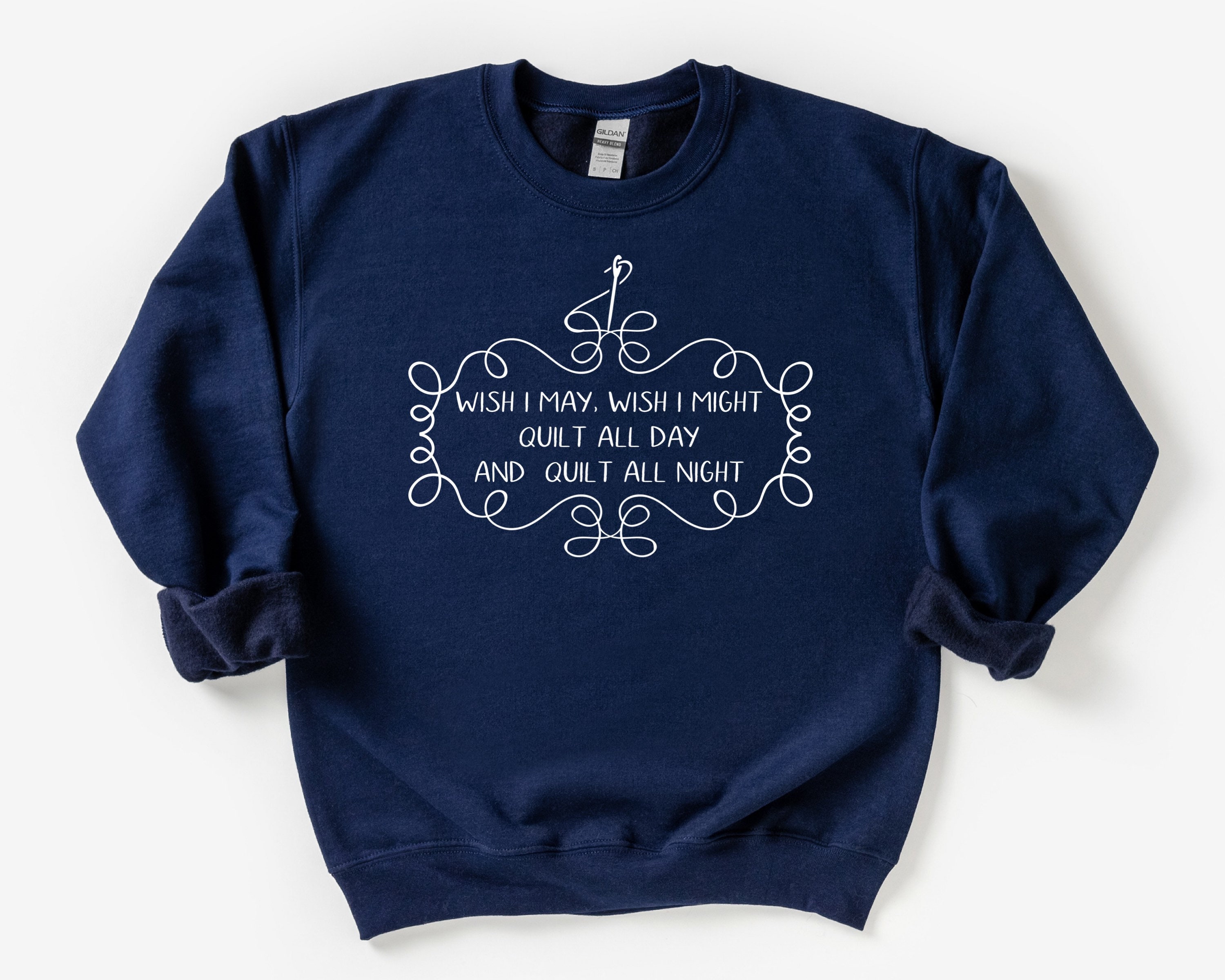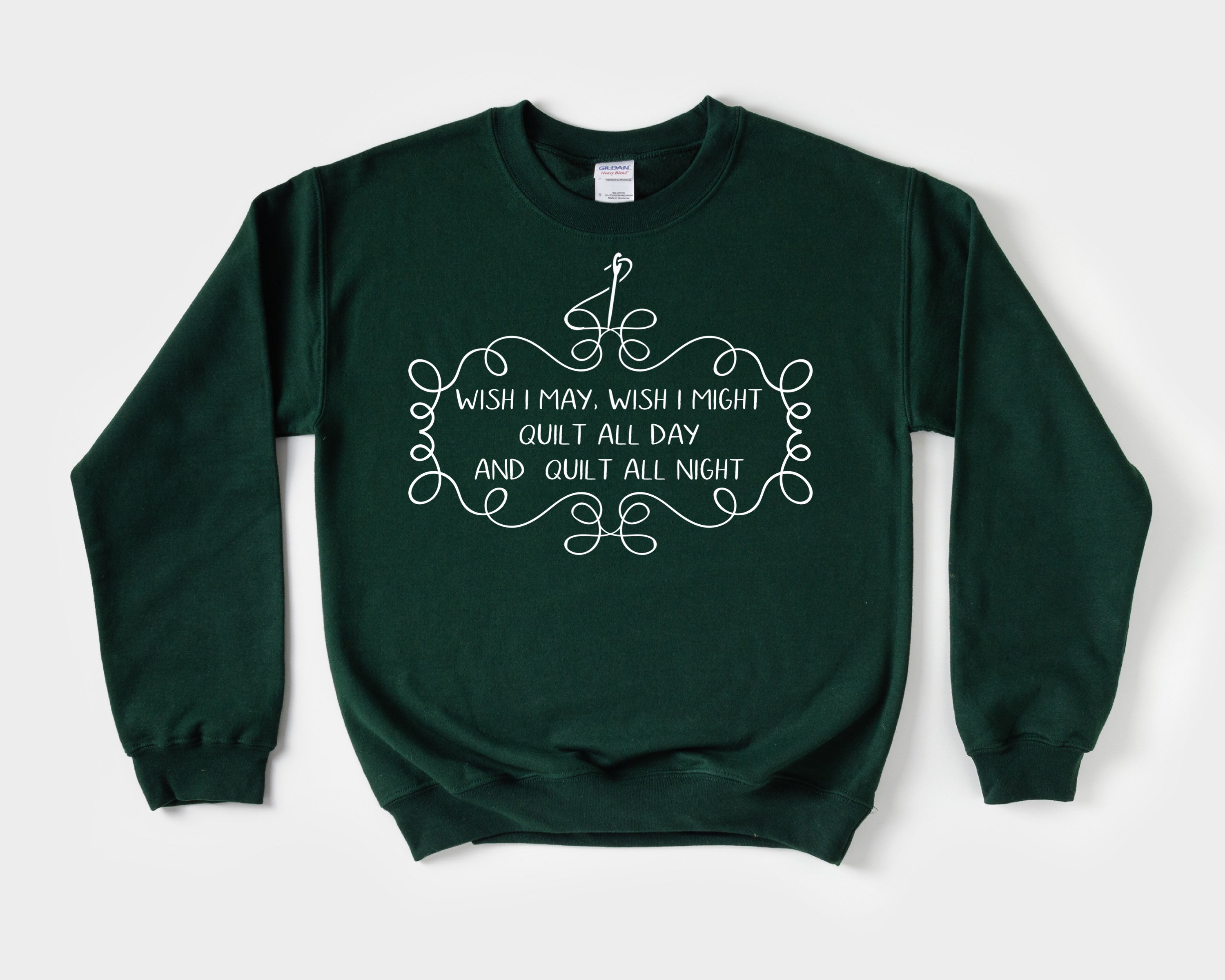 Funny quilter unisex soft cotton sweatshirt with white text. The text reads “Wish I may, wish I might, Quilt all day, and quilt all night.” This soft sweatshirt would be a great Christmas gift for your friend who loves to quilt. Or buy it for yourself to wear while you work your sewing machine!
