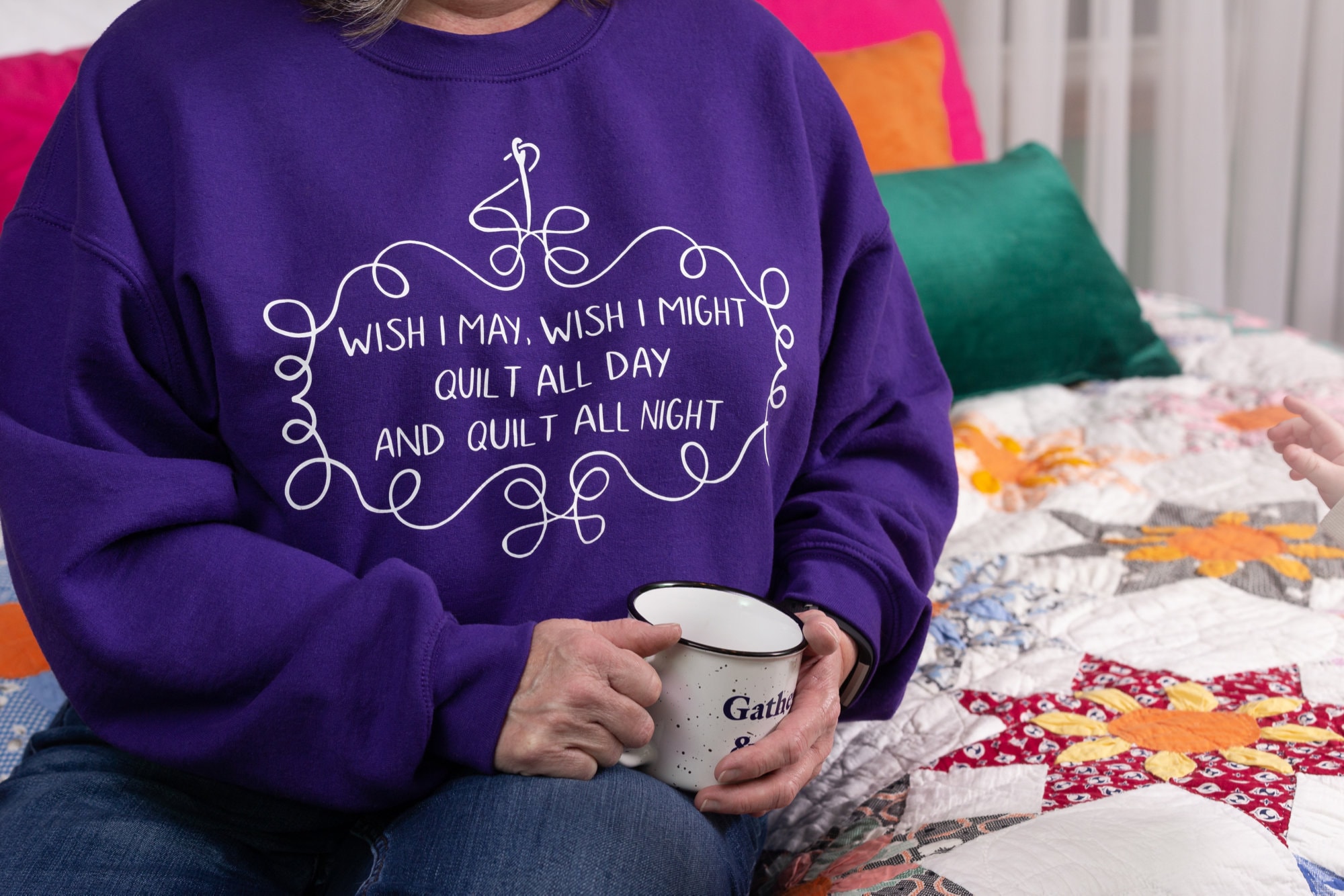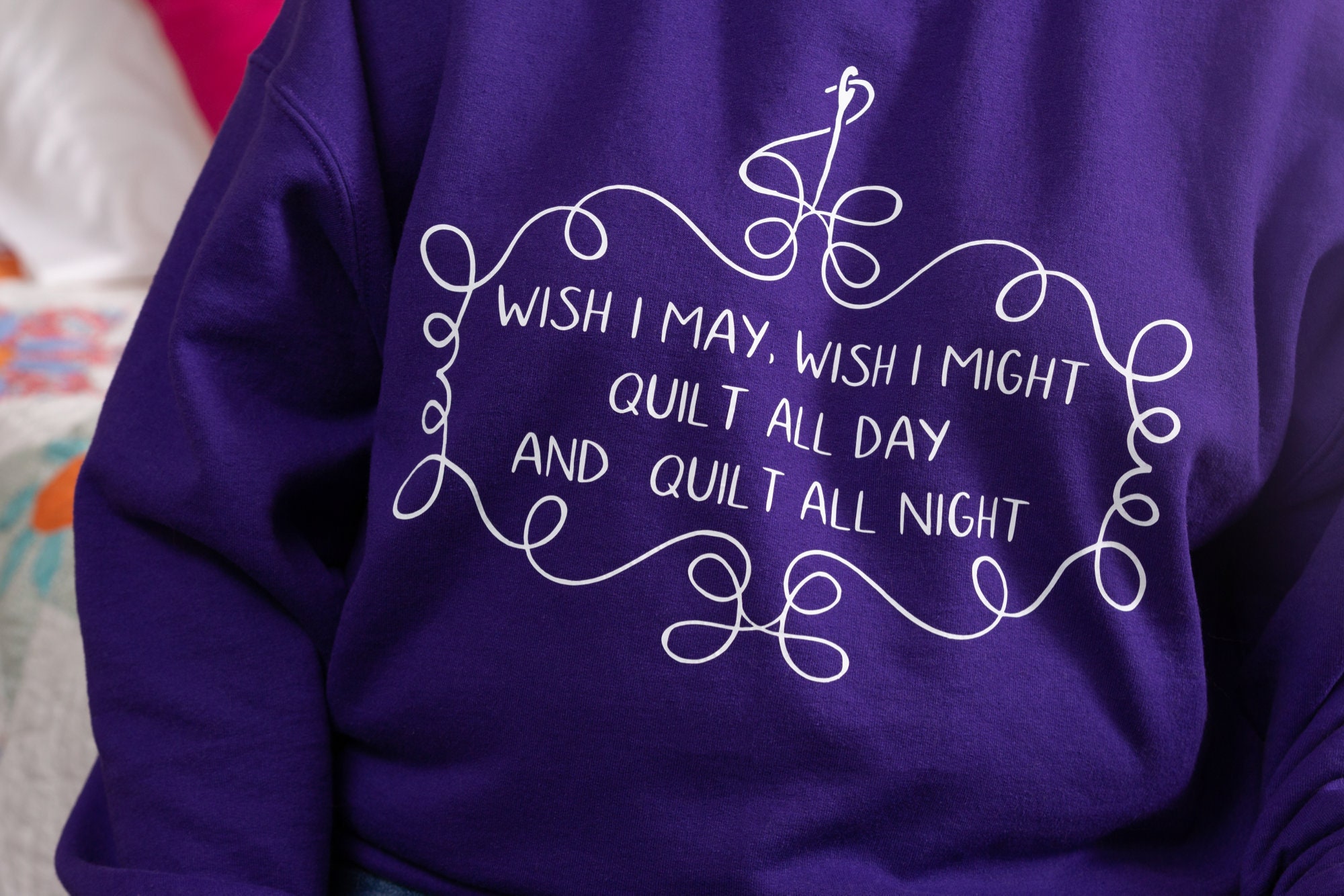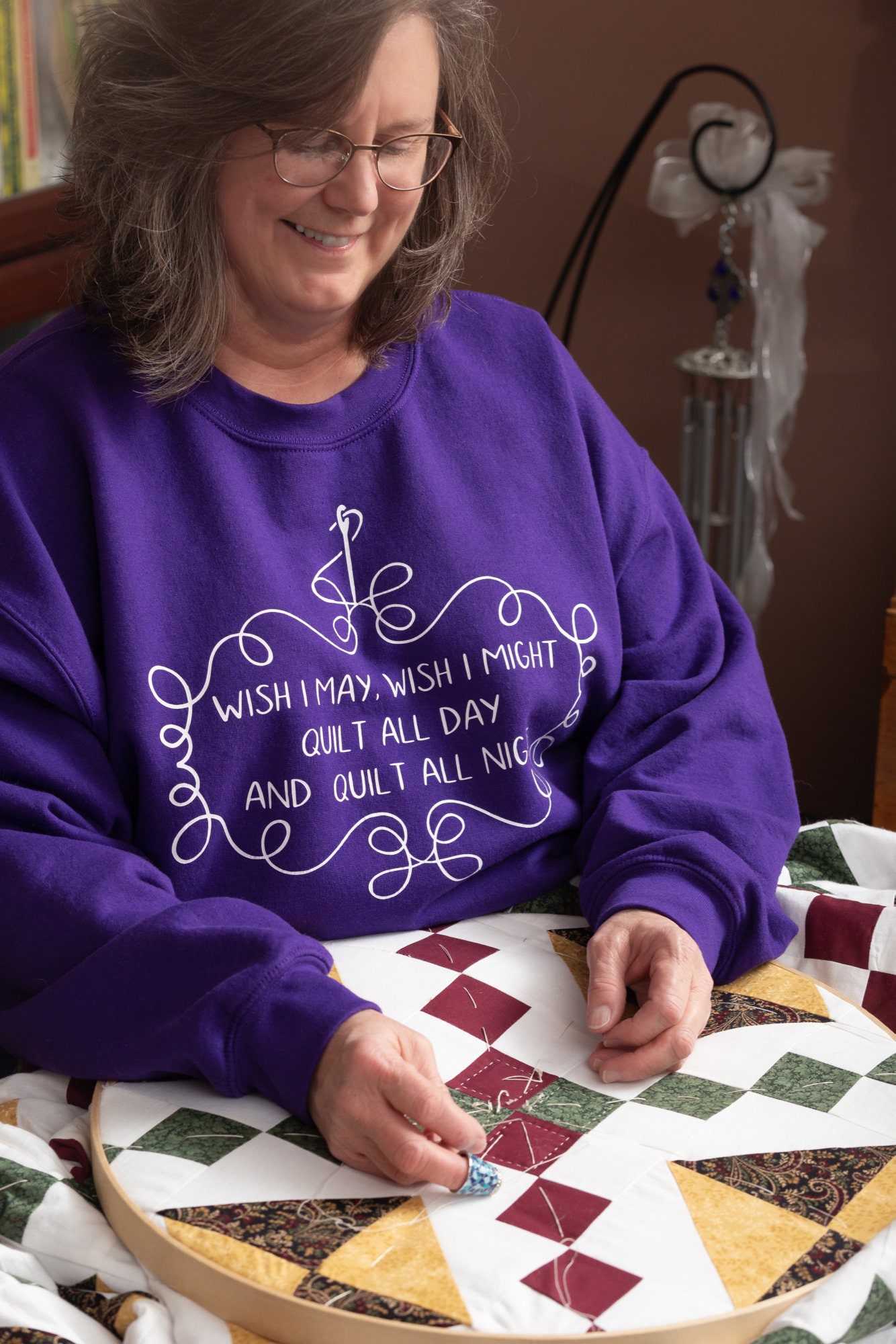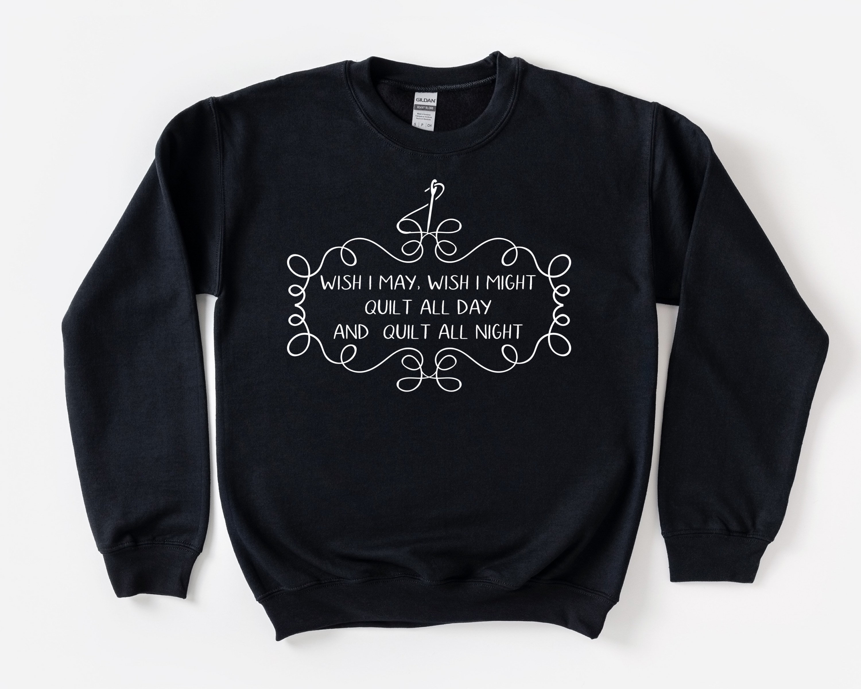 Funny quilter unisex soft cotton sweatshirt with white text. The text reads “Wish I may, wish I might, Quilt all day, and quilt all night.” This soft sweatshirt would be a great Christmas gift for your friend who loves to quilt. Or buy it for yourself to wear while you work your sewing machine!