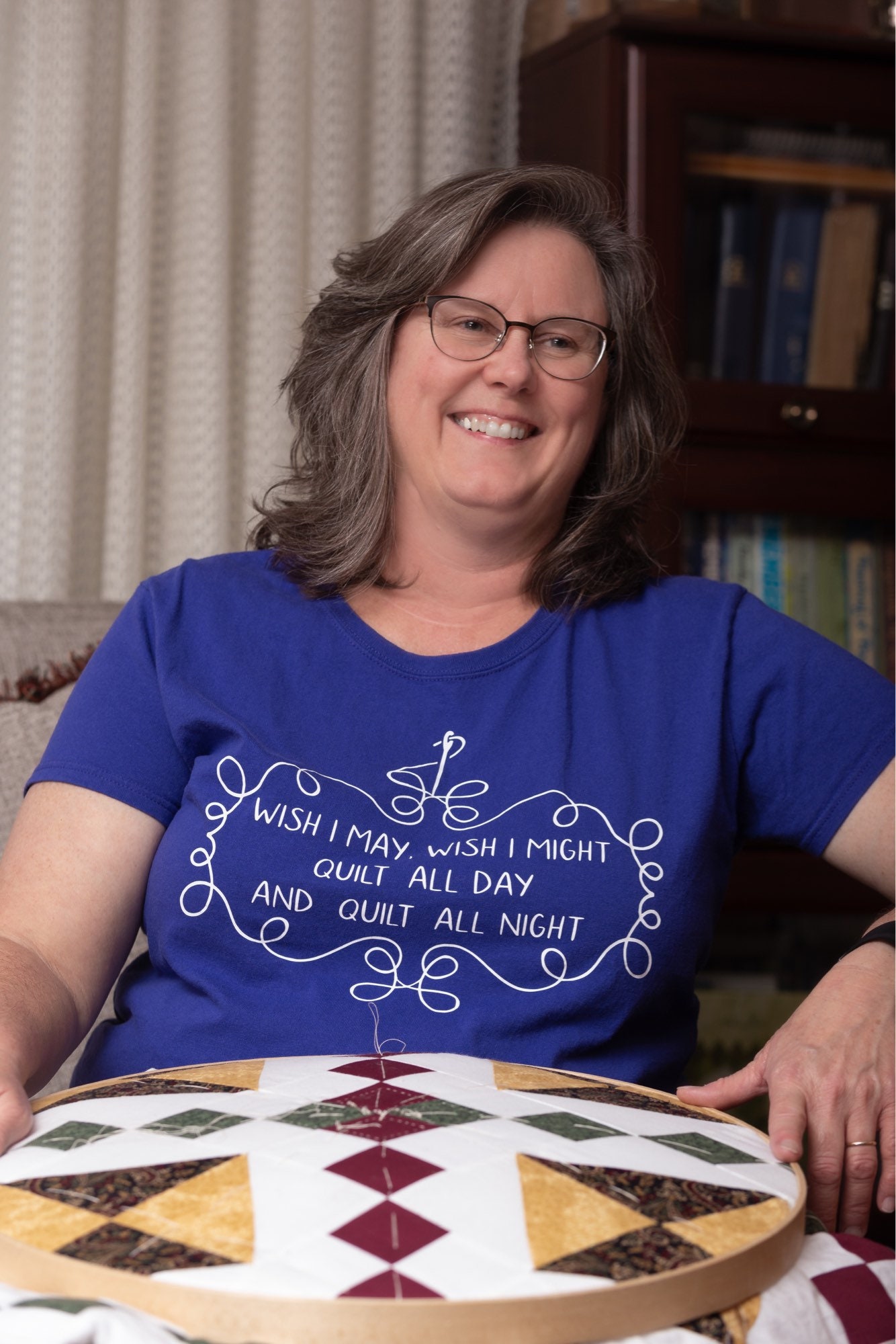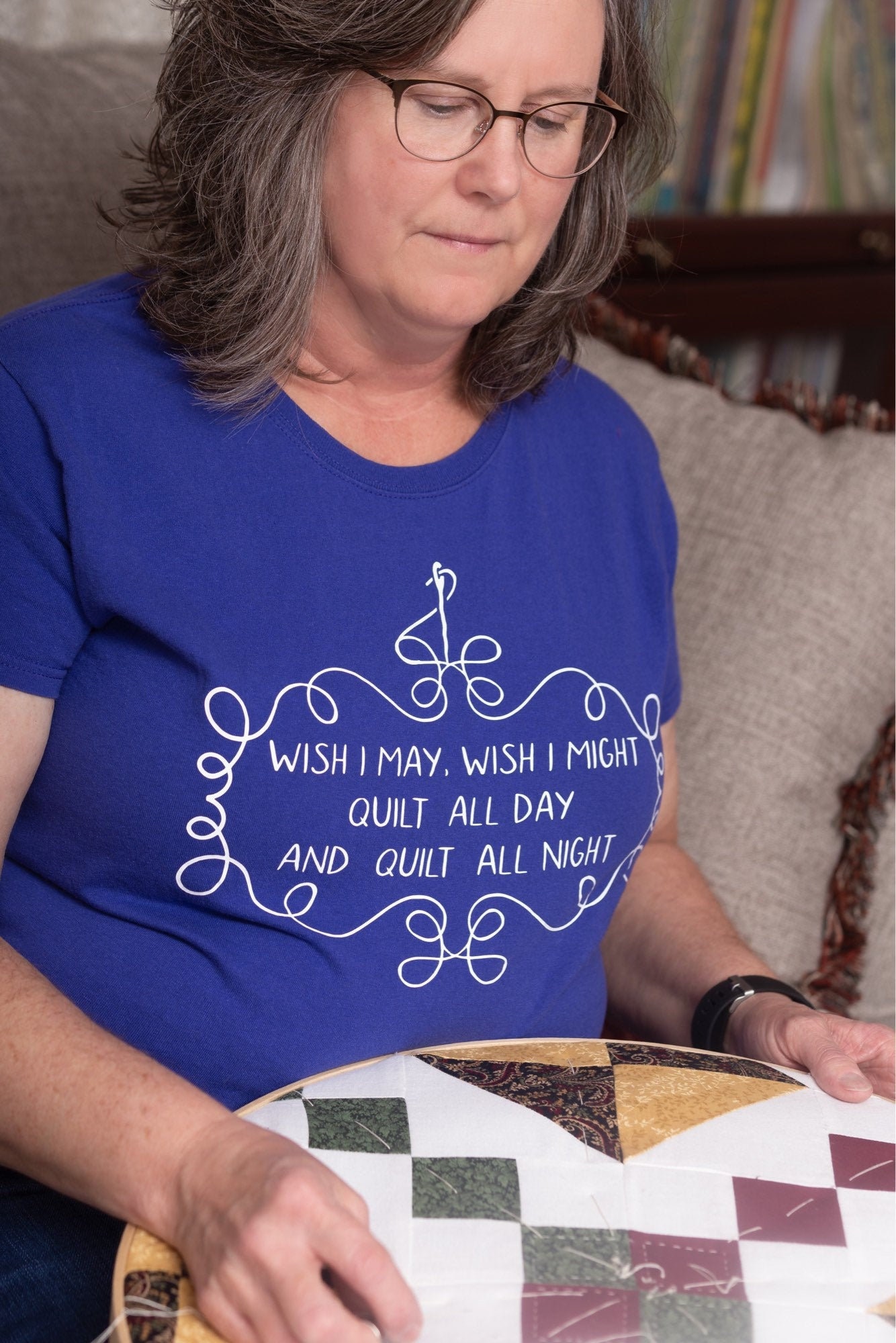 Funny Quilter unisex tee or ladies cut tee with a black or white vinyl design (see listing photos for a color chart). The design reads Wish I may, Wish I might, Quilt all day and Quilt all night. Perfect for your quilting self, mom, or grandma!